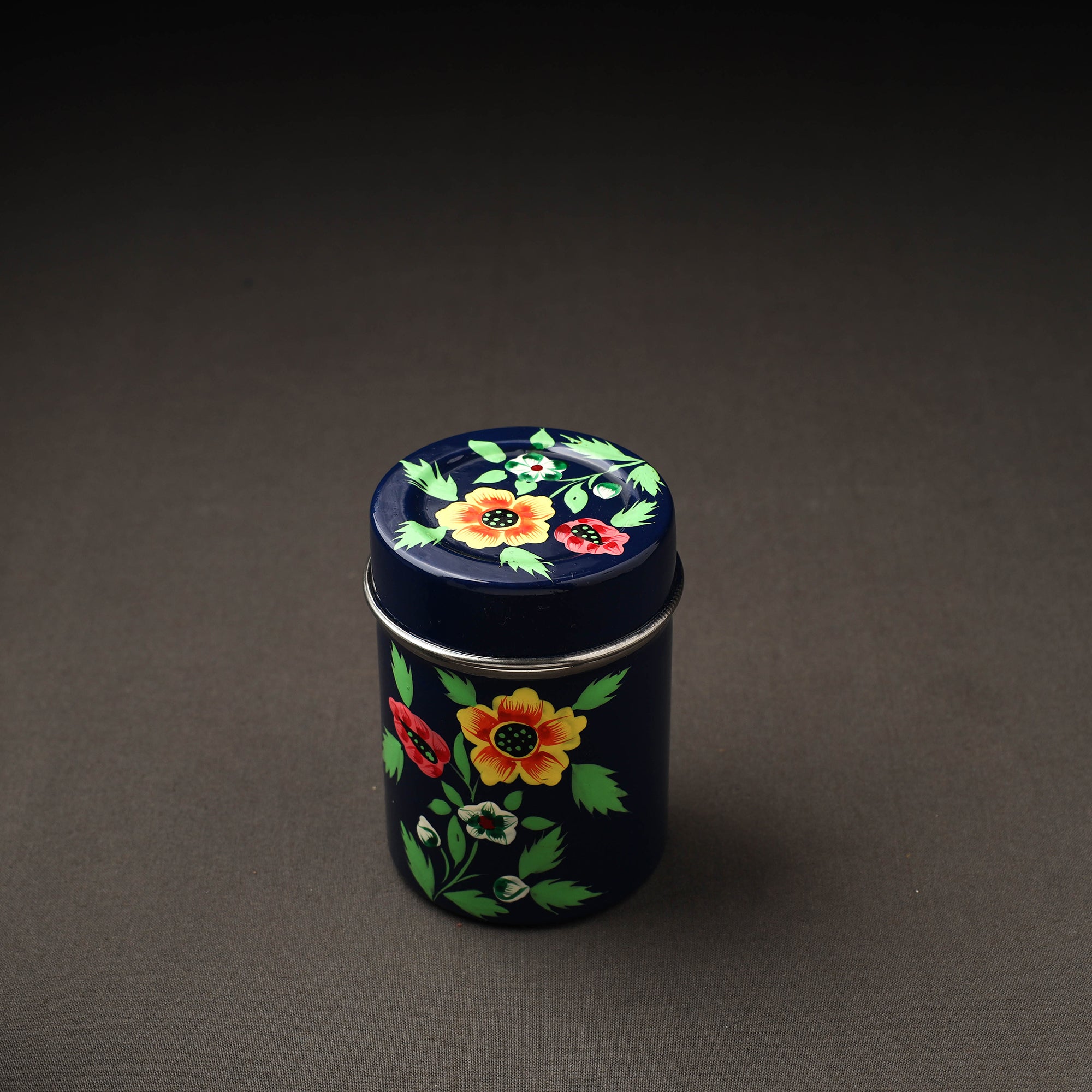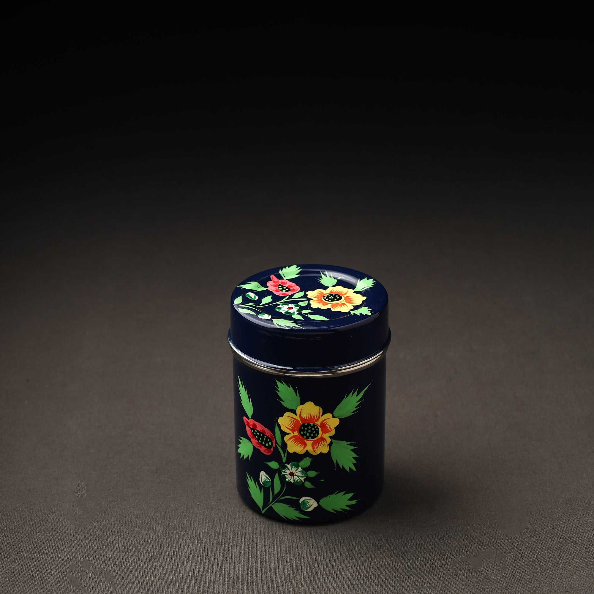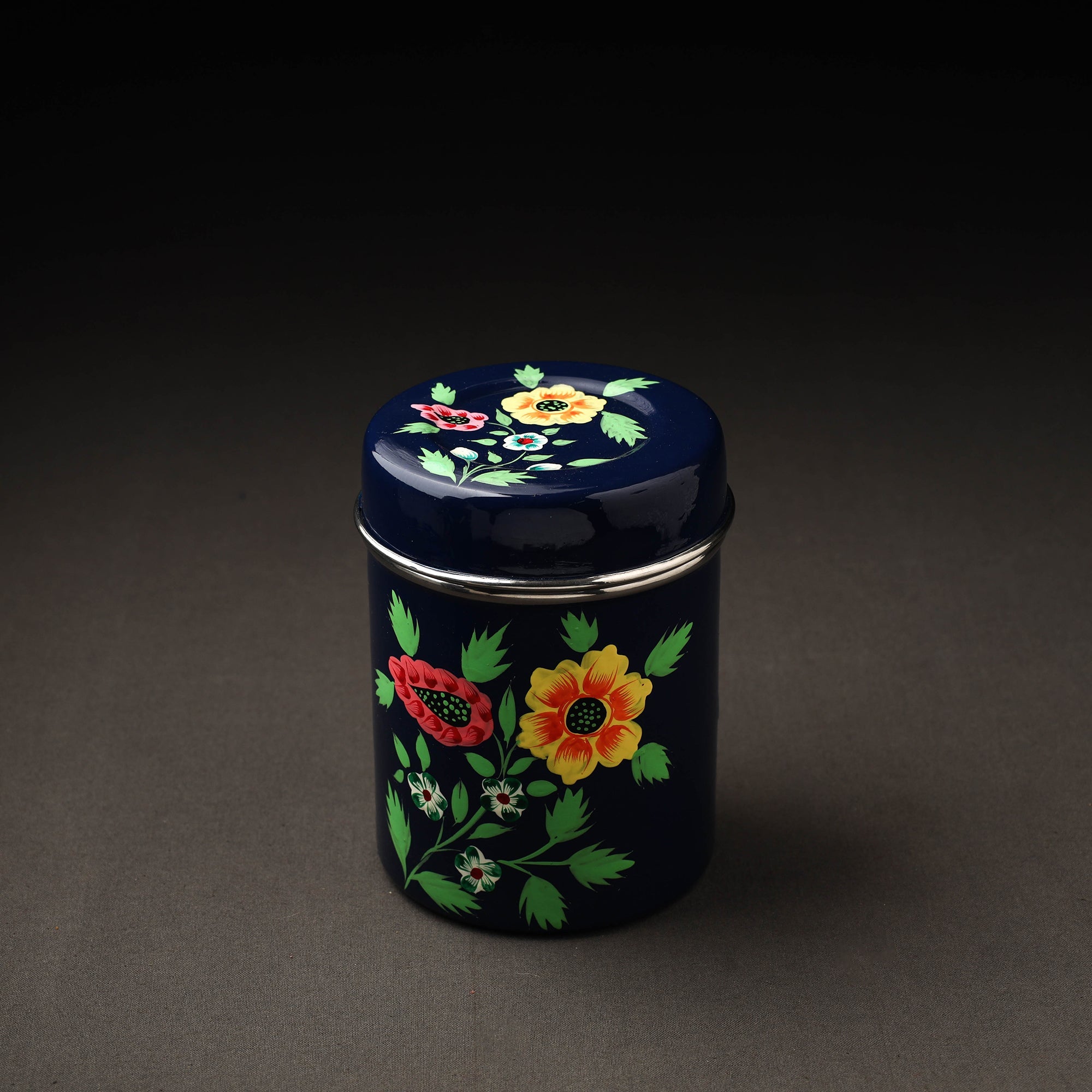 Floral design blue handpainted canisters with waterproof oil based paint on very high-quality stainless steel by the artisans of Kashmir. These canisters are used for storing tea, coffee, sugar, or anything else in the kitchen you need to keep the air tight.