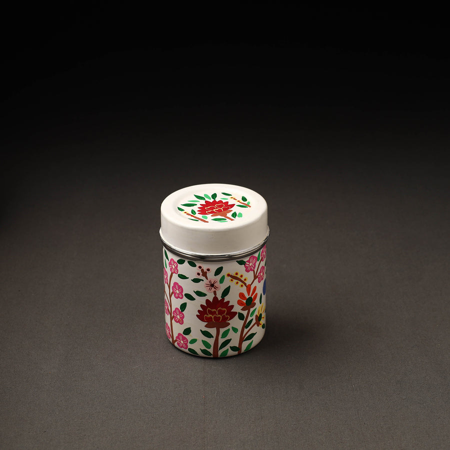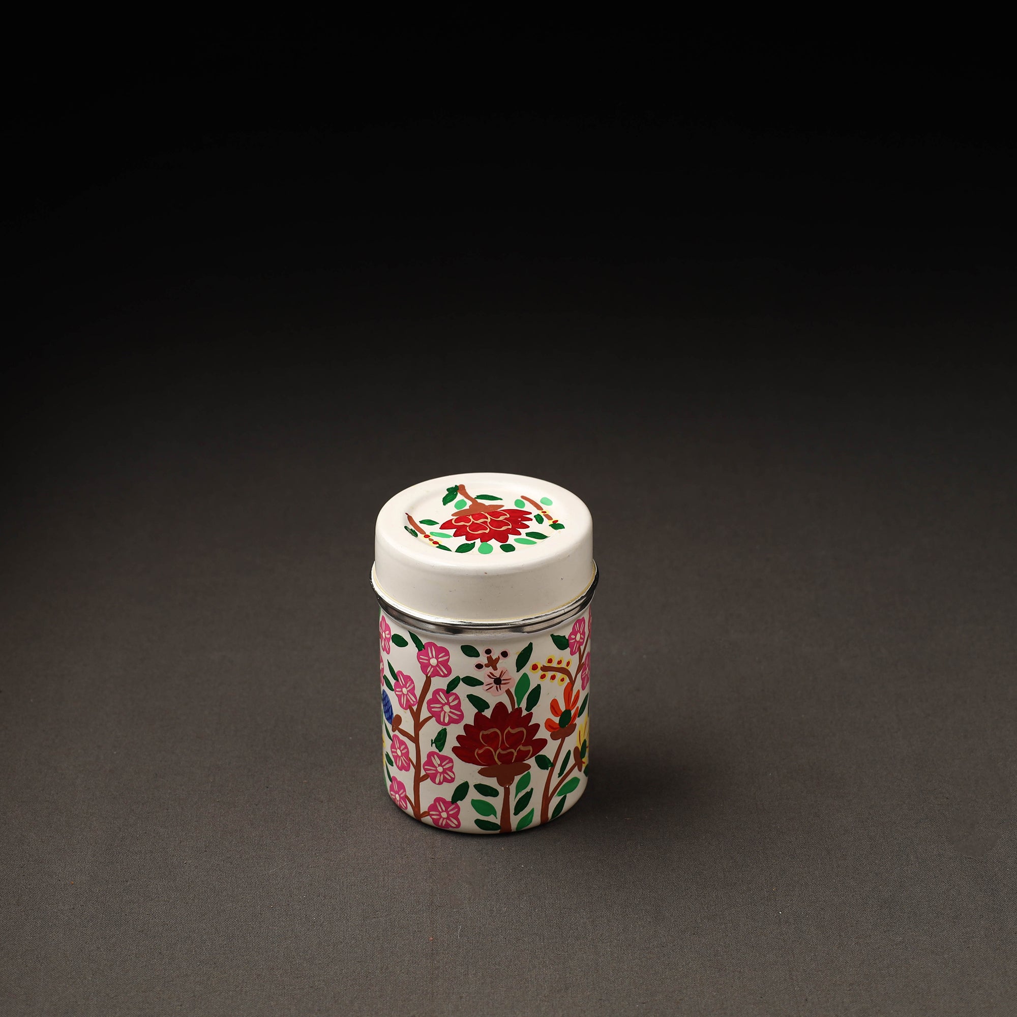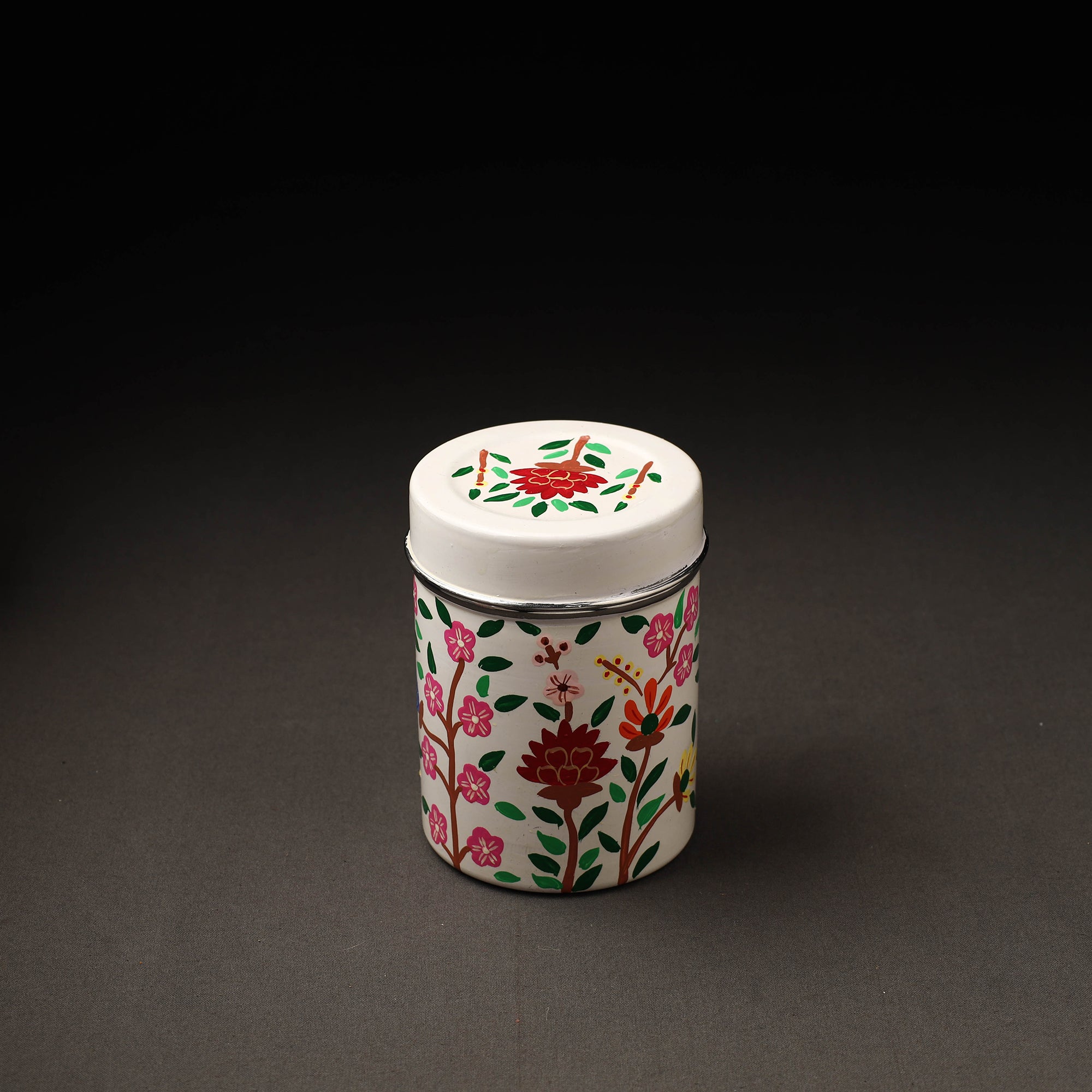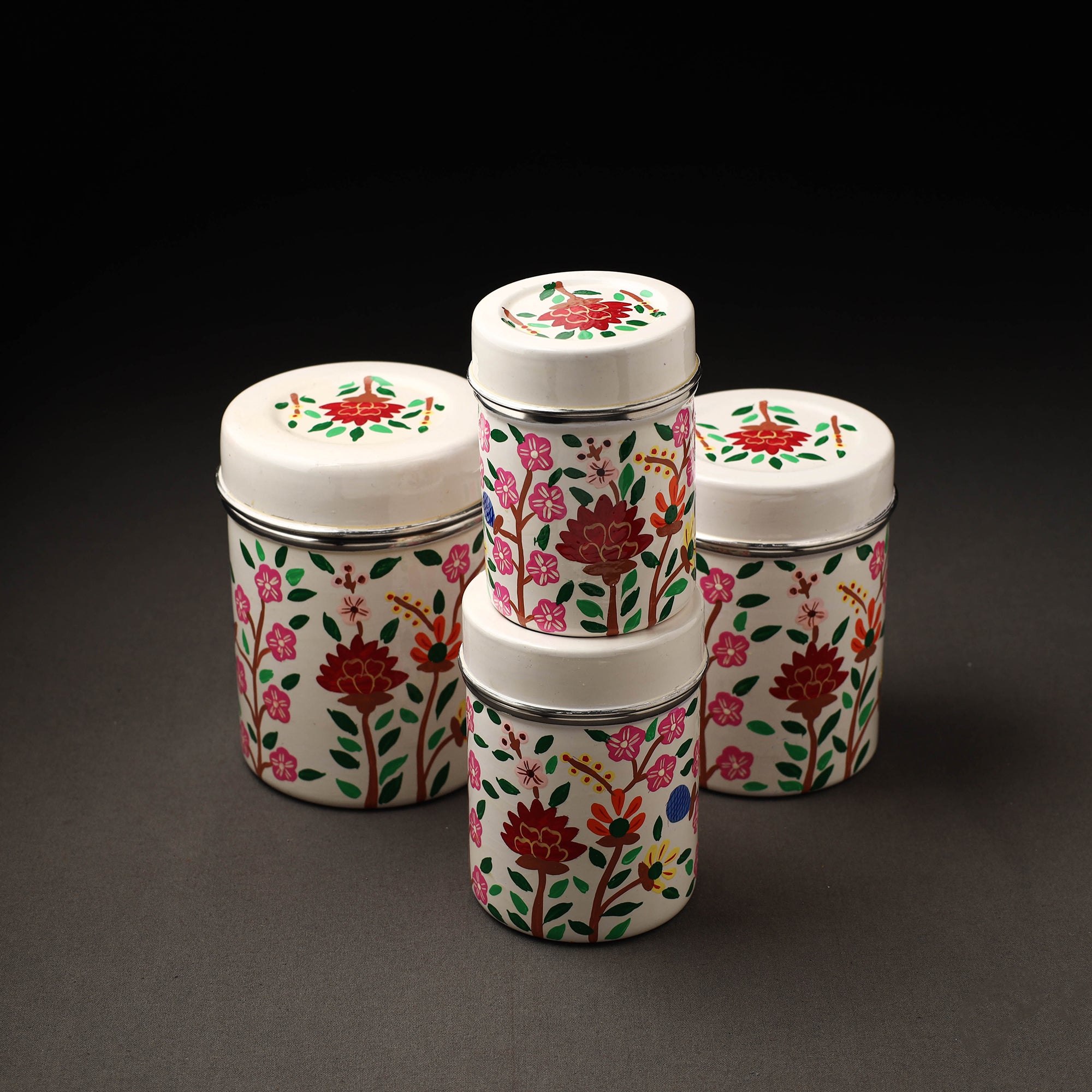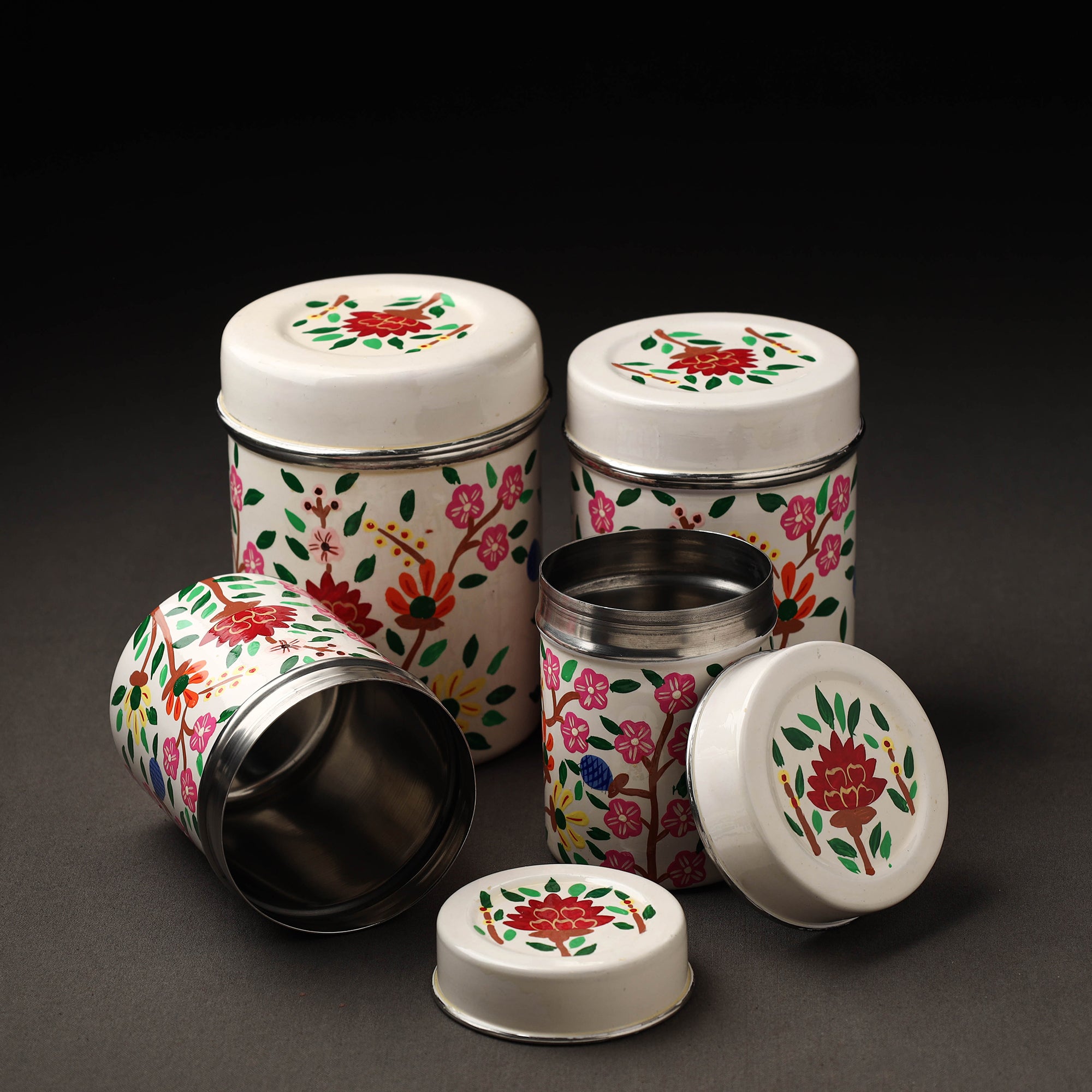 Floral design white handpainted canisters with waterproof oil based paint on very high-quality stainless steel by the artisans of Kashmir. These canisters are used for storing tea, coffee, sugar, or anything else in the kitchen you need to keep the air tight.