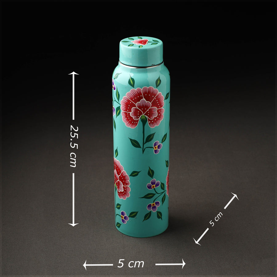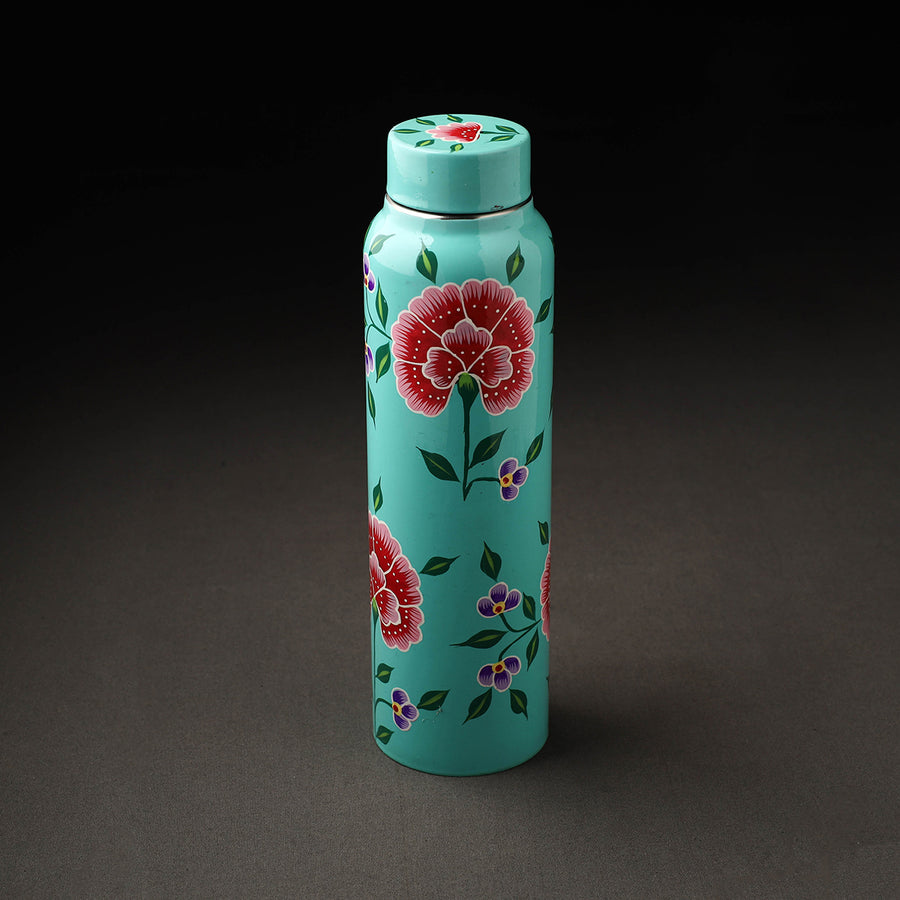 Floral design green handpainted water bottle with waterproof oil-based paint on very high-quality stainless steel by the artisans of Kashmir. This bottle can also be taken to the gym, yoga class, or office, which will make you the attraction, and you can also gift it to any art lover.