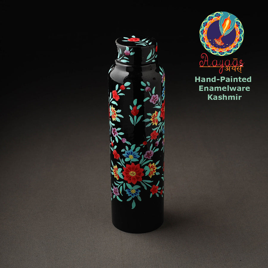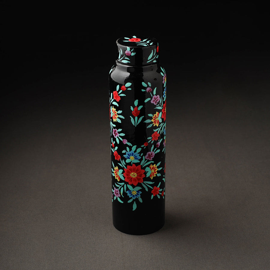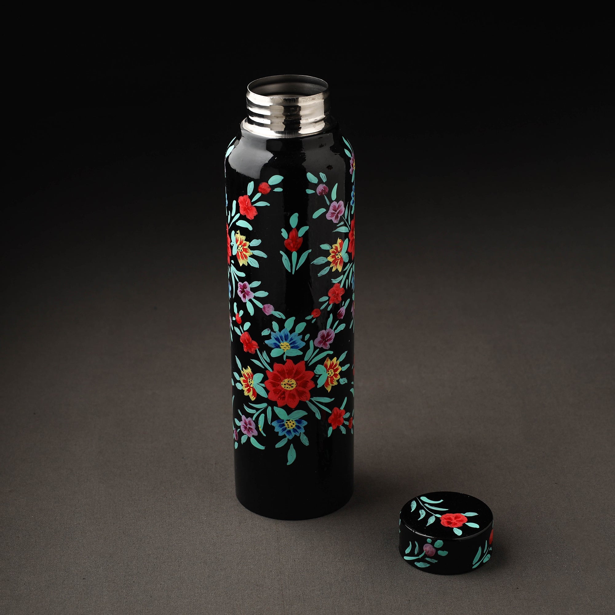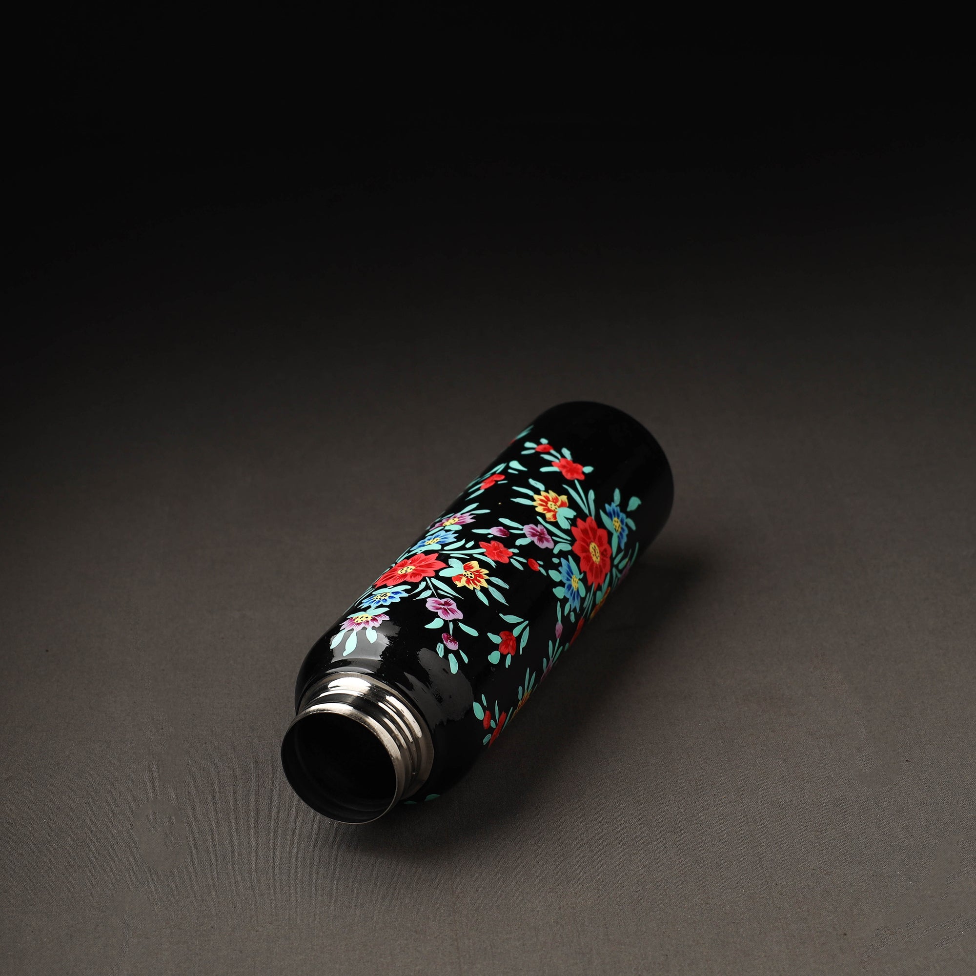 Floral design black handpainted water bottle with waterproof oil-based paint on very high-quality stainless steel by the artisans of Kashmir. This bottle can also be taken to the gym, yoga class, or office, which will make you the attraction, and you can also gift it to any art lover.