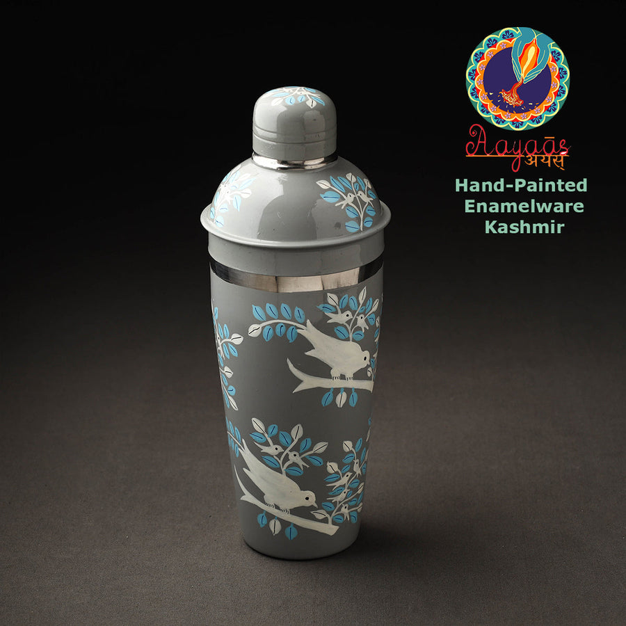 Floral design grey handpainted cocktail shaker with waterproof oil-based paint on very high-quality stainless steel by the artisans of Kashmir. This cocktail shaker can also use easy to mix professional level cocktails with fun; ideal choice for home bar.
