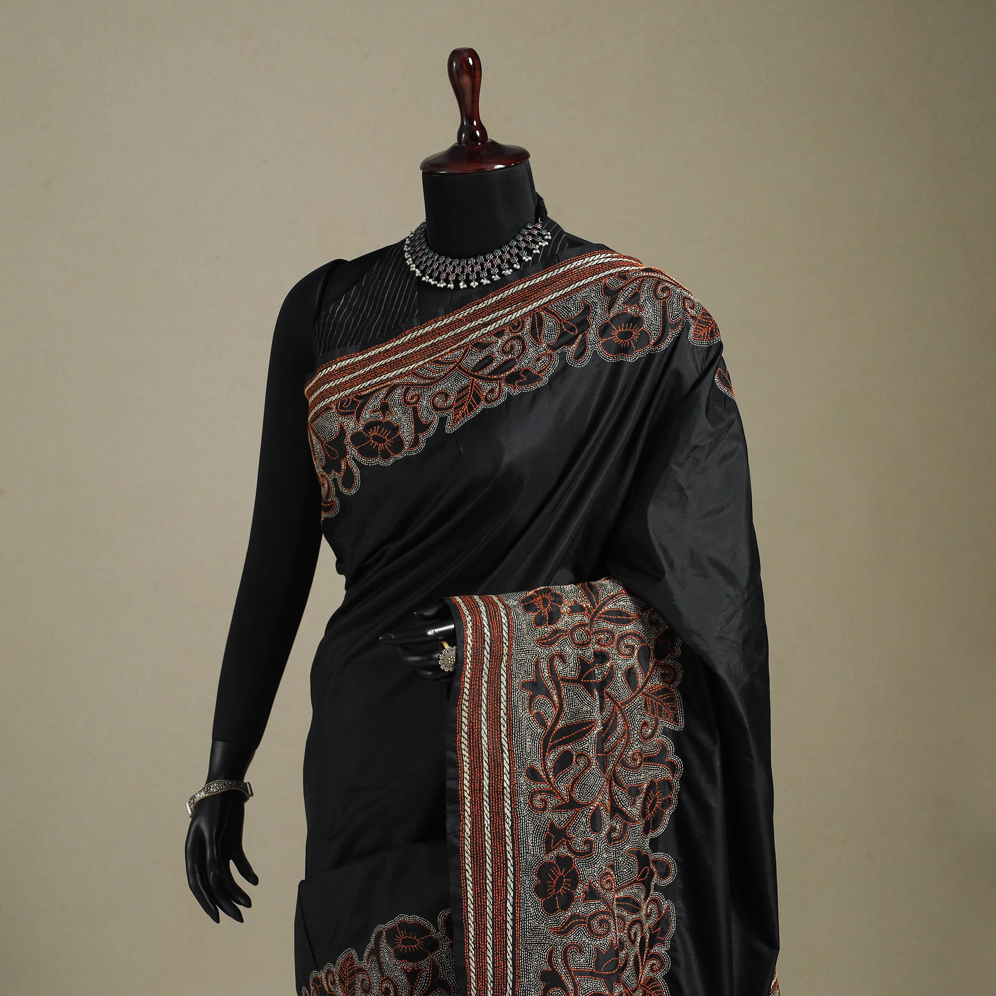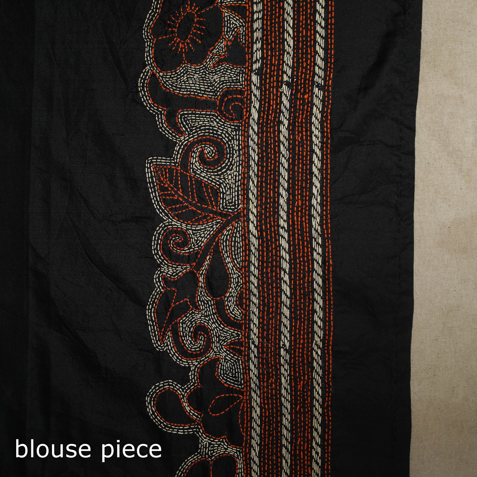 Fine quality handloom pure bangalore silk saree with intricate kantha work done by master artisan Alima Khatun from Bolpur, West Bengal. This exquisite saree is designed with contemporary patterns and has been hand-embroidered using West Bengal's traditional craft technique of Kantha. She has been doing Kantha at home since the age of 14. She is the recipient of many awards, she won the National Award for excellence in kantha work in 1988. She is training around two thousand girls under a government scheme. Bangalore silk is known for its simplicity, purity, and texture, which is meticulously produced in the silk farms of Bangalore, Karnataka.