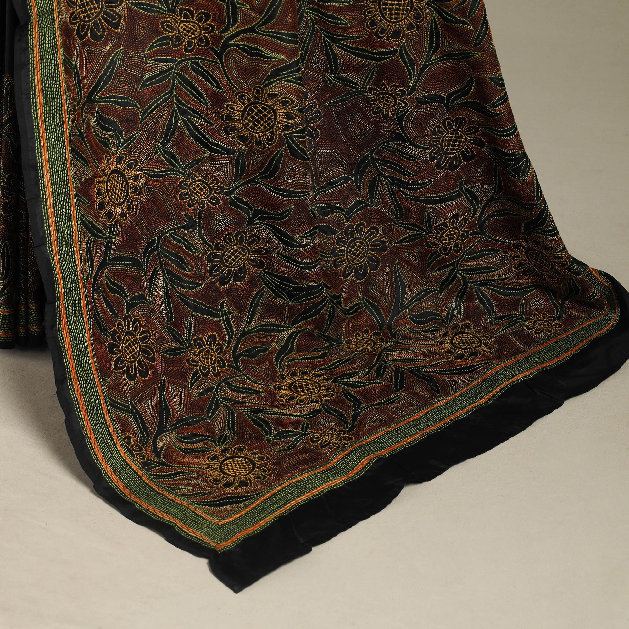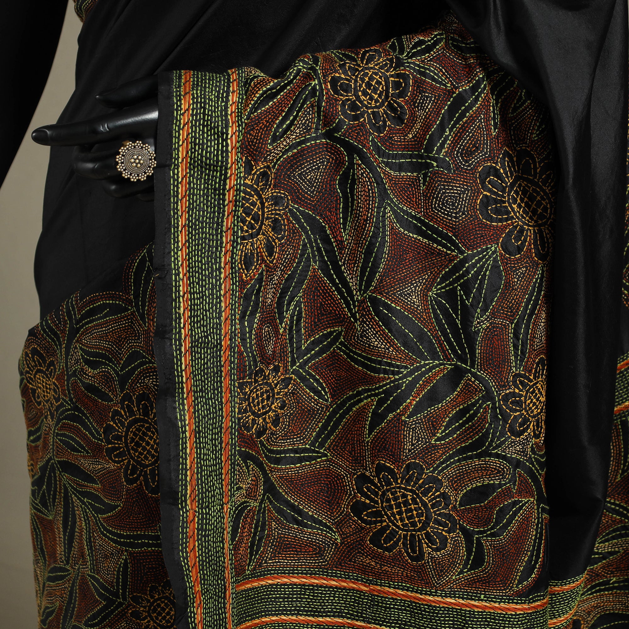 Fine quality black handloom pure bangalore silk saree with intricate kantha work done by master artisan Alima Khatun from Bolpur, West Bengal. This exquisite saree is designed with contemporary patterns and has been hand-embroidered using West Bengal's traditional craft technique of Kantha. She has been doing Kantha at home since the age of 14. She is the recipient of many awards, she won the National Award for excellence in kantha work in 1988. She is training around two thousand girls under a government scheme. Bangalore silk is known for its simplicity, purity, and texture, which is meticulously produced in the silk farms of Bangalore, Karnataka.