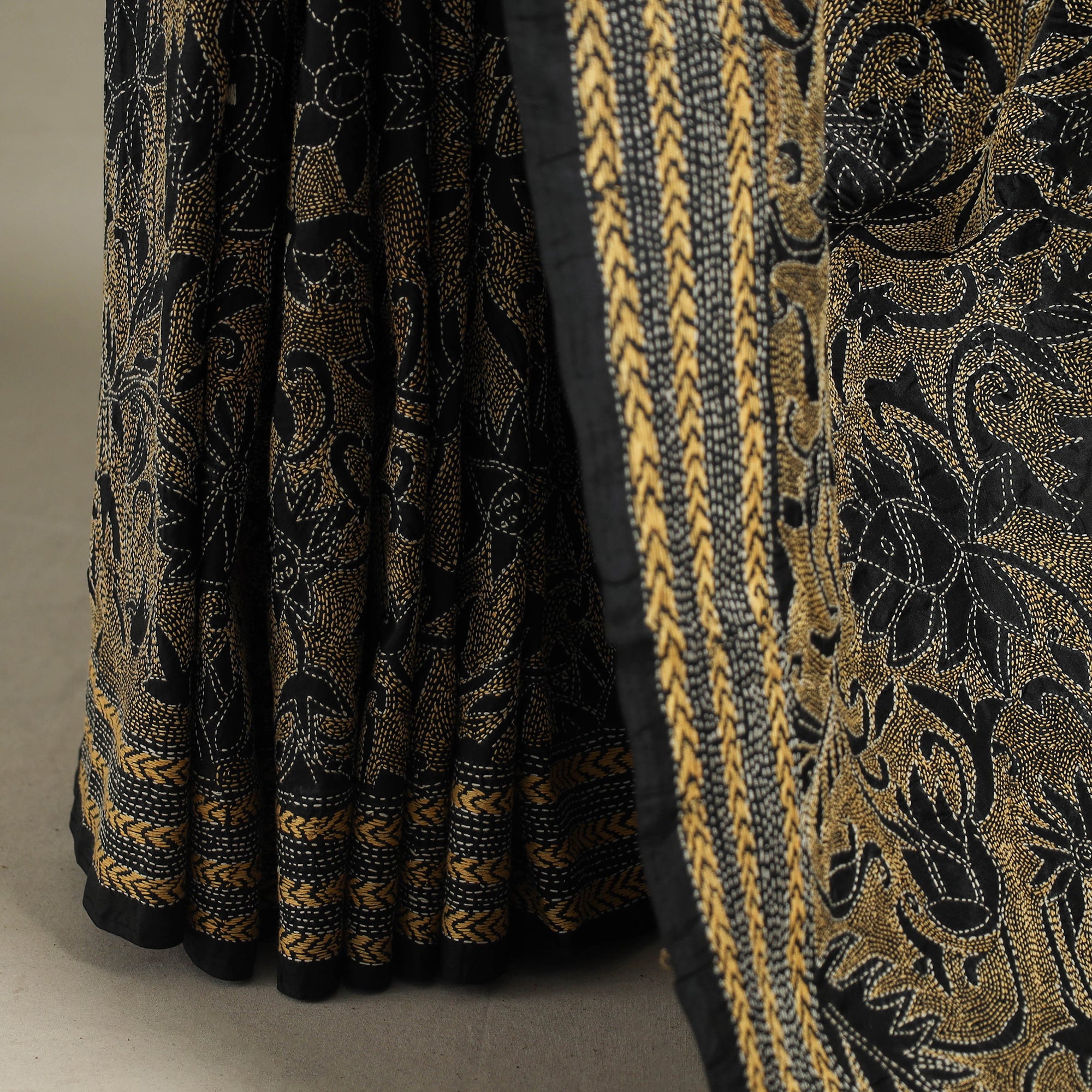 Fine quality black handloom pure bangalore silk saree with intricate kantha work done by master artisan Alima Khatun from Bolpur, West Bengal. This exquisite saree is designed with contemporary patterns and has been hand-embroidered using West Bengal's traditional craft technique of Kantha. She has been doing Kantha at home since the age of 14. She is the recipient of many awards, she won the National Award for excellence in kantha work in 1988. She is training around two thousand girls under a government scheme. Bangalore silk is known for its simplicity, purity, and texture, which is meticulously produced in the silk farms of Bangalore, Karnataka.