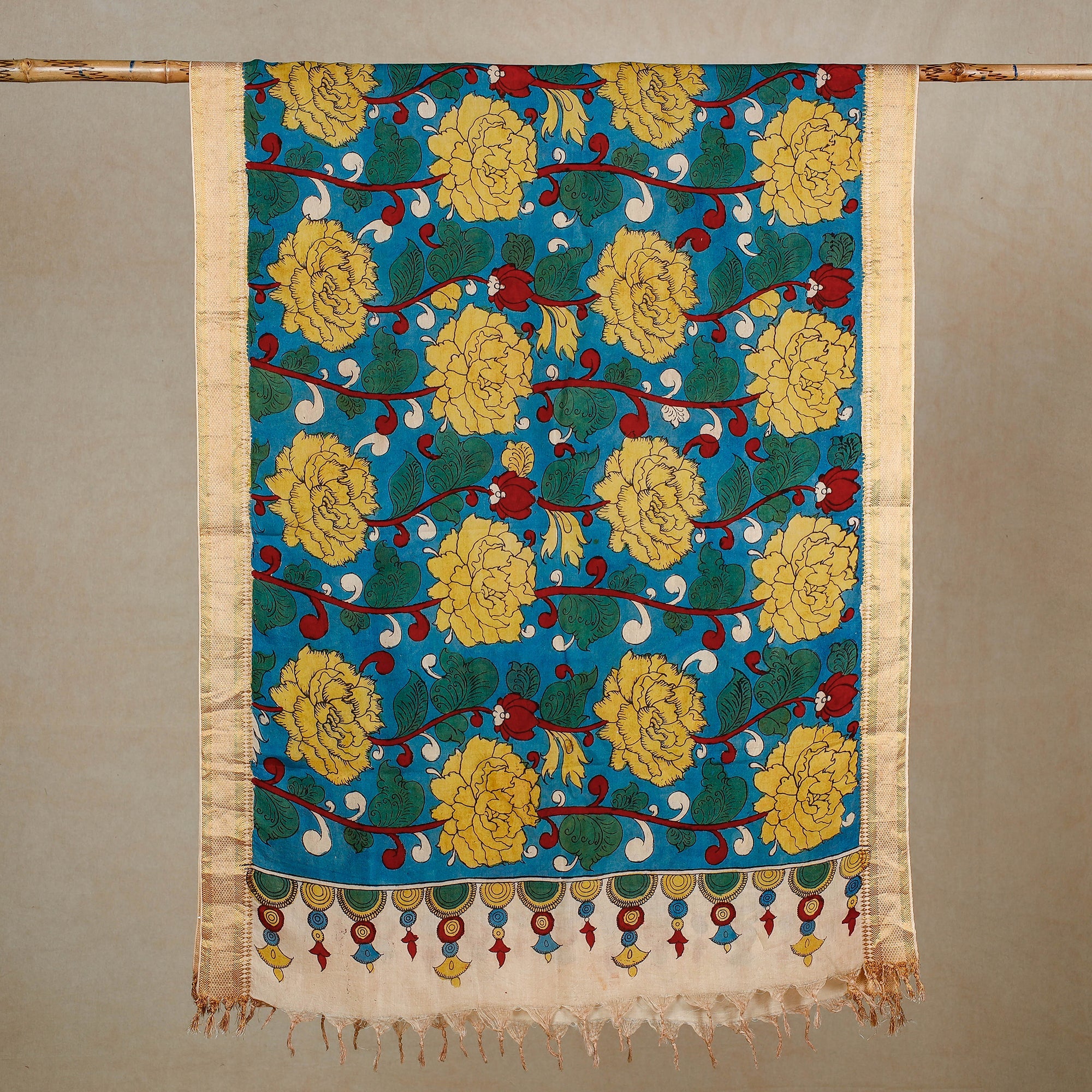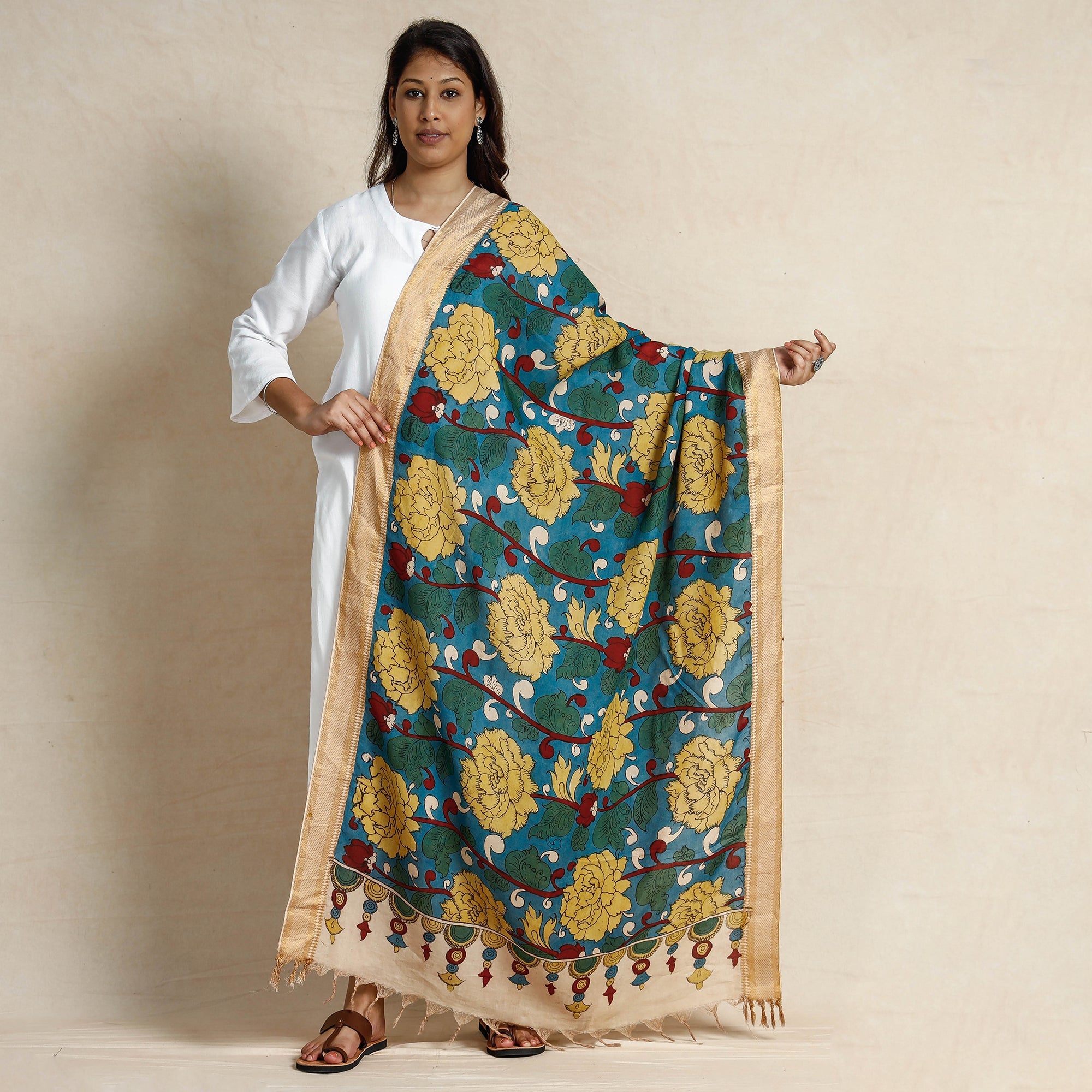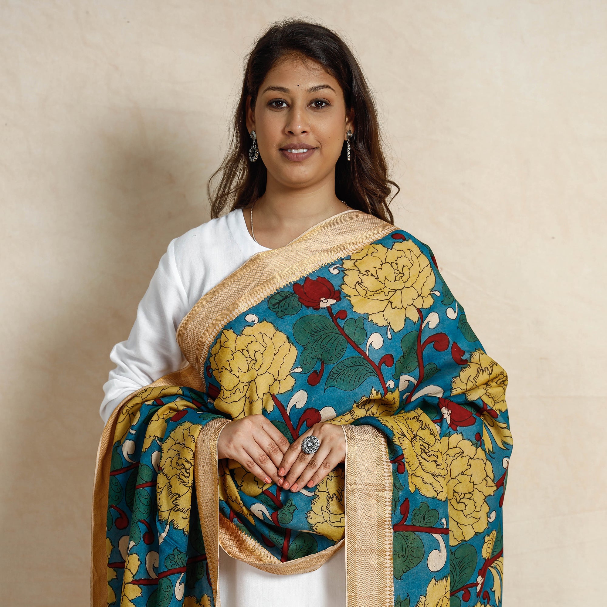 Fine quality blue srikalahasti pen work kalamkari silk cotton handpainted zari border dupatta with tassels. This exquisite dupatta is created in the srikalahasti style of kalamkari, wherein the "kalam" or pen is used for free-hand drawing of the subject and filling in the colours. It is entirely hand worked using natural colours. Kalamkari in srikalahasti has been around for approximately 200 years. Unlike other places where this particular craft is practised, artists in srikalahasti retain the ancient techniques of dyeing that have been passed down through generations. As it is hand-painted/handcrafted, colour spread and irregularities in design are common; hence, it won't be considered damaged or defective.