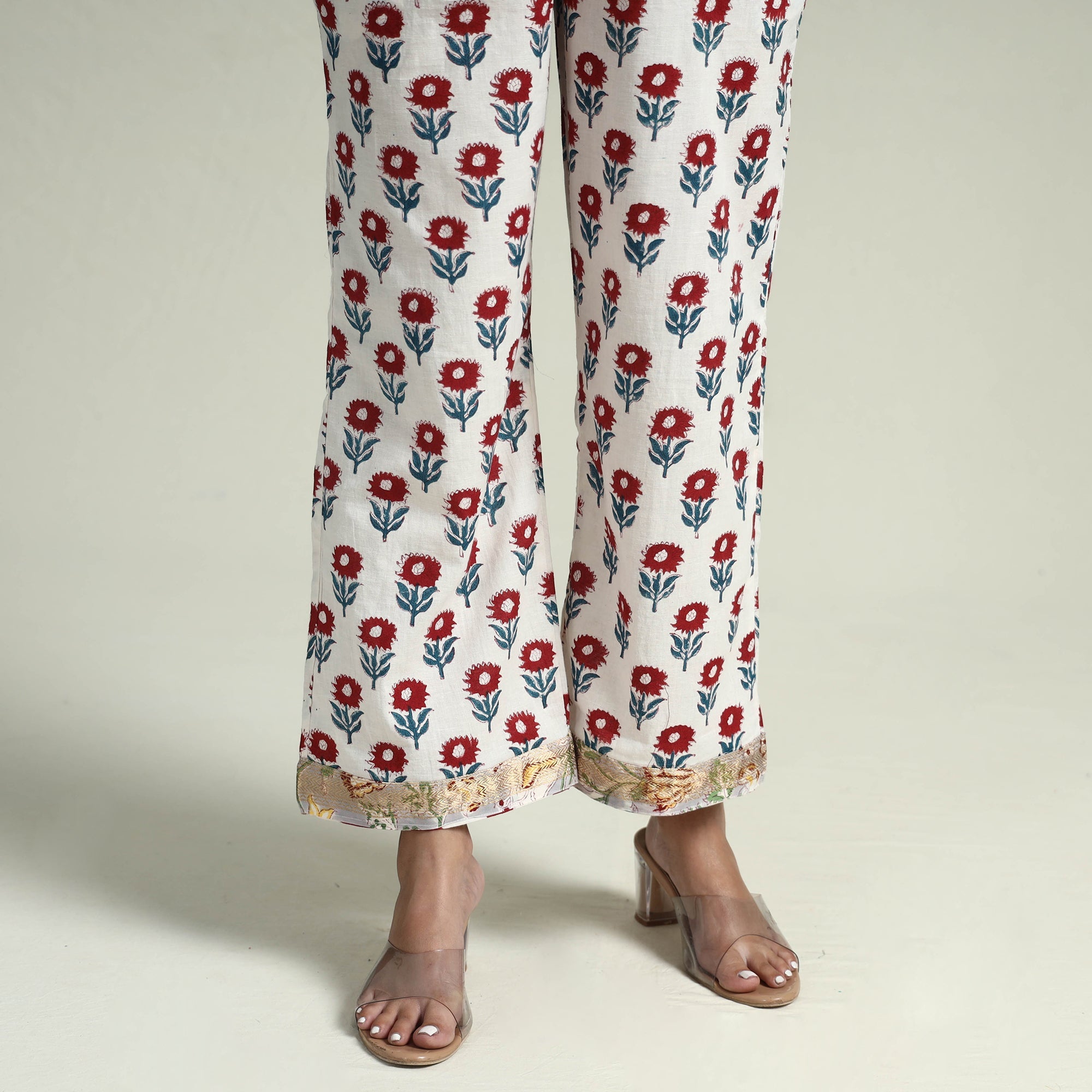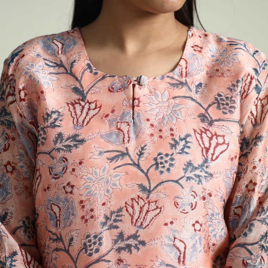 Embrace the elegance of handcrafted beauty with our sanganeri hand block printed maheshwari silk long kurta with palazzo & dupatta set. This suit set includes a maheshwari silk kurta, cotton palazzo with maheshwari silk zari border dupatta. The kurta also features a convenient one-side pocket, perfect for carrying small essentials, and the palazzo features an elasticized waist and two side pockets, adding functionality to this palazzo. Perfect for special occasions and celebrations, this elegant suit exudes traditional charm with its hand-block printed motifs.