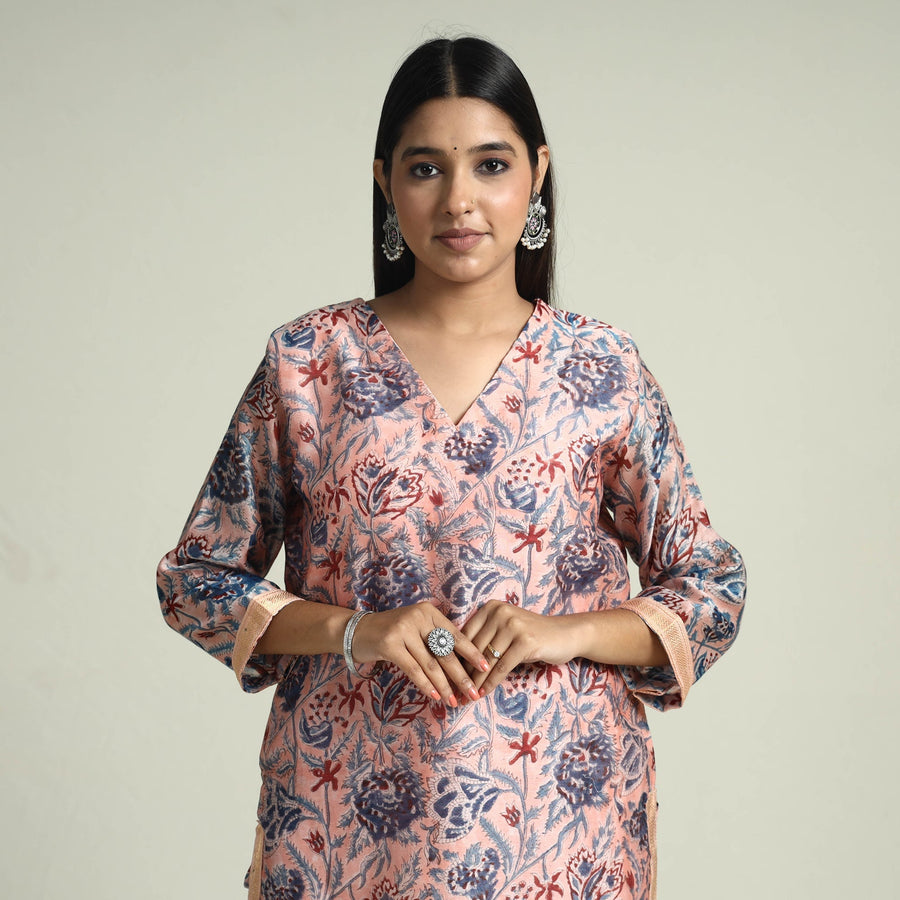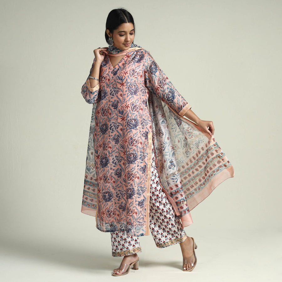 • Peach - Sanganeri Block Printed Maheshwari Silk Kurta with Palazzo & Dupatta Set