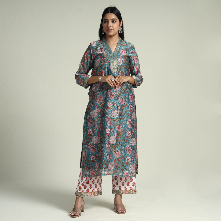 •  Sanganeri Block Printed Maheshwari Silk Kurta with Palazzo & Dupatta Set Online at iTokri.com