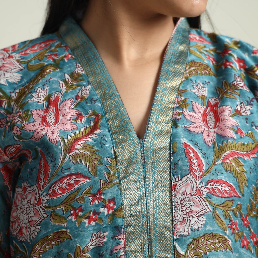 Material Embrace the elegance of handcrafted beauty with our sanganeri hand block printed maheshwari silk long Kurta with palazzo & dupatta set. This suit set includes a maheshwari silk Kurta, cotton palazzo with maheshwari silk zari border dupatta. The Kurta also features a convenient one-side pocket, perfect for carrying small essentials, and the palazzo features an elasticized waist and two side pockets, adding functionality to this palazzo. Perfect for special occasions and celebrations, this elegant suit exudes traditional charm with its hand-block printed motifs.