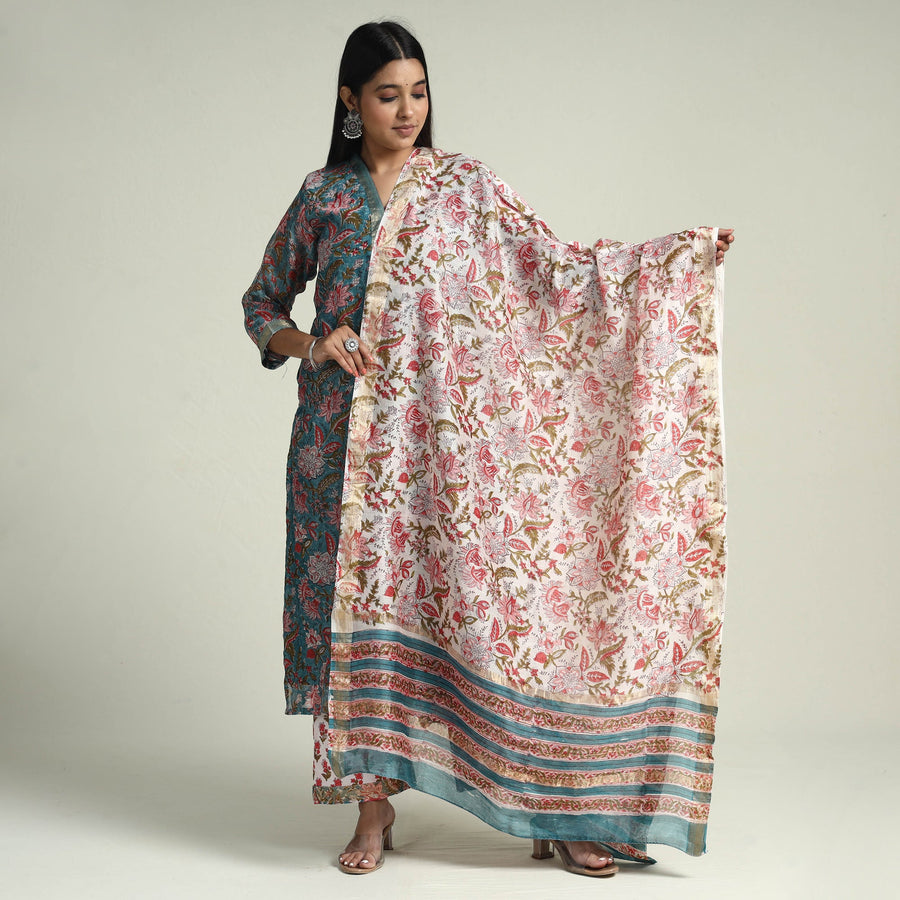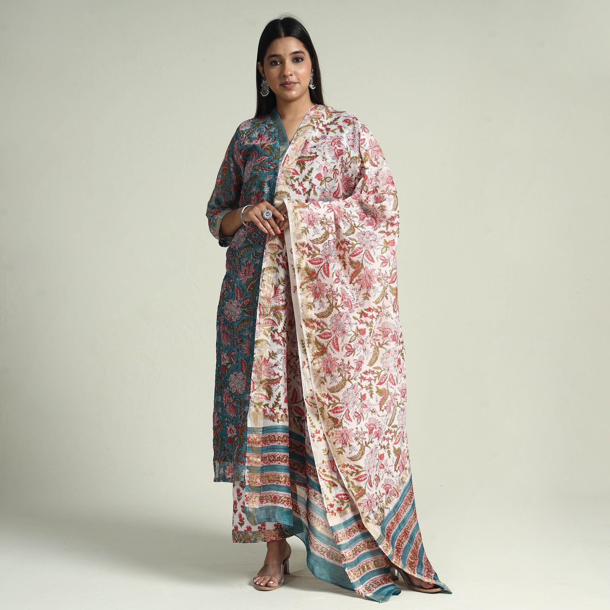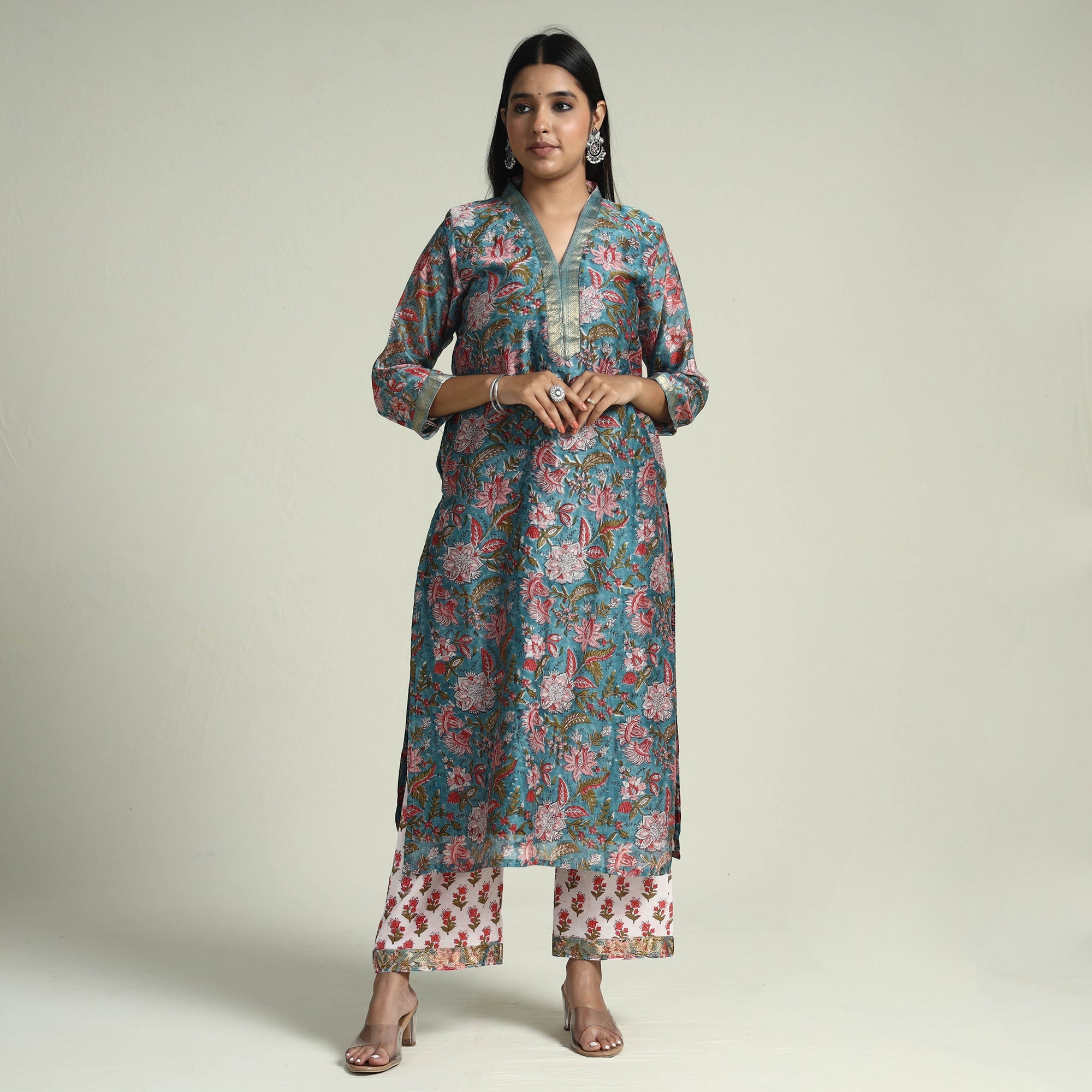 Embrace the elegance of handcrafted beauty with our sanganeri hand block printed maheshwari silk long Kurta with palazzo & dupatta set. This suit set includes a maheshwari silk Kurta, cotton palazzo with maheshwari silk zari border dupatta. The Kurta also features a convenient one-side pocket, perfect for carrying small essentials, and the palazzo features an elasticized waist and two side pockets, adding functionality to this palazzo. Perfect for special occasions and celebrations, this elegant suit exudes traditional charm with its hand-block printed motifs.