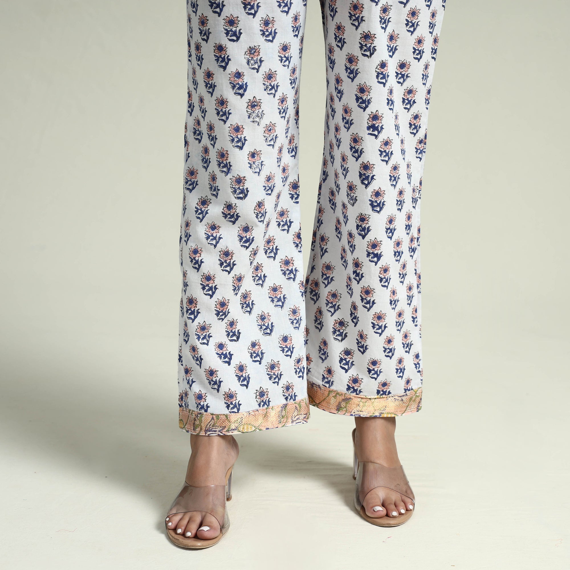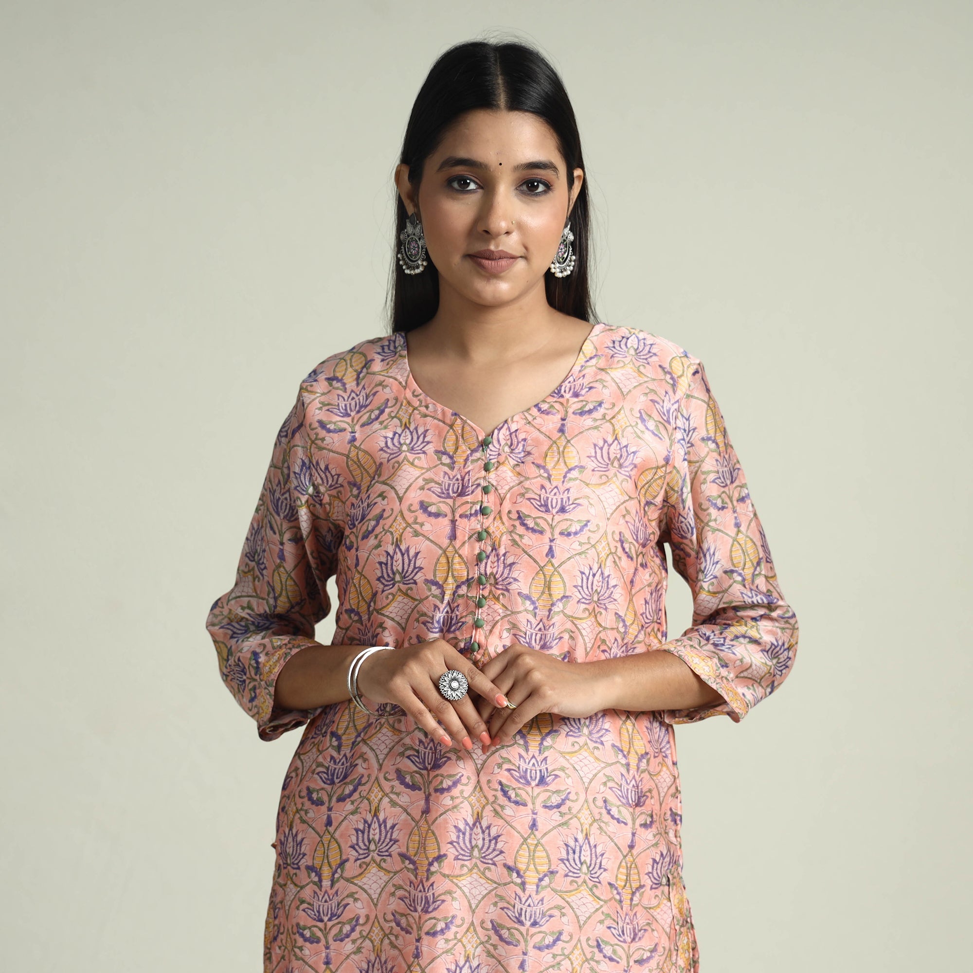 Embrace the elegance of handcrafted beauty with our sanganeri hand block printed maheshwari silk long Kurta with palazzo & dupatta set. This suit set includes a maheshwari silk Kurta, cotton palazzo with maheshwari silk zari border dupatta. The Kurta also features a convenient one-side pocket, perfect for carrying small essentials, and the palazzo features an elasticized waist and two side pockets, adding functionality to this palazzo. Perfect for special occasions and celebrations, this elegant suit exudes traditional charm with its hand-block printed motifs.