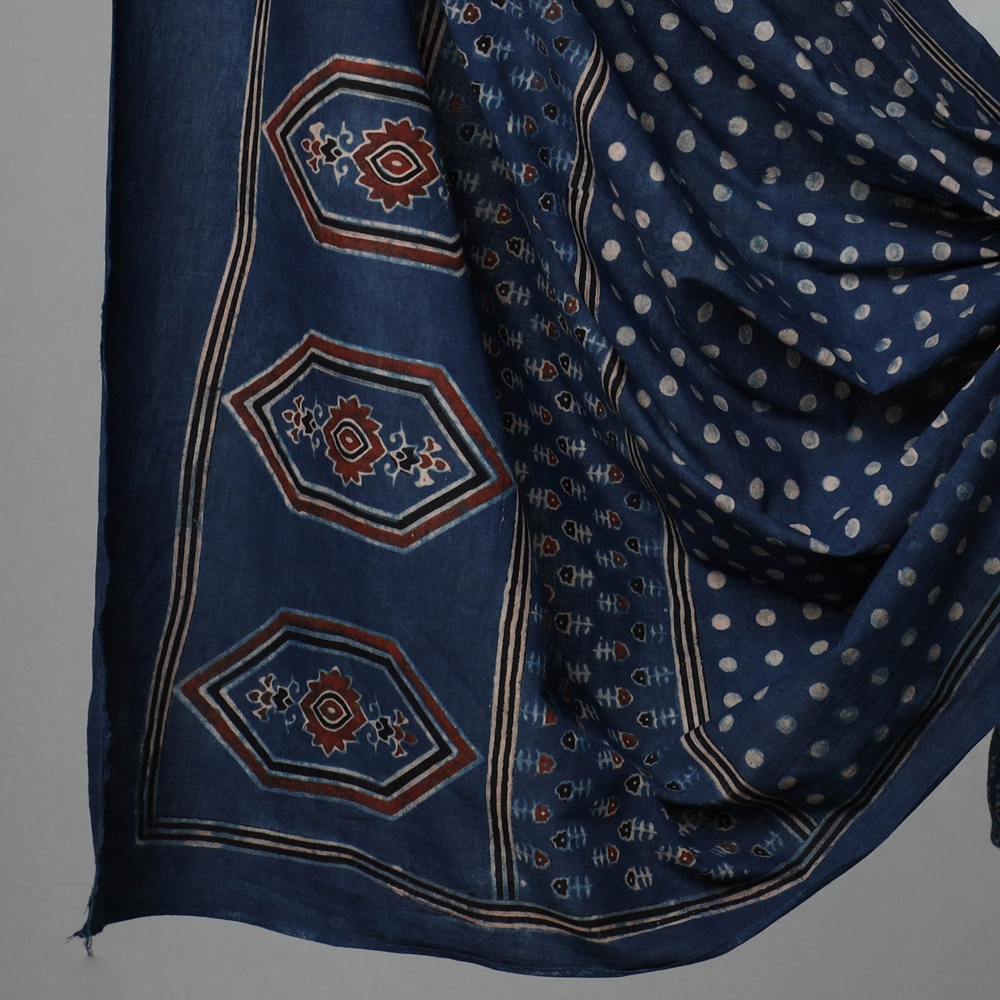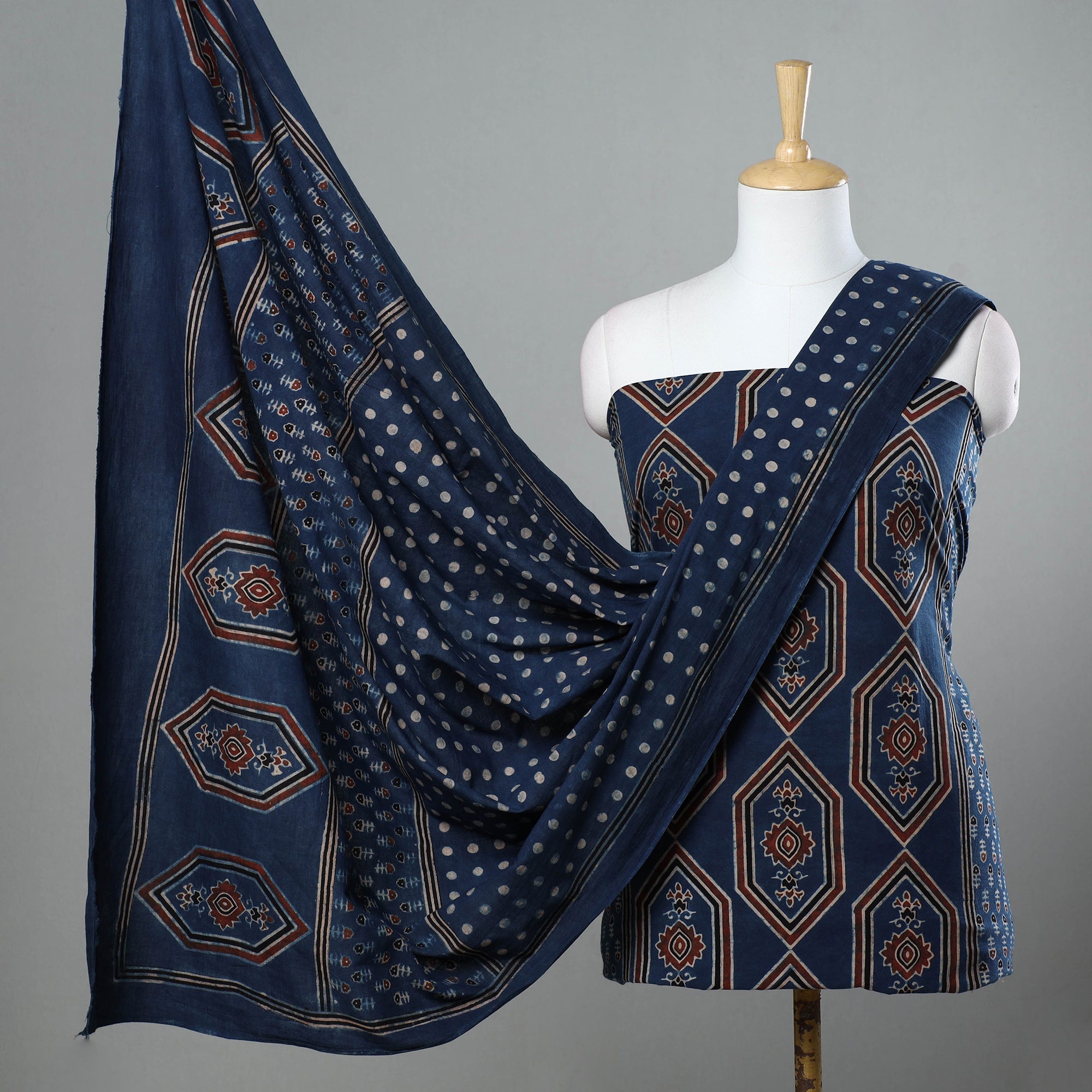 Fine quality ajrakh hand block printed cotton 3-piece suit material set is made using natural dyes through traditional ajrakh technique of hand-block printing practised by the artisans in Kutch region of Gujarat. Ajrakh is a traditional natural dyeing and resist block-printing technique on cloth. It is estimated to be around 4,500 years old. The Ajrakh artisans in India are originally from Sindh and they migrated to Kutch in Gujarat and Barmer in Rajasthan. Ajrakh is the traditional attire of the Maldhari pastoral community of Bhuj. The process of 'Ajrakh' is a long drawn process with many stages and each layer of colour is printed after a gap of time so the cloth has to stay for the day.