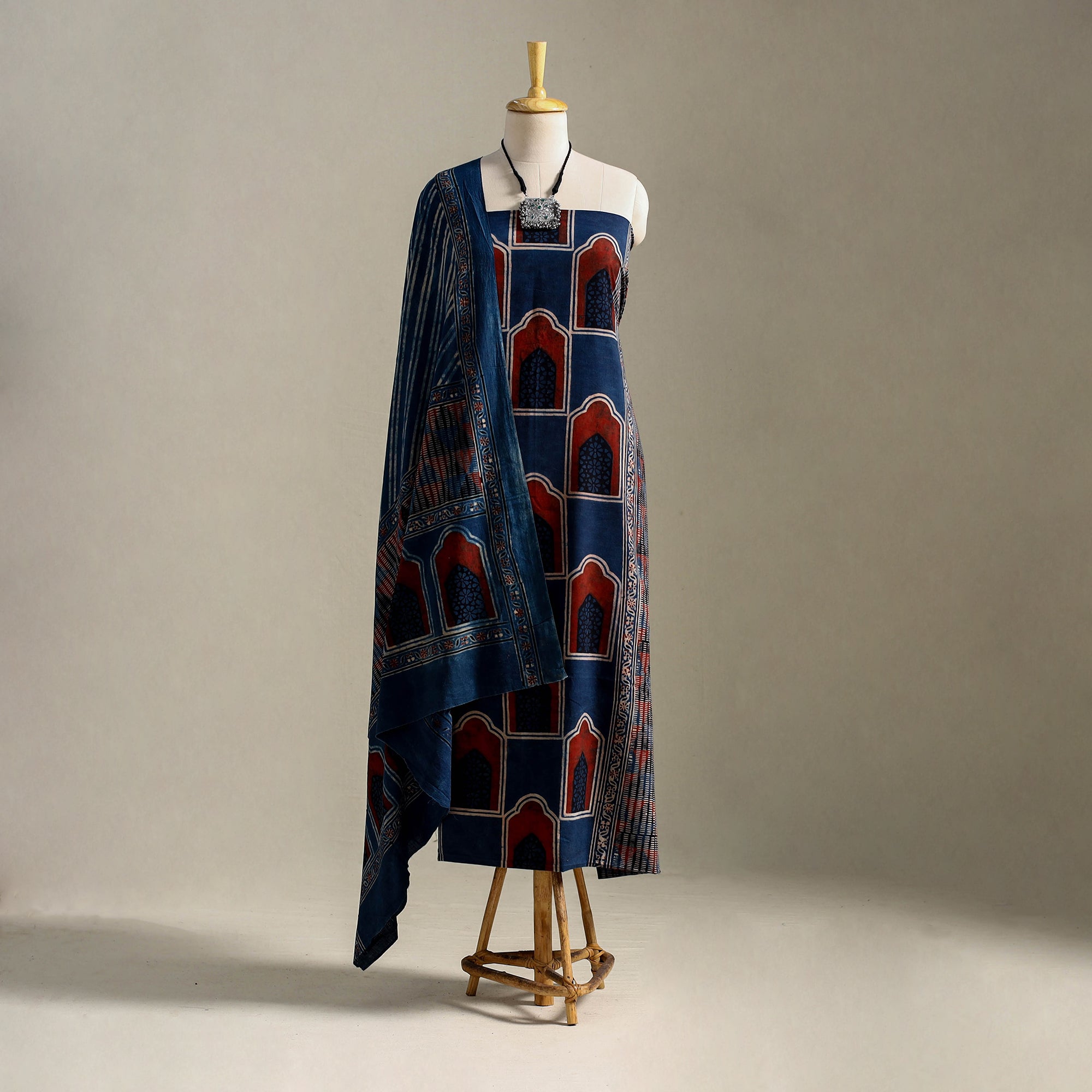 Fine quality blue ajrakh hand block printed cotton 3-piece suit material set is made using natural dyes through traditional ajrakh technique of hand-block printing practised by the artisans in Kutch region of Gujarat.