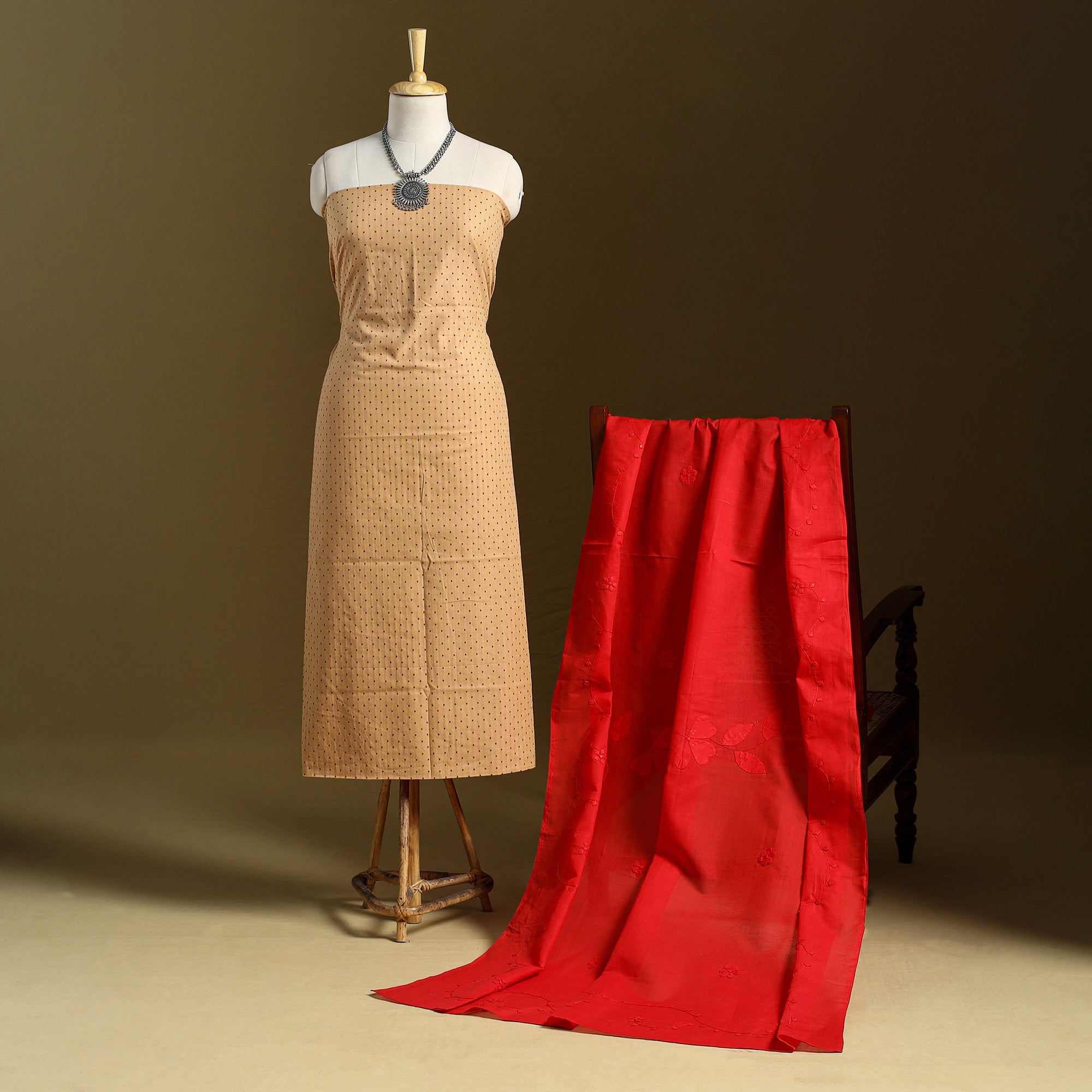 Fine quality brown jacquard cotton kurta material with patti kaam applique work cotton dupatta. The exquisite collection of matching suit materials by Noori Bazaar is perfect for traditional and cultural events such as weddings, festivals, and family gatherings.