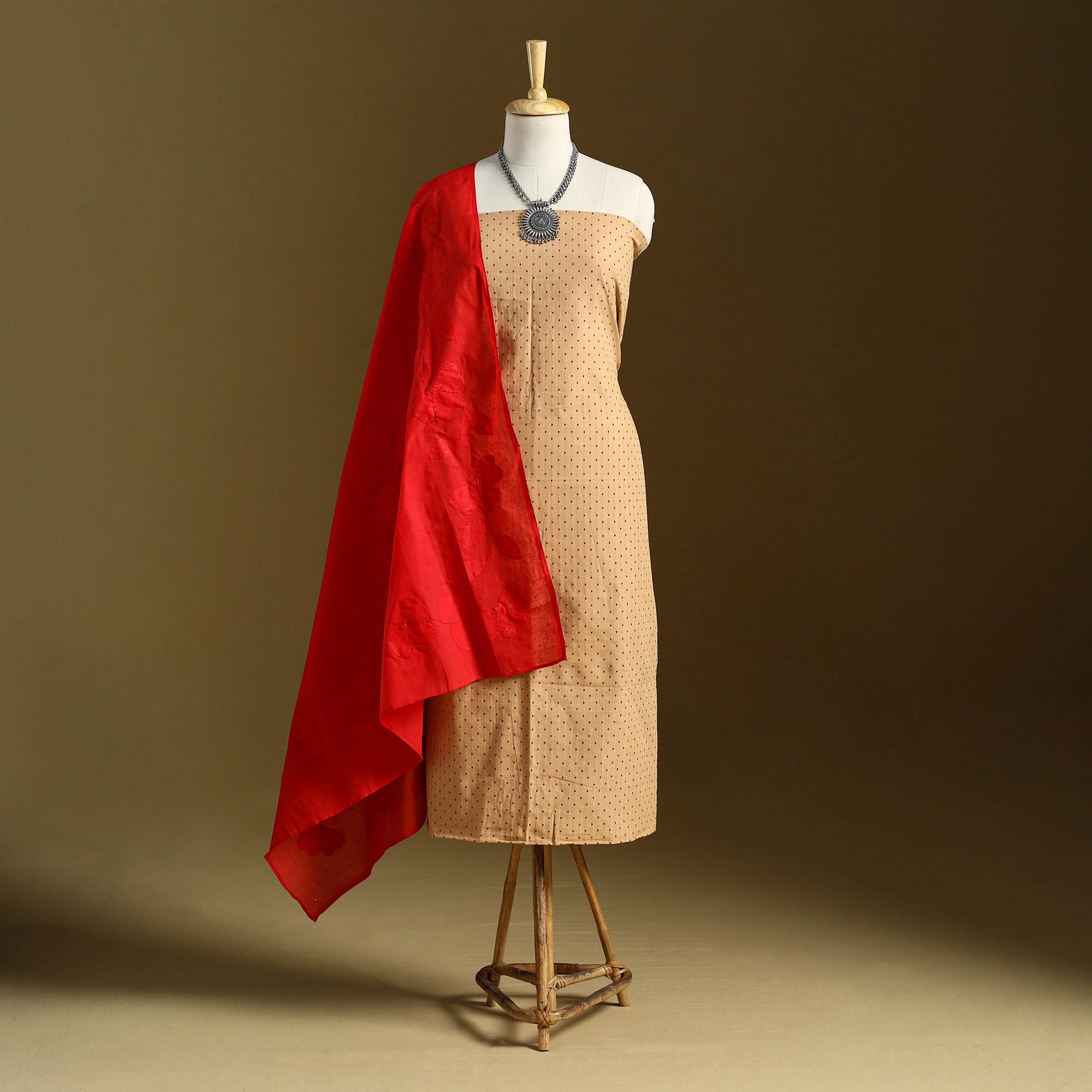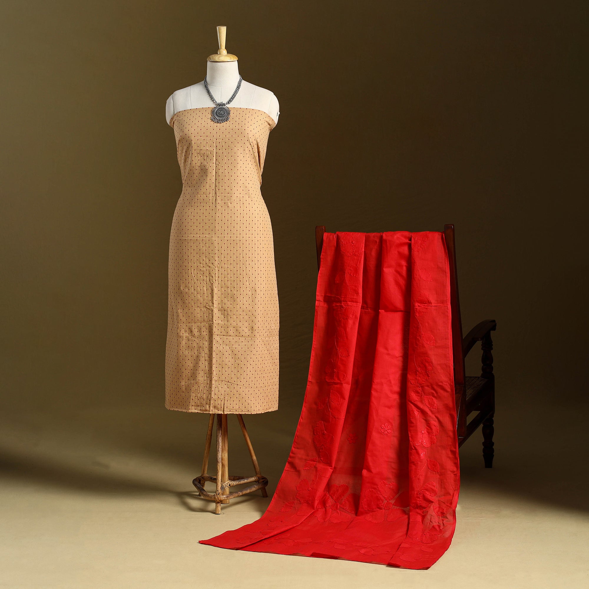 Fine quality brown jacquard cotton kurta material with patti kaam applique work cotton dupatta. The exquisite collection of matching suit materials by Noori Bazaar is perfect for traditional and cultural events such as weddings, festivals, and family gatherings.