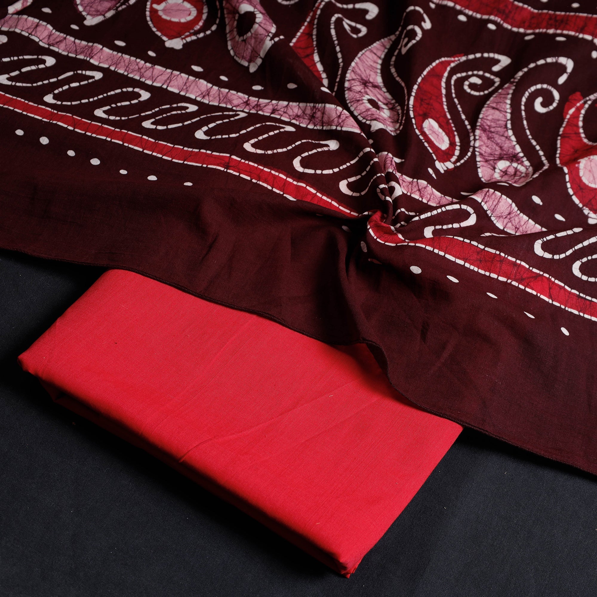 Fine quality red plain mangalagiri handloom cotton kurta material with batik printed mul cotton dupatta. The exquisite collection of matching suit materials by Noori Bazaar is perfect for traditional and cultural events such as weddings, festivals, and family gatherings.