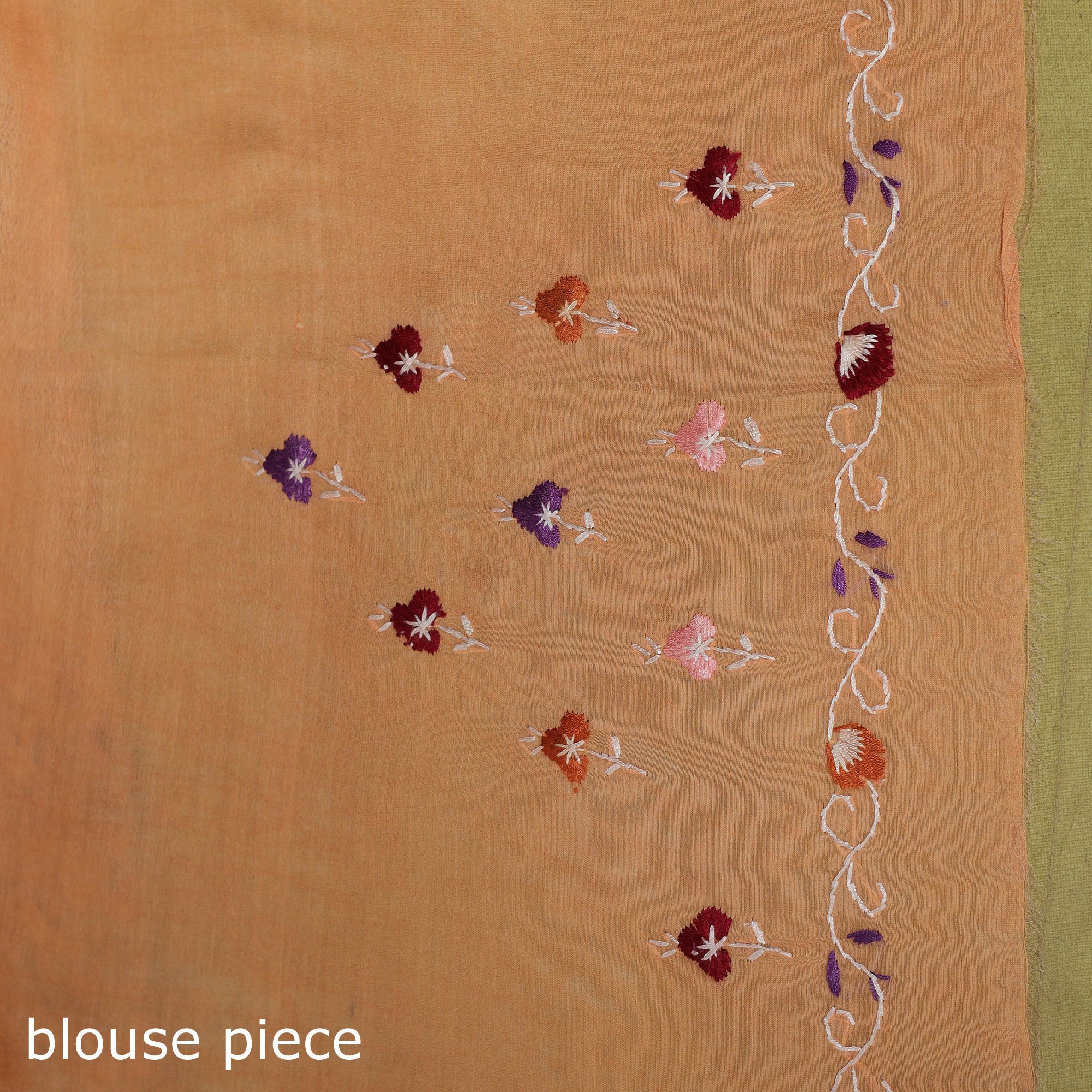 Fine quality peach kashida thread work hand embroidered handloom chanderi silk saree with zari border by Zahoor Ahmed from Harwan, Kashmir.