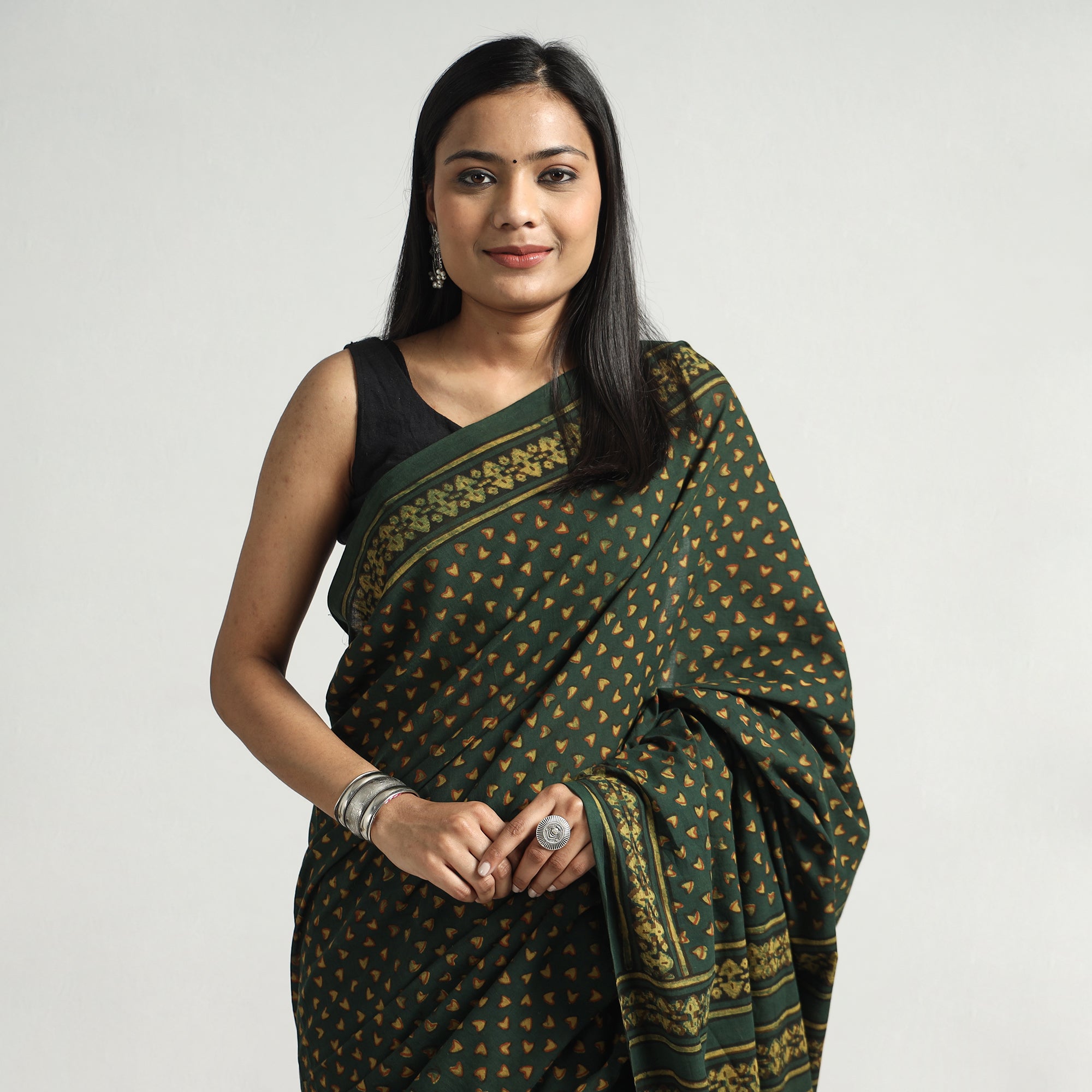 Fine quality traditional akola block printed cotton saree made using natural dyes through traditional process of hand block printing practised by the master artisans in Akola village of Rajasthan. Pair it with your favorite blouse and accessories to create a stunning and culturally rich look that's bound to turn heads.