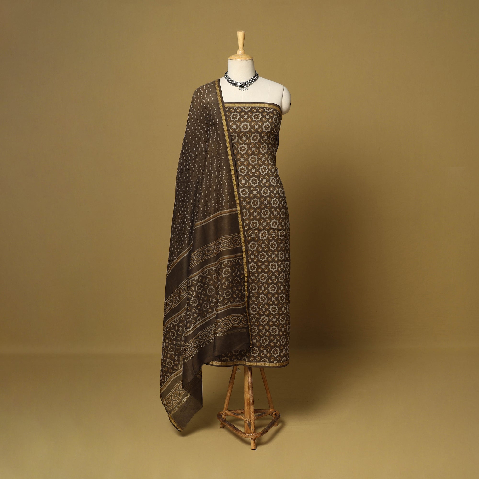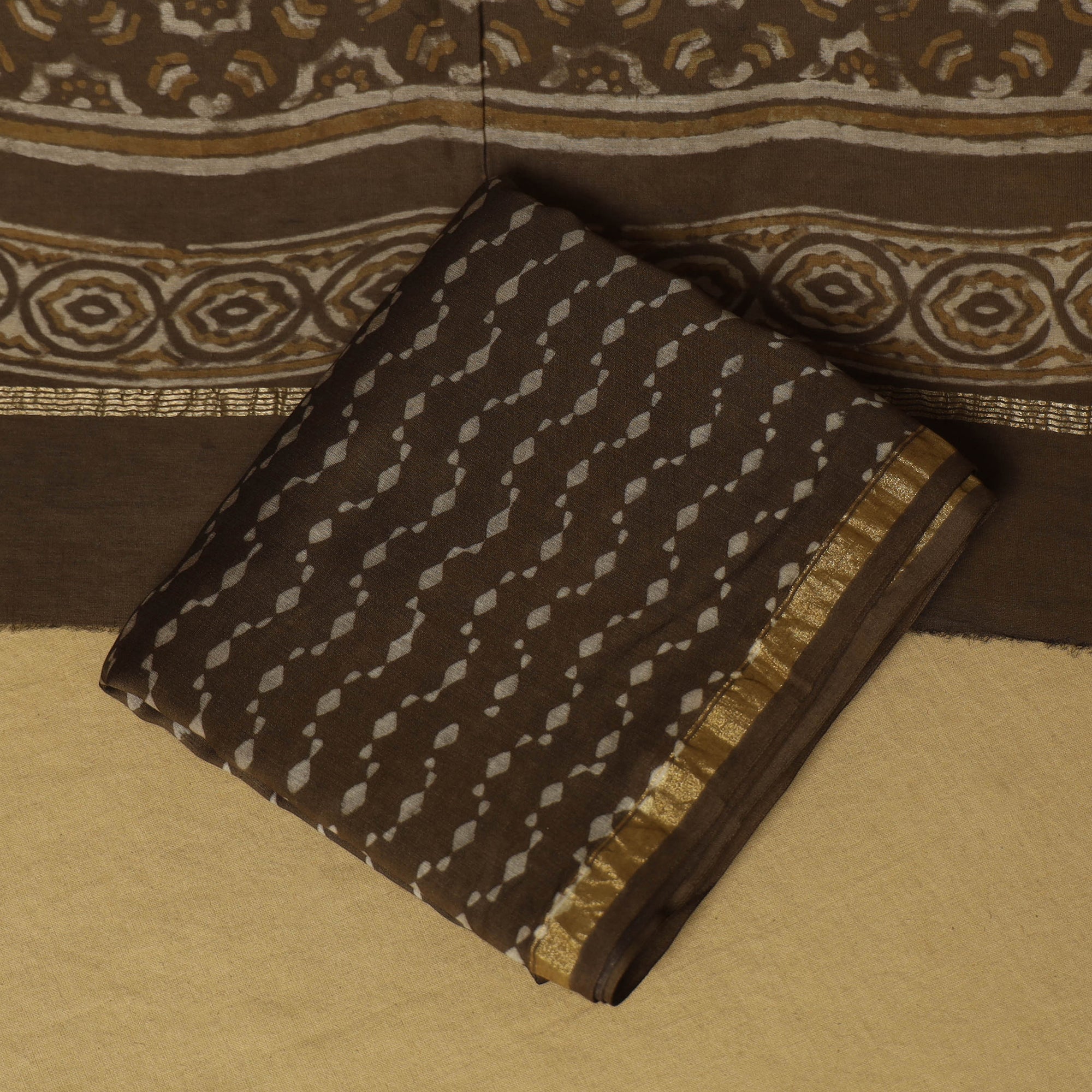 Fine quality brown akola hand block printed 3-piece chanderi silk-cotton suit material set with zari border, made using natural dyes through the traditional process of hand block printing practised by the master artisans in Akola village of Rajasthan. Chanderi silks are known for their gossamer looks and amazing feel. Perfect for creating elegant suits, this set with a zari border lends a touch of regal charm. Ideal for special occasions and celebrations.