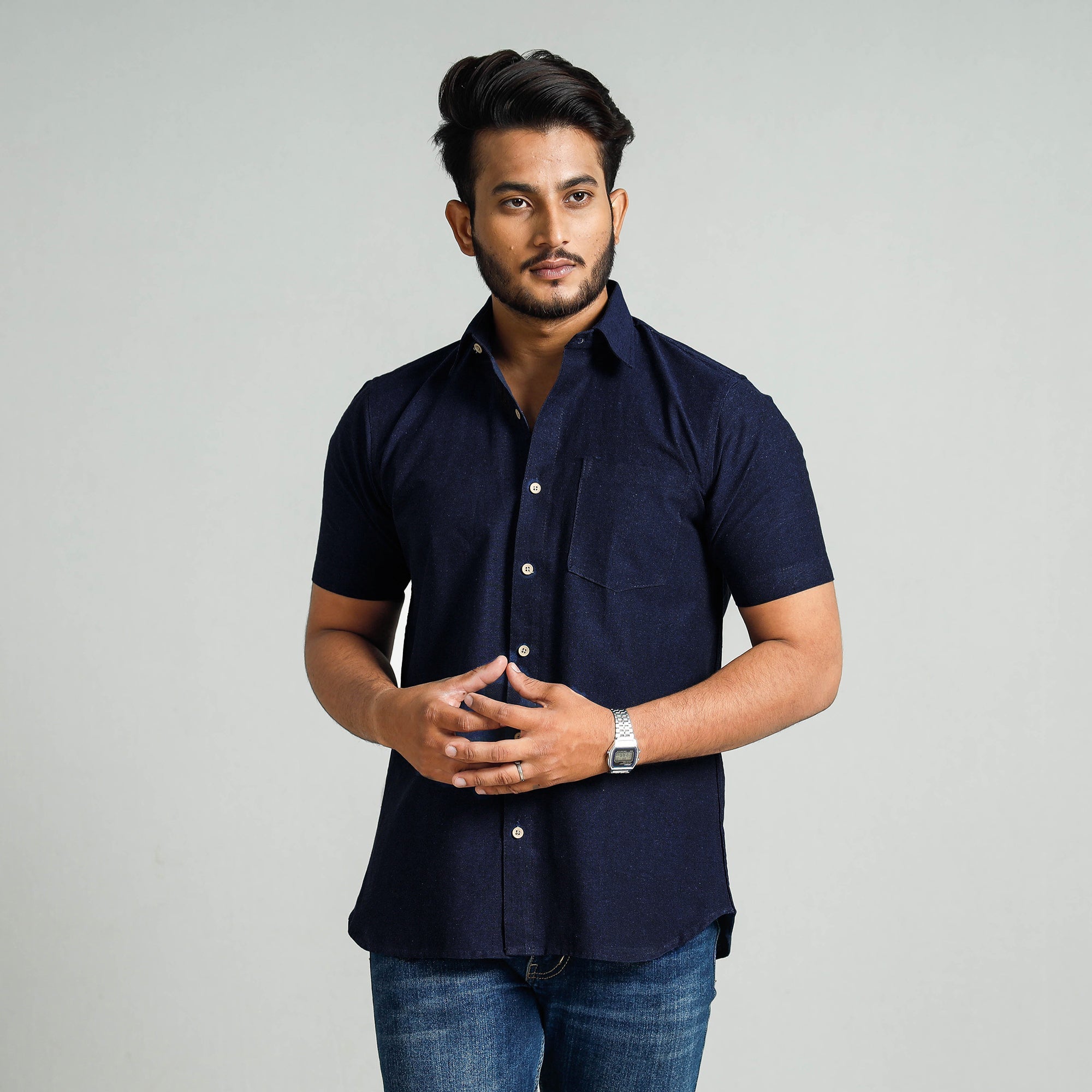 This exquisite plain-dyed handloom cotton men's half-sleeve shirt is a perfect blend of style and comfort. It's crafted from breathable handloom cotton fabric, which ensures all-day comfort. This shirt features a regular collar and half sleeves, ideal for a casual yet sophisticated look. The crisp wooden buttons add a touch of natural charm, while the patch pocket on the front offers convenience and practicality. This shirt is perfect for your daily outing and for a special occasion.
