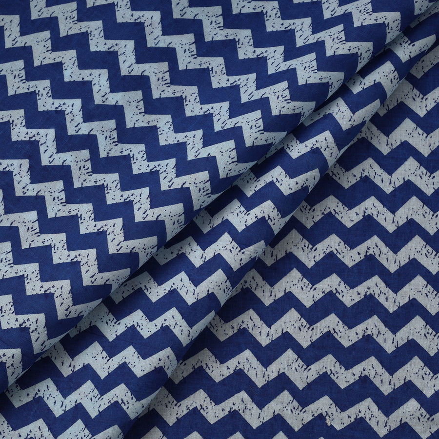 Fine quality blue zigzag jaipur screen printed pure cotton fabric from Jaipur, Rajasthan. Screen printing is a process involving big wooden screens is a printing technique from Sanganer, a village in the southern part of Jaipur, Rajasthan. Bleed free VAT dyes used.