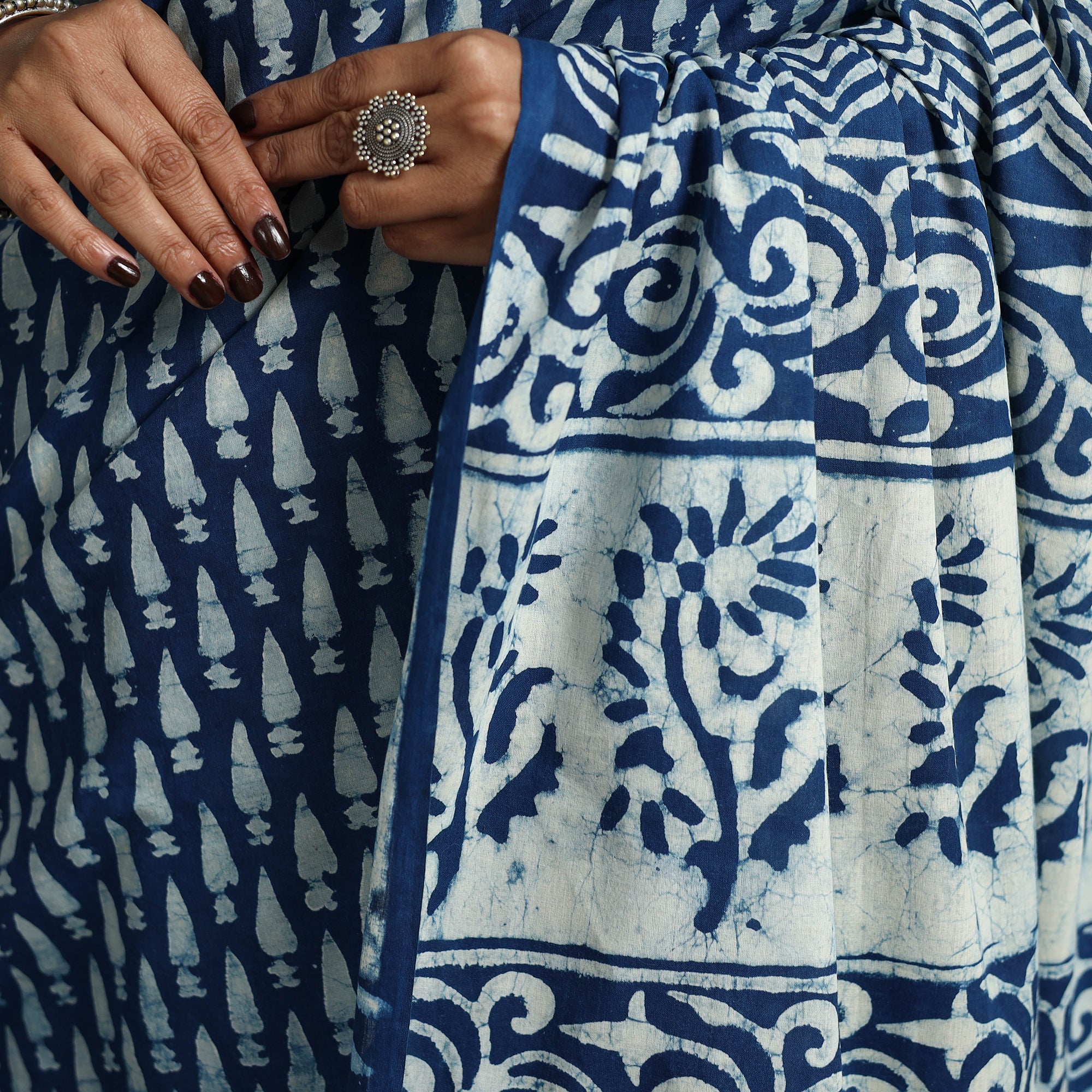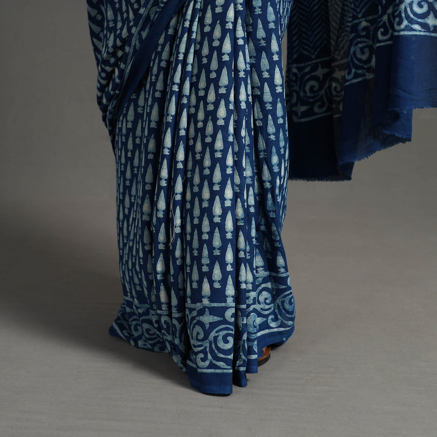 Elevate your style with this blue natural dyed block print cotton pipad saree. The use of natural dyes adds to the quality of the product, making it eco-friendly and safe for you to wear. It's made using a traditional mud-resist process by Chhipa Azhar, a renowned artisan from Pipar, Rajasthan. which is then block-printed with intricate designs using a wooden block. The result is a beautifully crafted saree that is unique and reflects the rich cultural heritage of Rajasthan.
