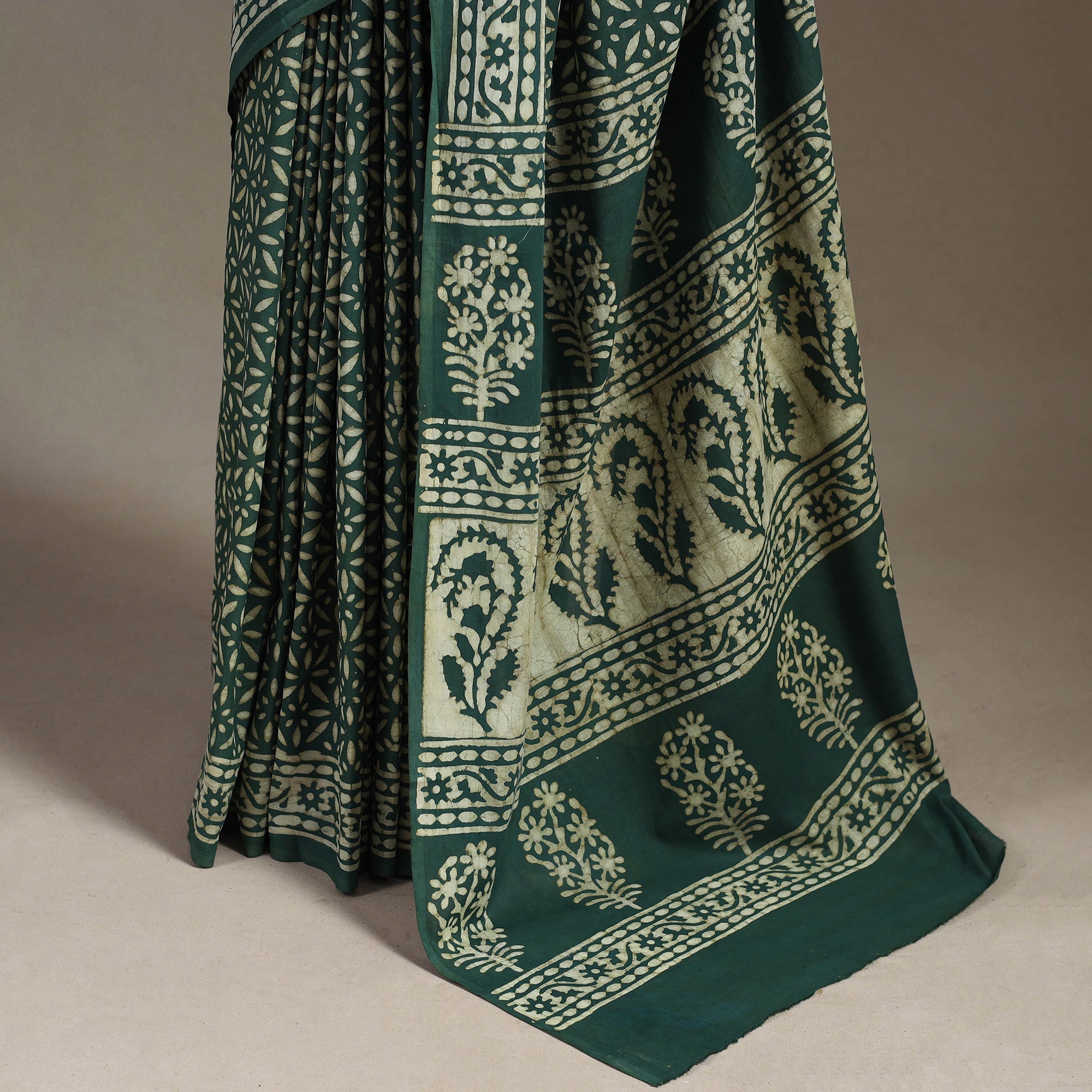 Elevate your style with this exquisite green pipad hand block printed cotton saree. The use of natural dyes adds to the quality of the product, making it eco-friendly and safe for you to wear. It's made using a traditional mud-resist process by Chhipa Yasin Shahabuddin, a renowned artisan from Pipar, Rajasthan. The process involves using mud to create a resist on the fabric, which is then block-printed with intricate designs using a wooden block. The result is a beautifully crafted saree that is unique and reflects the rich cultural heritage of Rajasthan.