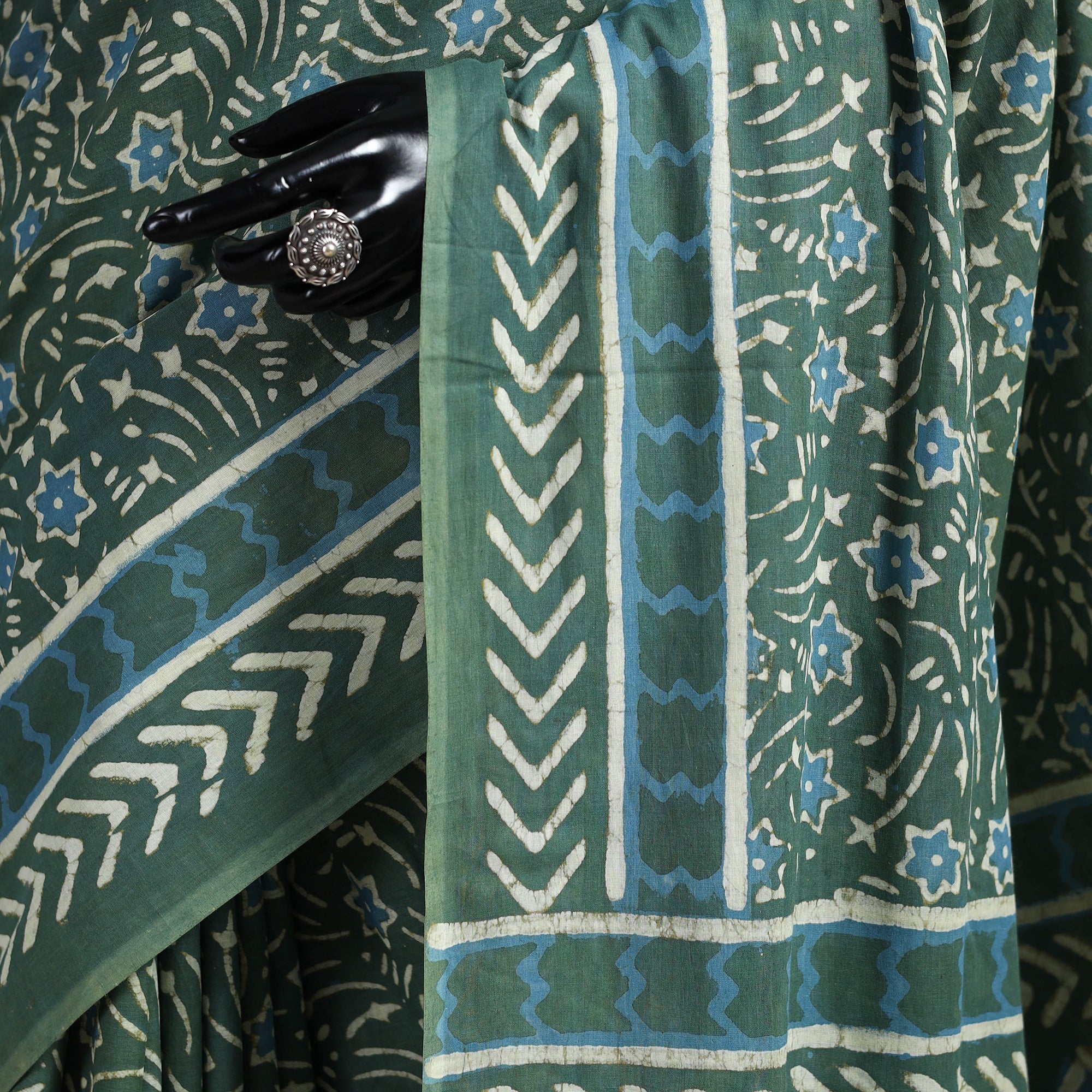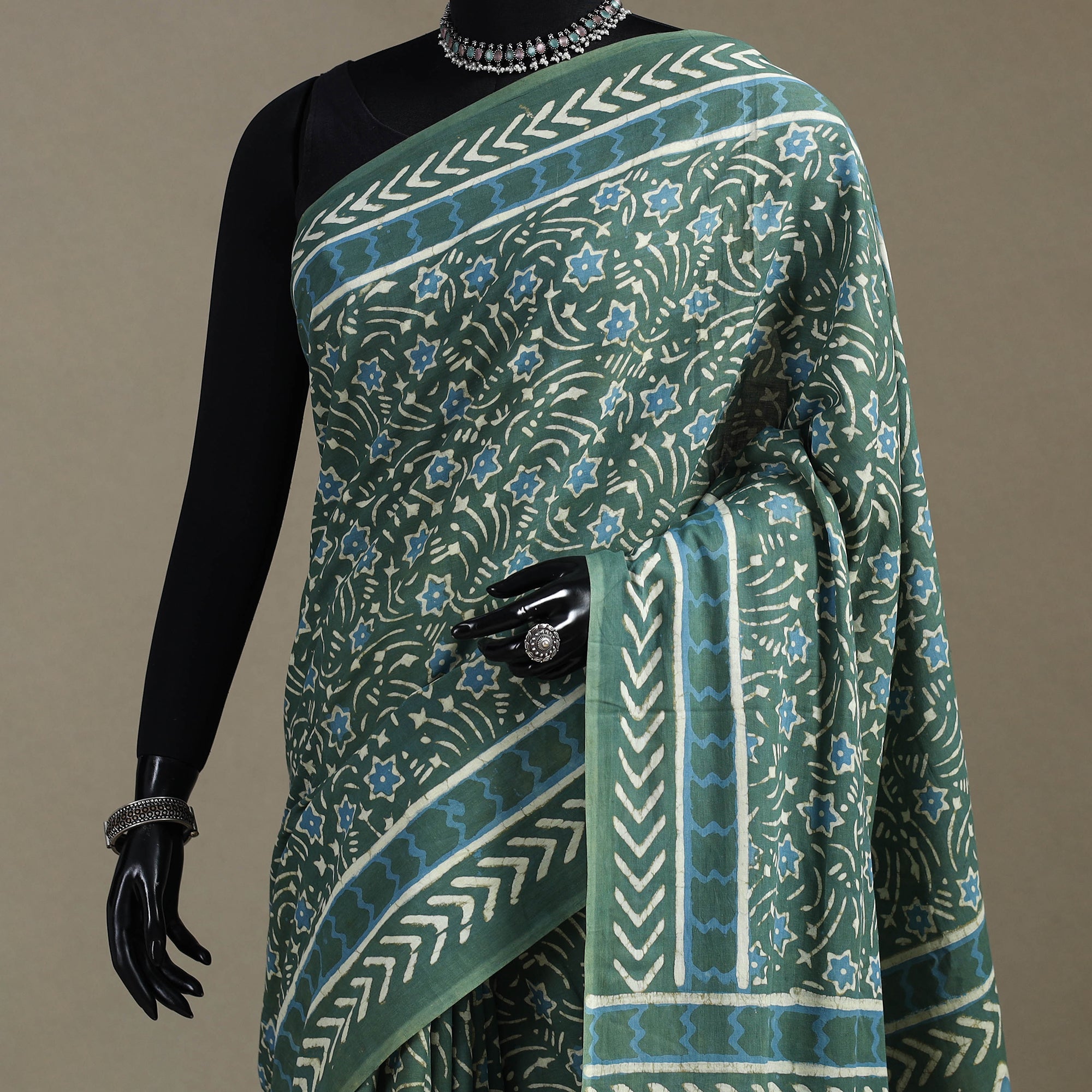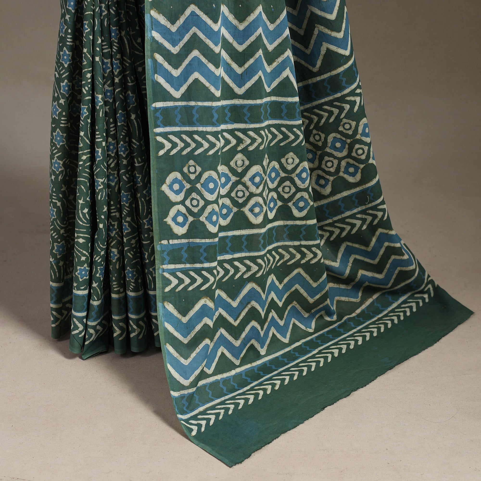 Elevate your style with this exquisite pipad hand block printed cotton saree. The use of natural dyes adds to the quality of the product, making it eco-friendly and safe for you to wear. It's made using a traditional mud-resist process by Chhipa Yasin Shahabuddin, a renowned artisan from Pipar, Rajasthan. The process involves using mud to create a resist on the fabric, which is then block-printed with intricate designs using a wooden block. The result is a beautifully crafted saree that is unique and reflects the rich cultural heritage of Rajasthan.