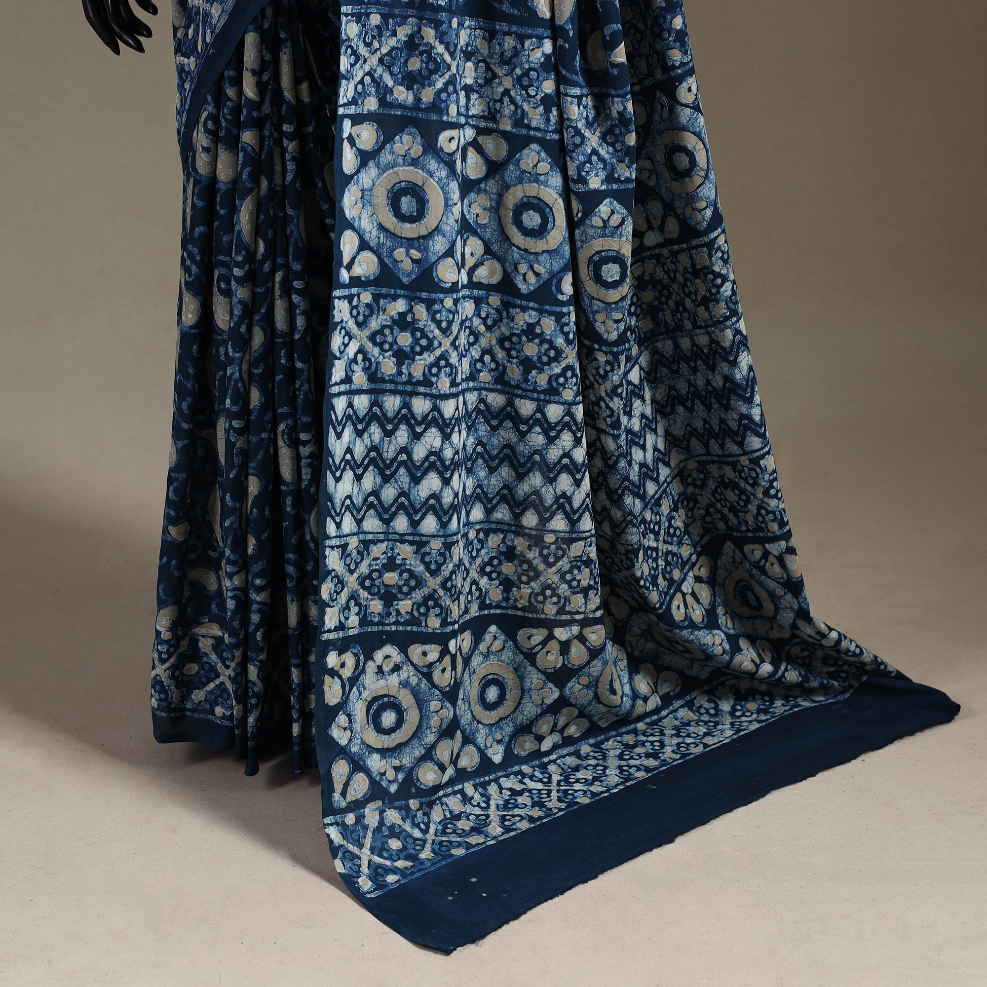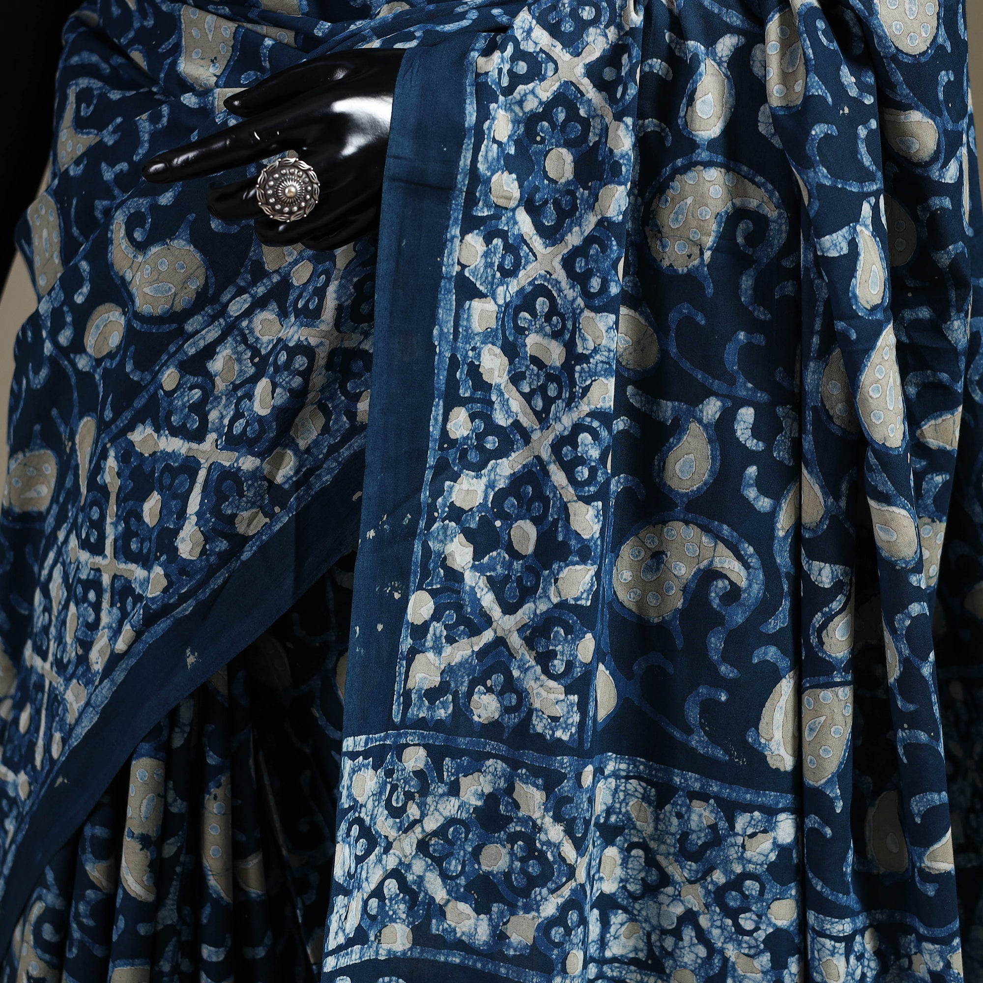 Elevate your style with this exquisite blue pipad hand block printed cotton saree. The use of natural dyes adds to the quality of the product, making it eco-friendly and safe for you to wear. It's made using a traditional mud-resist process by Chhipa Yasin Shahabuddin, a renowned artisan from Pipar, Rajasthan. The process involves using mud to create a resist on the fabric, which is then block-printed with intricate designs using a wooden block. The result is a beautifully crafted saree that is unique and reflects the rich cultural heritage of Rajasthan.