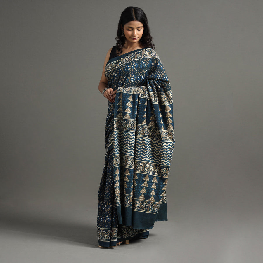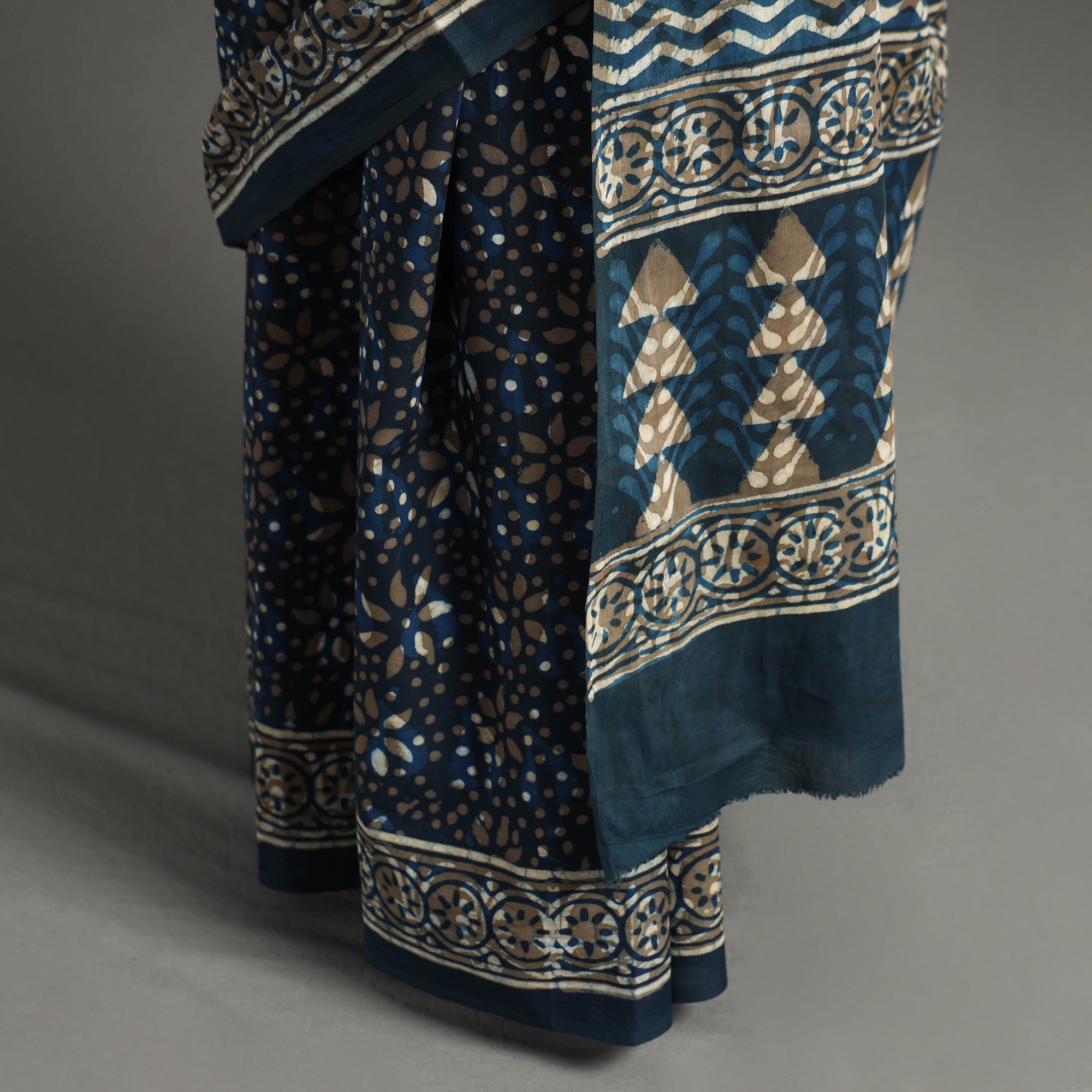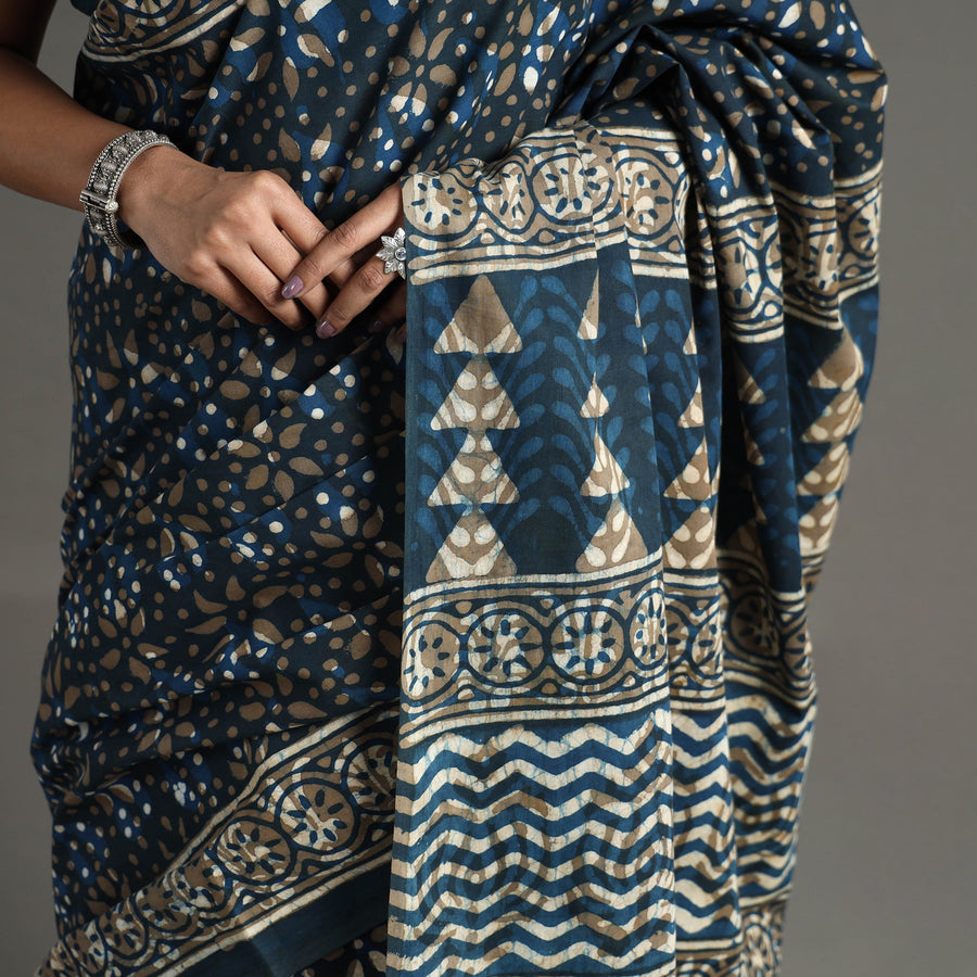 Elevate your style with this pipad hand-block-printed cotton saree. The use of natural dyes adds to the quality of the product, making it eco-friendly and safe for you to wear. It's made using a traditional mud-resist process by Chhipa Azhar, a renowned artisan from Pipar, Rajasthan. The process involves using mud to create a resist on the fabric, which is then block-printed with intricate designs using a wooden block. Whether attending a formal event or a casual gathering, this saree exudes grace and sophistication. embrace the rich heritage of Indian craftsmanship with our Pipad hand-block-printed cotton saree.