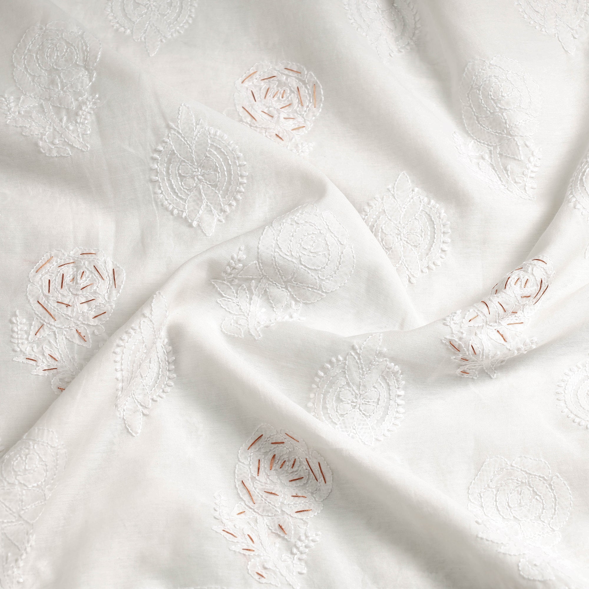 This exquisite kurta material features intricate Lucknowi chikankari embroidery with Parsi-style detailing on chanderi silk-cotton fabric. Chikankari is a traditional textile art from Lucknow known for its delicate and intricate hand embroidery. The threads are skillfully embroidered on cool, pastel shades of light cotton garments, creating a beautiful blend of craftsmanship and elegance. Perfect for creating stunning kurtas, this fabric is a testament to the rich heritage of Indian textiles and embroidery techniques. Chanderi weaving is practiced in the historic town of Chanderi in Madhya Pradesh. The buttis or motifs on chanderi blend are primarily hand woven on handloom, with the use of needles. Separate needles are used to create different motifs.
