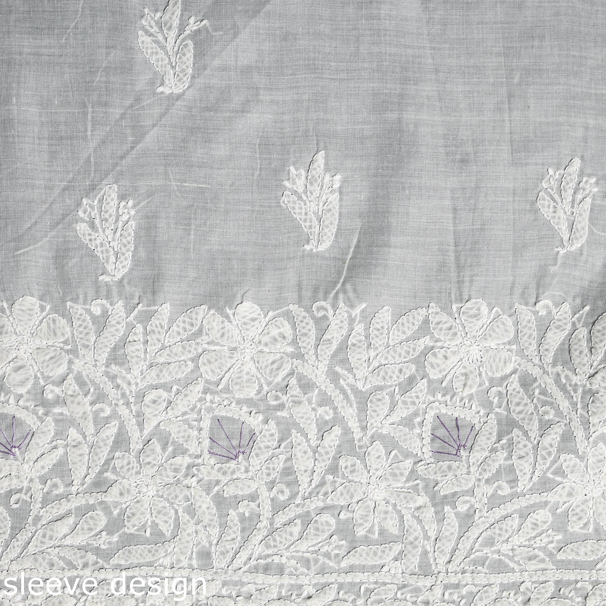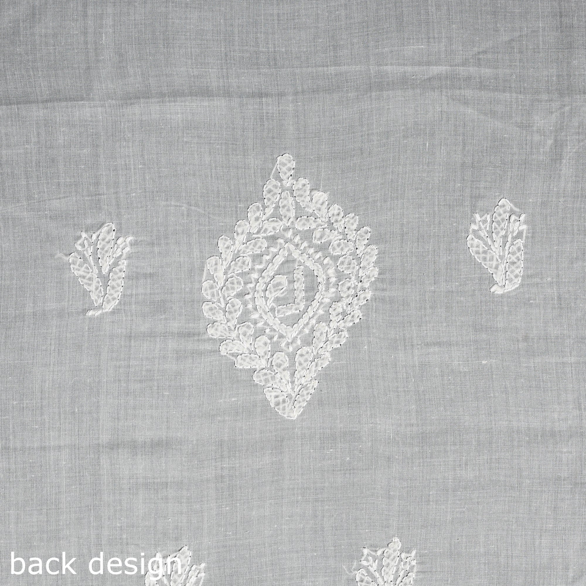This exquisite kurta material features intricate white Lucknowi chikankari embroidery on cotton fabric. Chikankari is a traditional textile art from Lucknow known for its delicate and intricate hand embroidery. The threads are skillfully embroidered on cool, pastel shades of light cotton garments, creating a beautiful blend of craftsmanship and elegance. Perfect for creating stunning kurtas, this fabric is a testament to the rich heritage of Indian textiles and embroidery techniques.