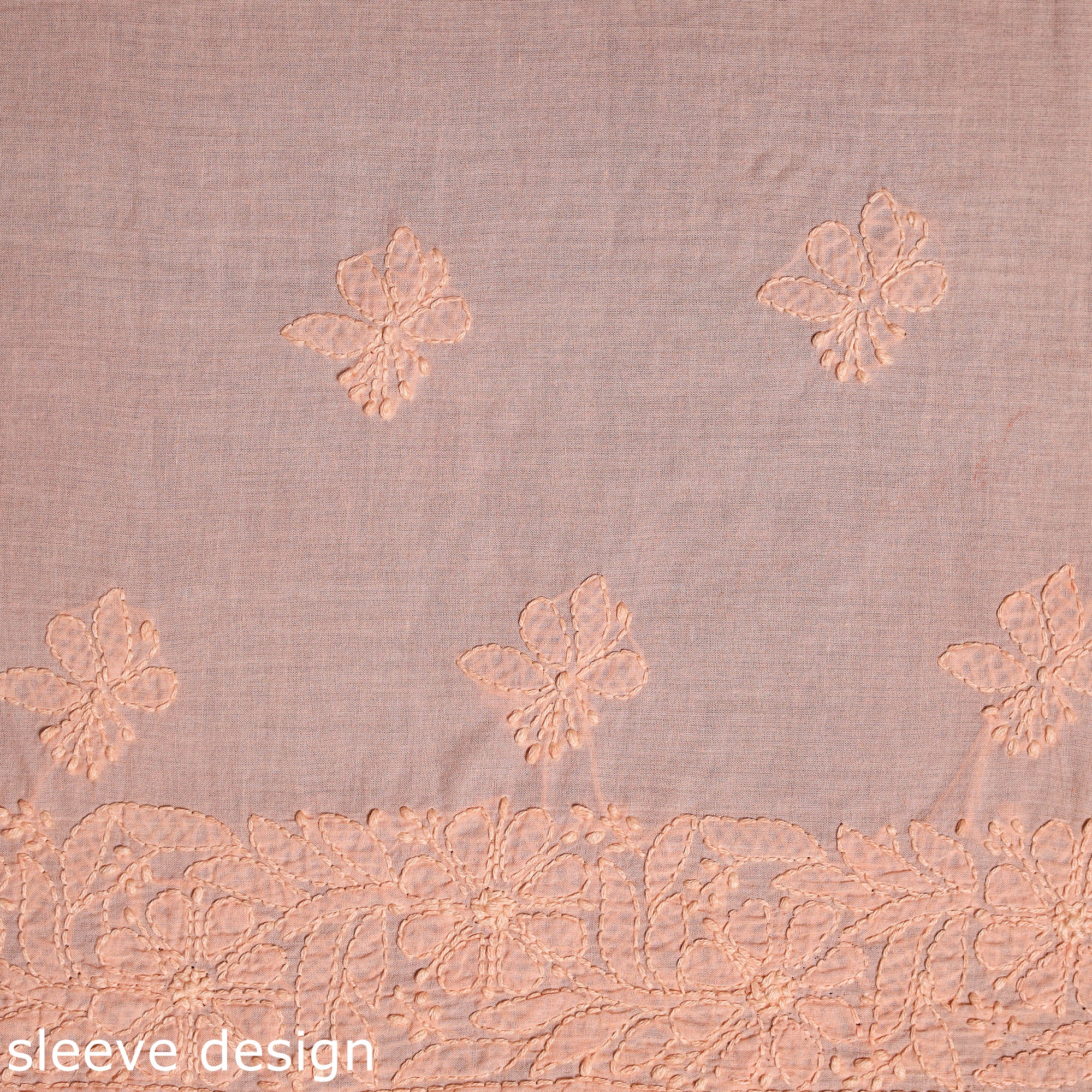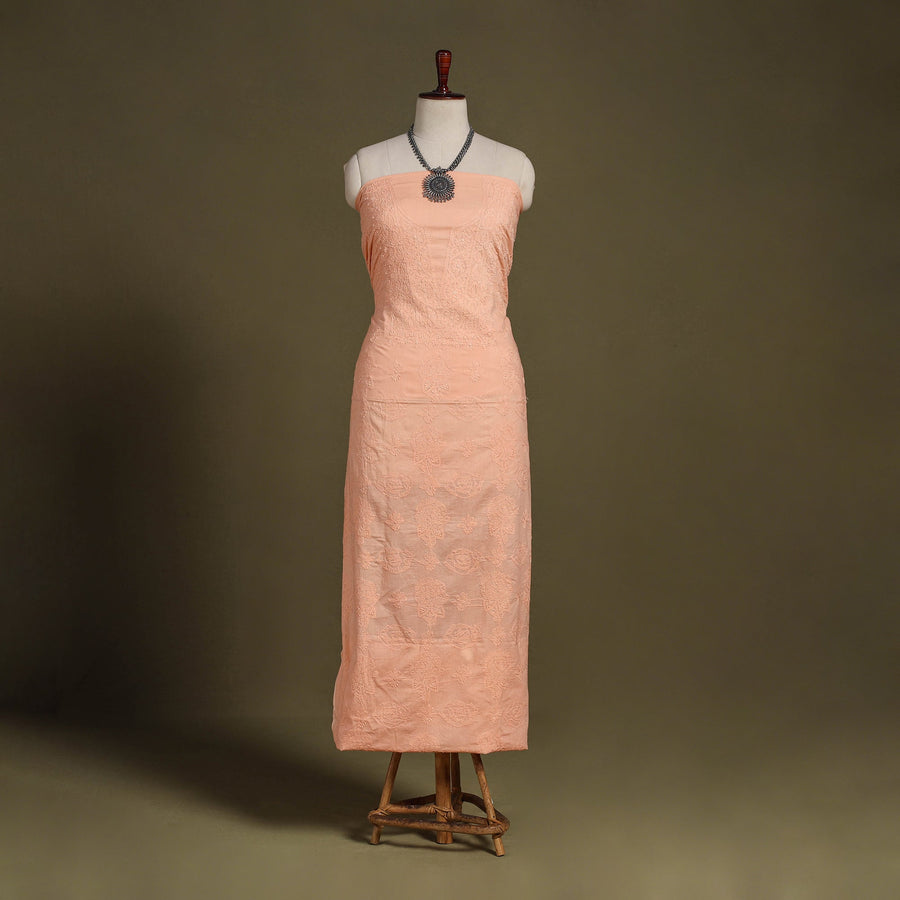 This exquisite kurta material features intricate peach Lucknowi chikankari embroidery on mul cotton fabric. Chikankari is a traditional textile art from Lucknow known for its delicate and intricate hand embroidery. The threads are skillfully embroidered on cool, pastel shades of light cotton garments, creating a beautiful blend of craftsmanship and elegance. Perfect for creating stunning kurtas, this fabric is a testament to the rich heritage of Indian textiles and embroidery techniques.