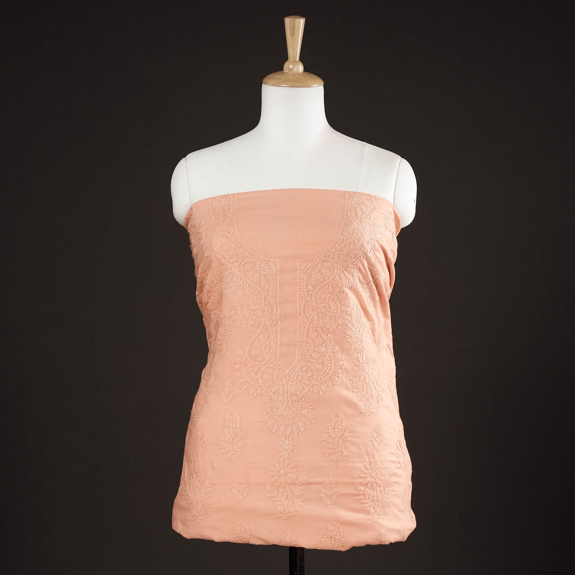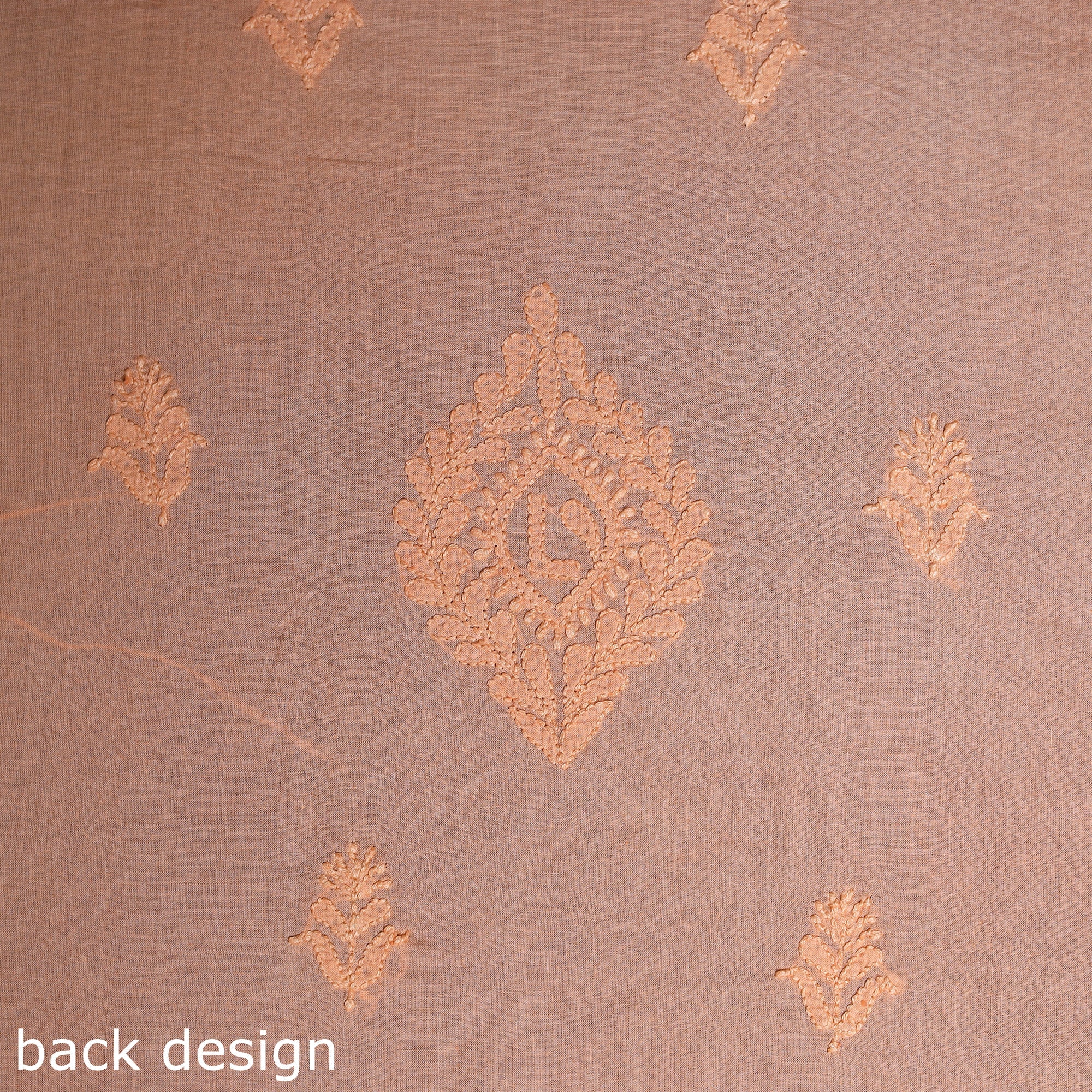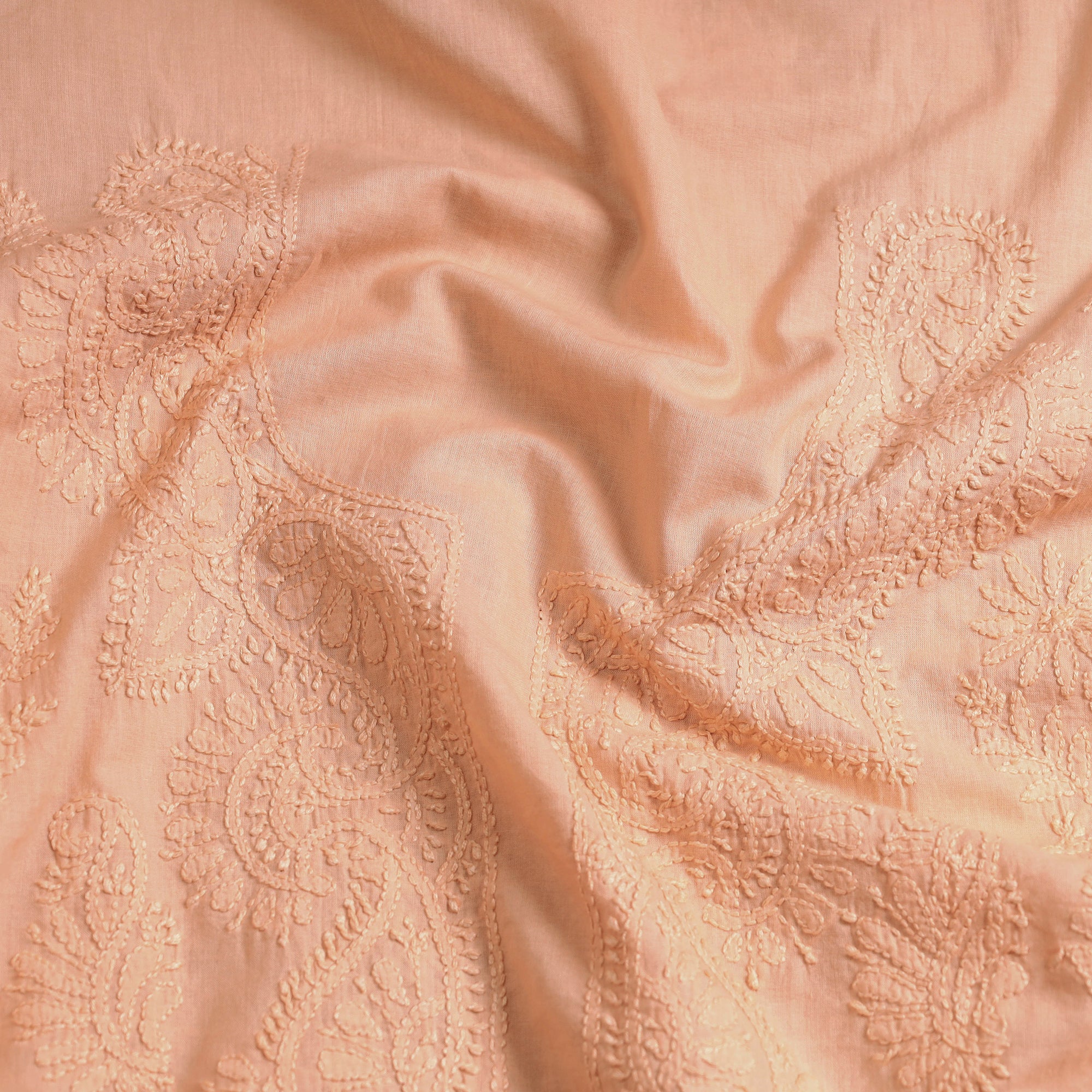 This exquisite kurta material features intricate peach Lucknowi chikankari embroidery on mul cotton fabric. Chikankari is a traditional textile art from Lucknow known for its delicate and intricate hand embroidery. The threads are skillfully embroidered on cool, pastel shades of light cotton garments, creating a beautiful blend of craftsmanship and elegance. Perfect for creating stunning kurtas, this fabric is a testament to the rich heritage of Indian textiles and embroidery techniques.