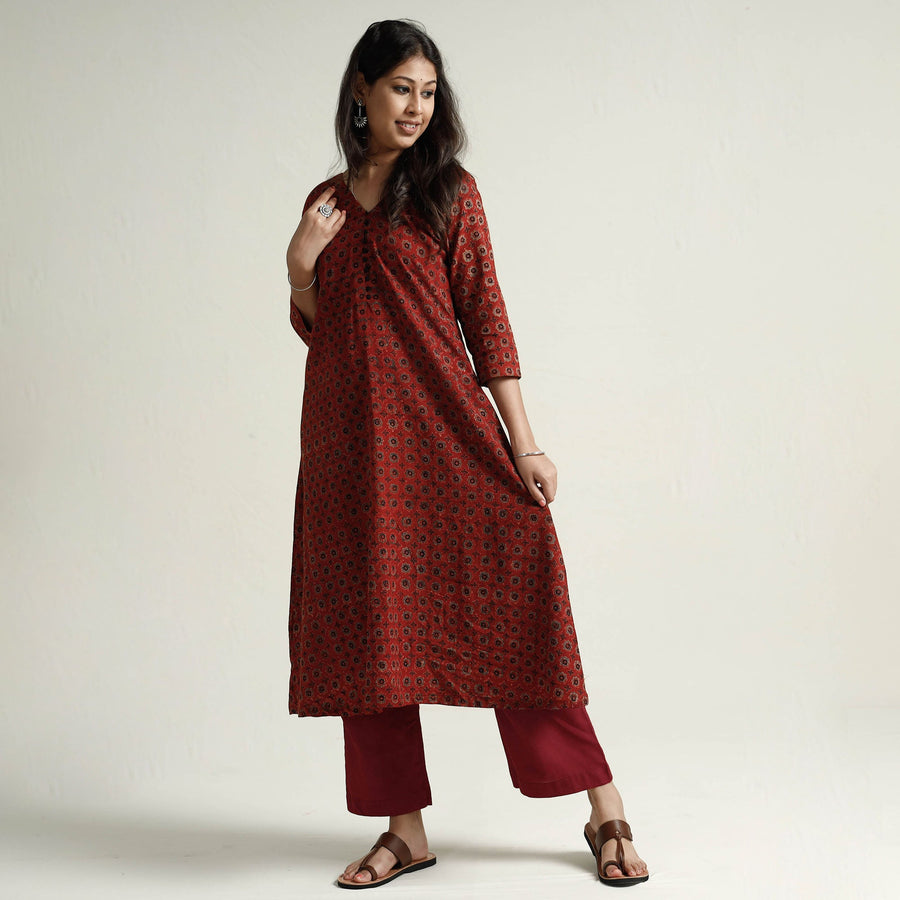 Look and feel beautiful in this uniquely designed ajrakh hand block printed cotton long kurta with palazzo set. This suit set includes a natural-dyed cotton kurta and plain cotton palazzo. The kurta also features a convenient one-side pocket, perfect for carrying small essentials, and the palazzo features an elasticized waist and two side pockets, adding functionality to this palazzo. Perfect for special occasions and celebrations, this elegant suit exudes traditional charm with its hand-block printed motifs.