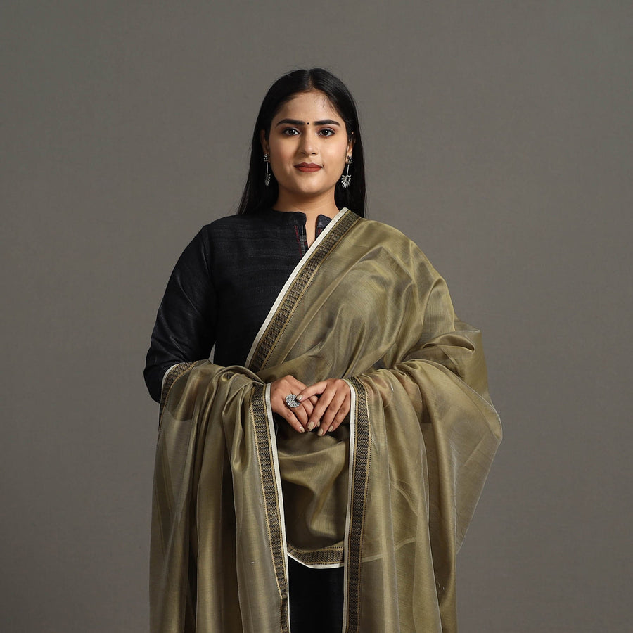 This olive green Maheshwari silk-cotton handloom zari border dupatta with tassels is a masterpiece of traditional handloom weaving techniques passed down through generations of skilled artisans in Maheshwar. Its lightweight, sheer texture exudes unparalleled elegance, adding grace to any attire. With its exquisite craftsmanship and delicate tassels, this dupatta is a must-have for anyone who appreciates the art of handloom weaving.