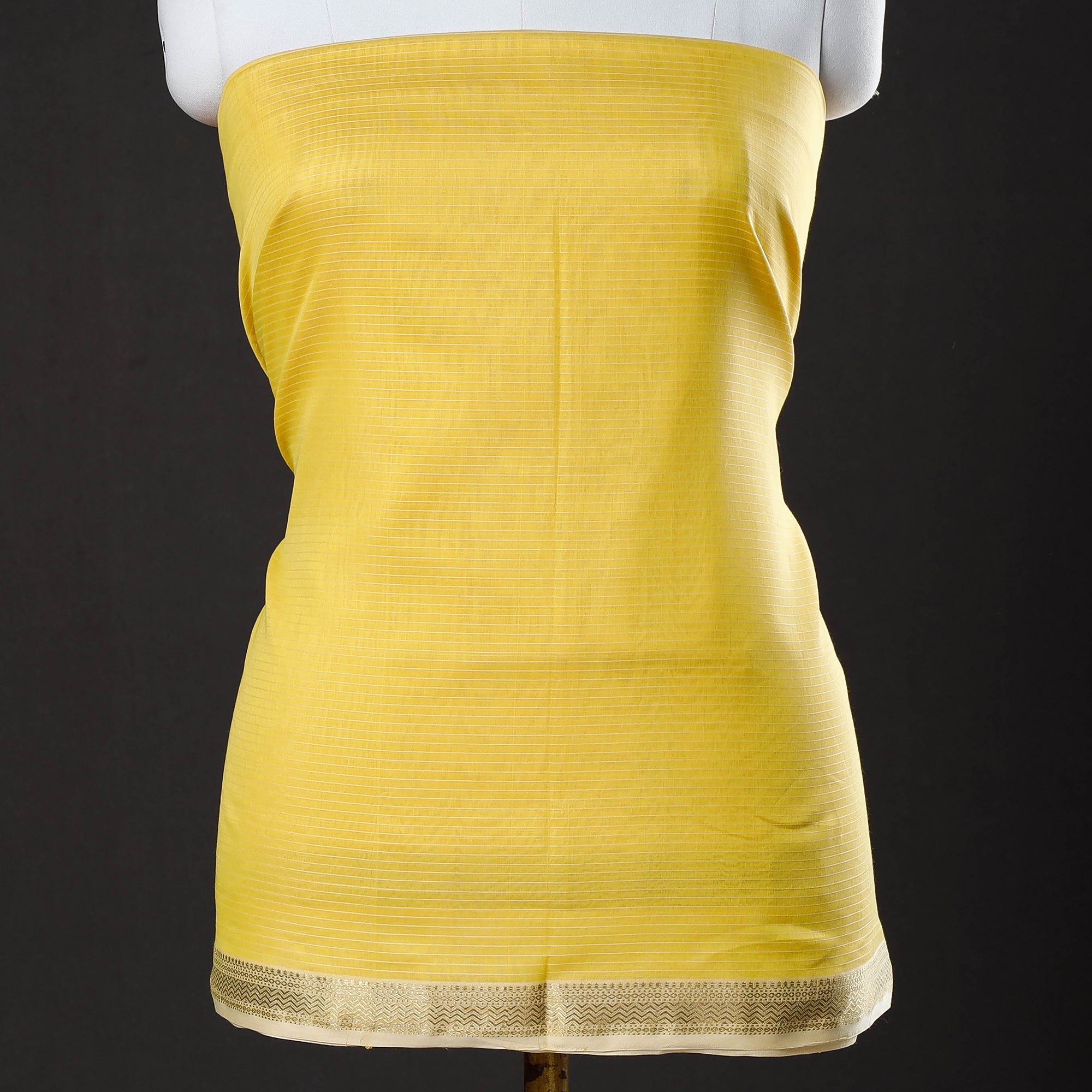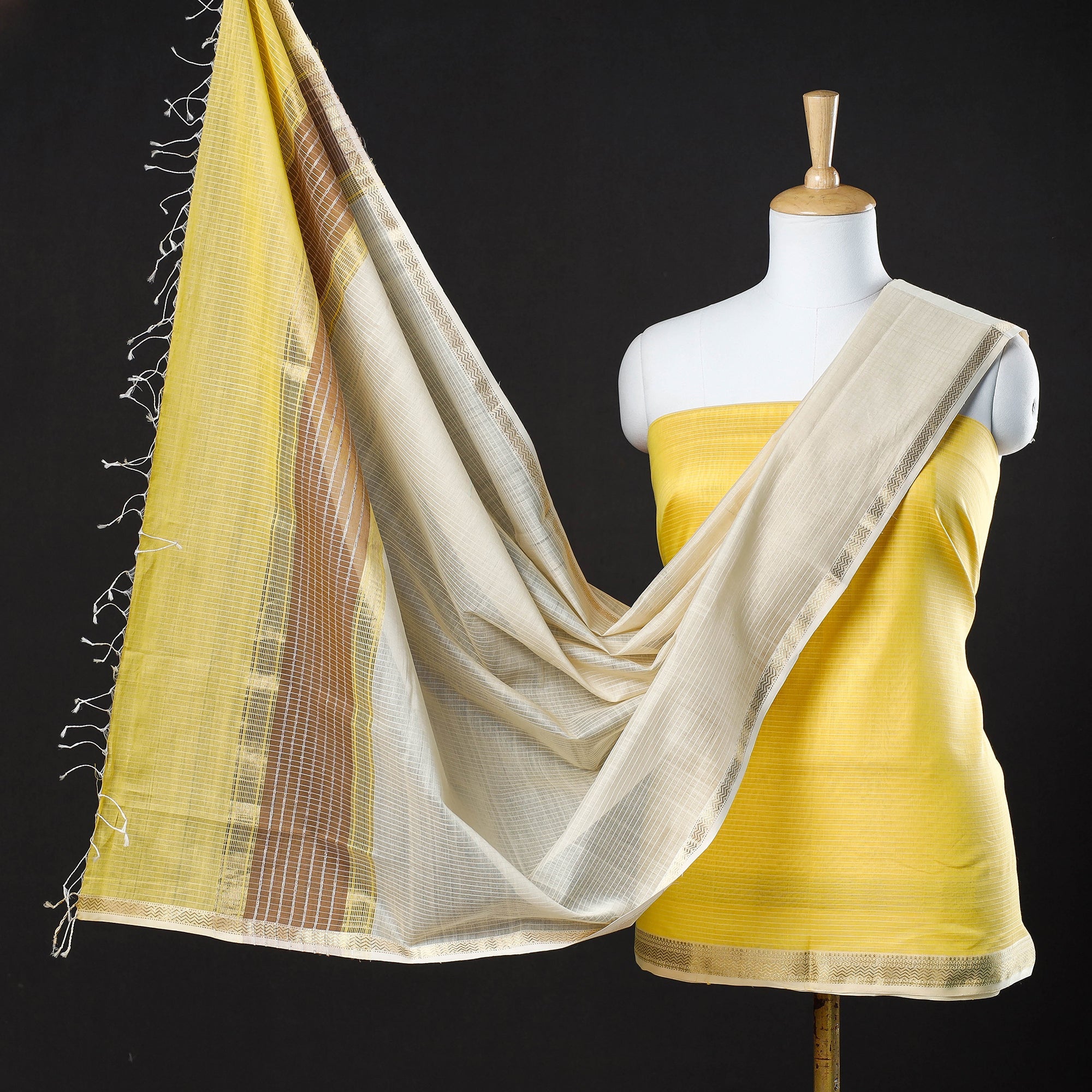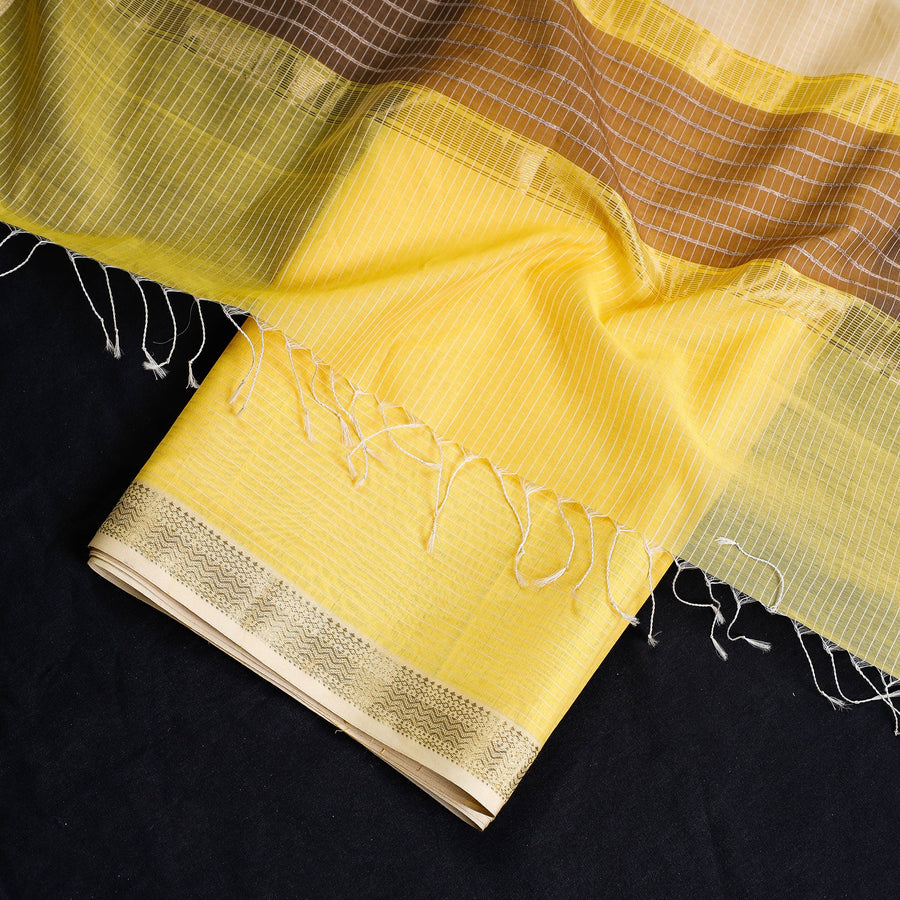 This exquisite maheshwari silk-cotton handloom stripe suit material set with zari border is skillfully handwoven in Maheshwar, a heritage town in India, using traditional techniques. The weaving traditional handloom weaving techniques passed down through generations of skilled artisans in Maheshwar. Its lightweight and sheer texture gives it an exquisite grace and elegance of its own. Ideal for crafting exquisite suits, this suit material exudes elegance and cultural richness.