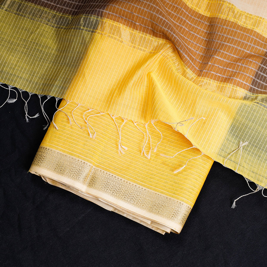 This exquisite maheshwari silk-cotton handloom stripe suit material set with zari border is skillfully handwoven in Maheshwar, a heritage town in India, using traditional techniques. The weaving traditional handloom weaving techniques passed down through generations of skilled artisans in Maheshwar. Its lightweight and sheer texture gives it an exquisite grace and elegance of its own. Ideal for crafting exquisite suits, this suit material exudes elegance and cultural richness.