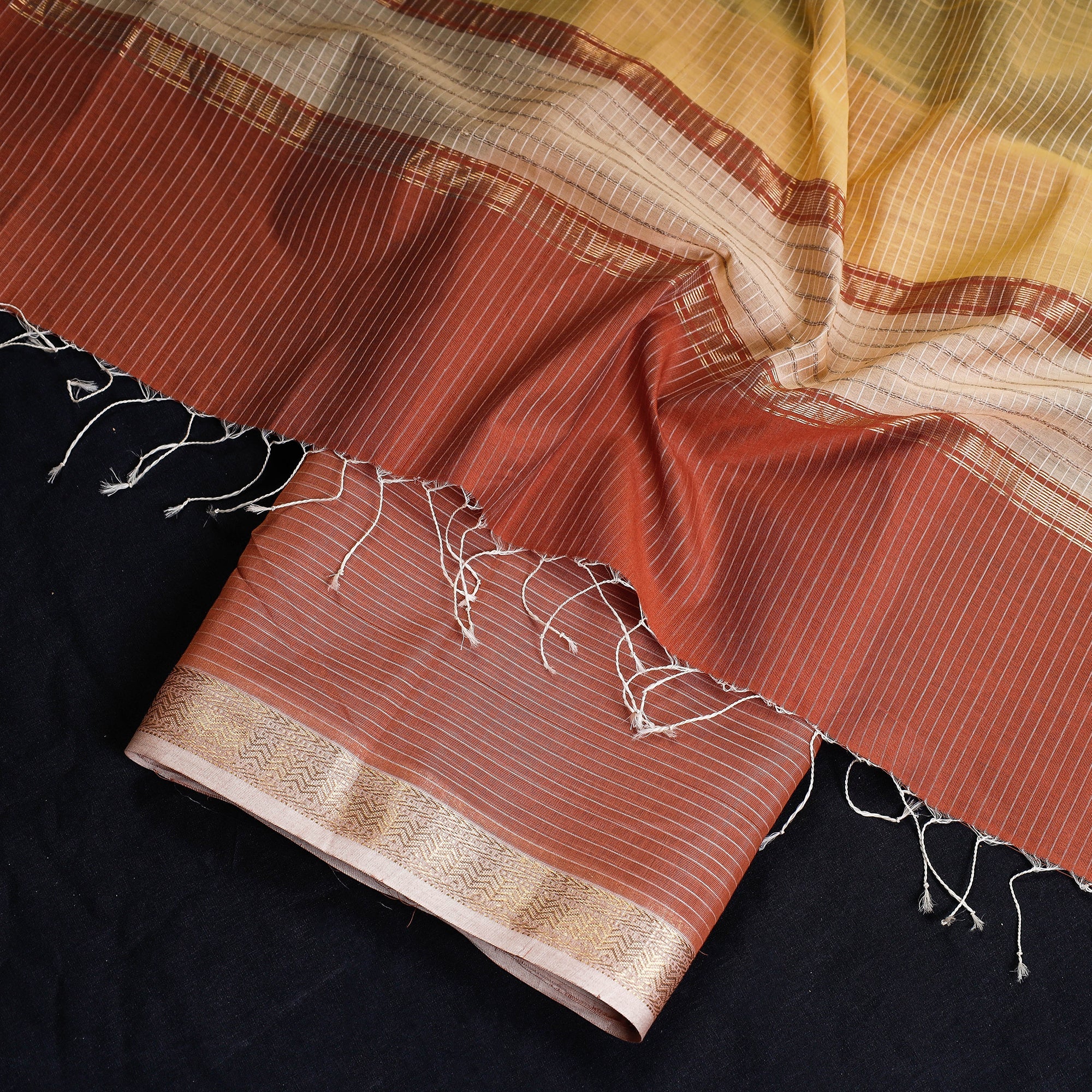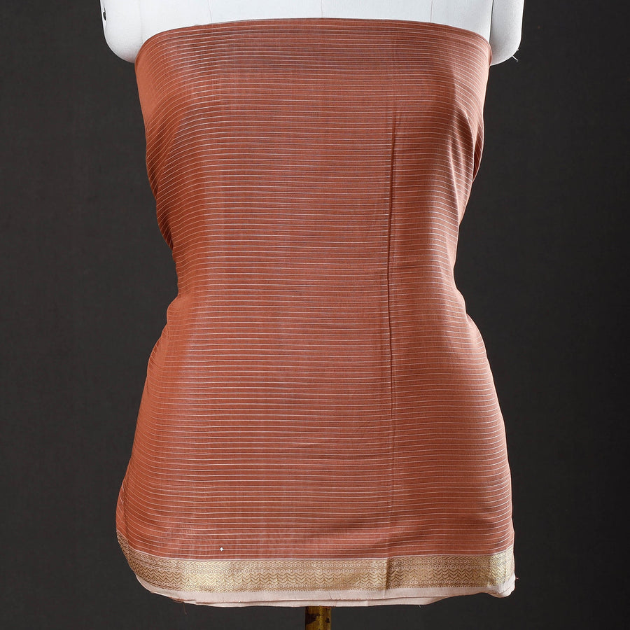 This exquisite maheshwari silk-cotton handloom stripe suit material set with zari border is skillfully handwoven in Maheshwar, a heritage town in India, using traditional techniques. The weaving traditional handloom weaving techniques passed down through generations of skilled artisans in Maheshwar. Its lightweight and sheer texture gives it an exquisite grace and elegance of its own. Ideal for crafting exquisite suits, this suit material exudes elegance and cultural richness.