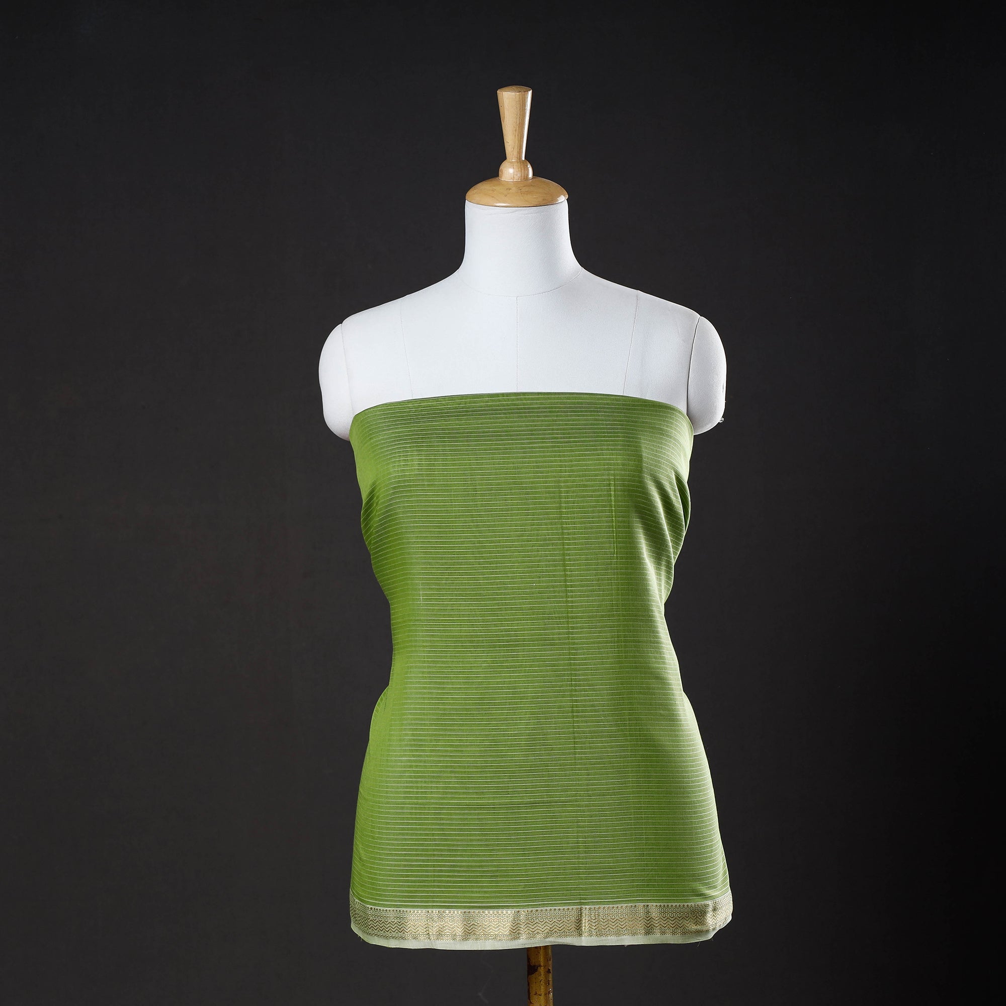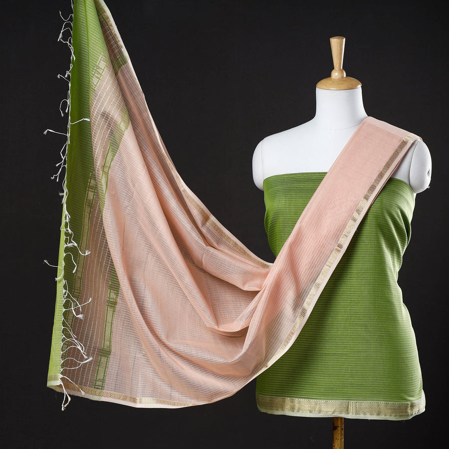 This exquisite maheshwari silk-cotton handloom stripe suit material set with zari border is skillfully handwoven in Maheshwar, a heritage town in India, using traditional techniques. The weaving traditional handloom weaving techniques passed down through generations of skilled artisans in Maheshwar. Its lightweight and sheer texture gives it an exquisite grace and elegance of its own. Ideal for crafting exquisite suits, this suit material exudes elegance and cultural richness.