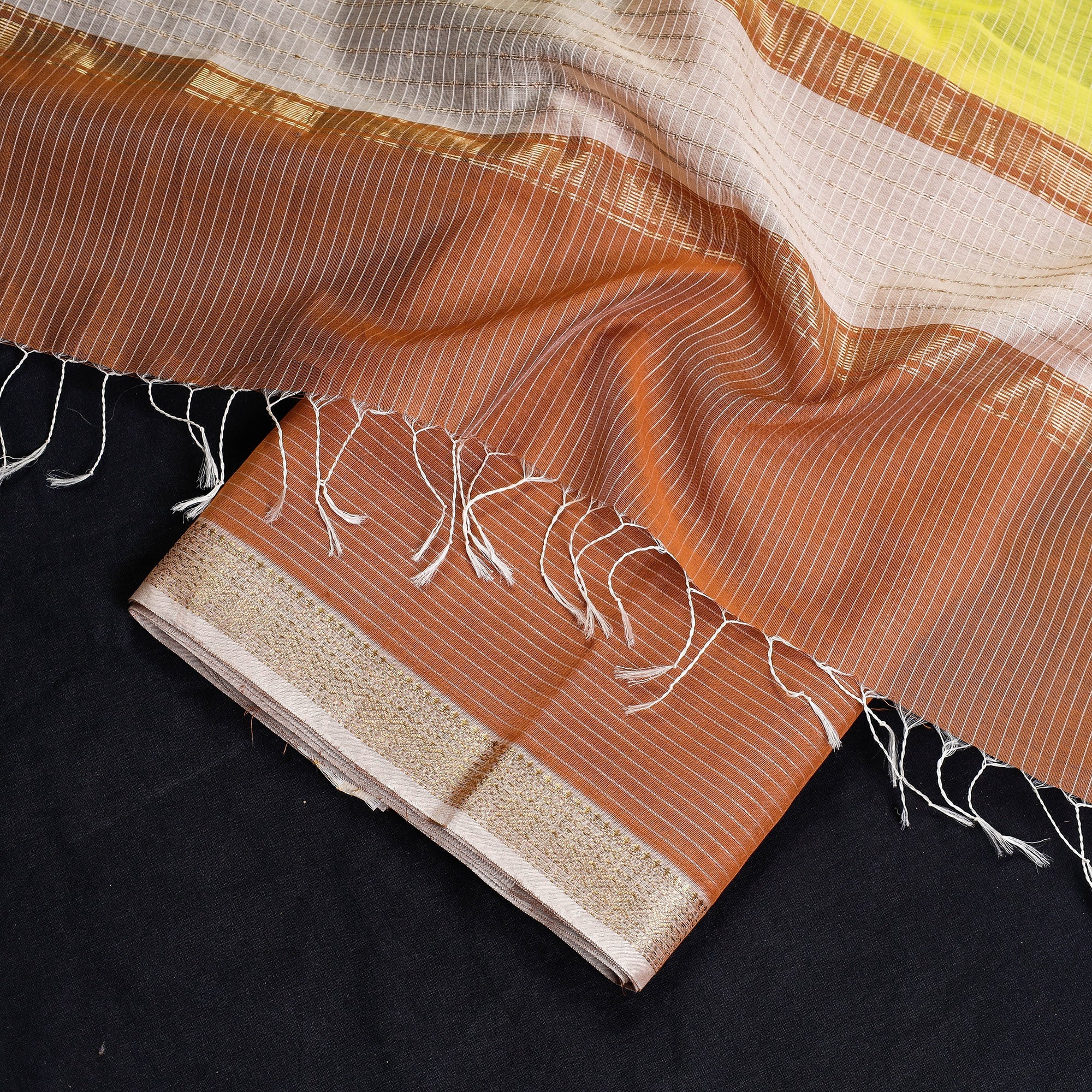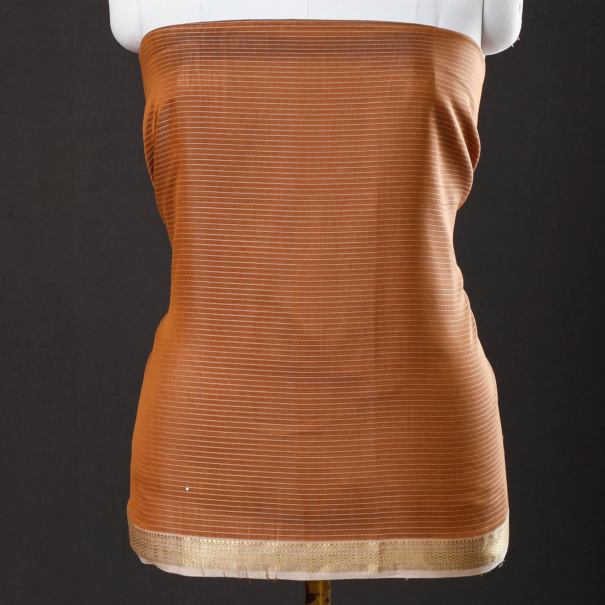 This exquisite maheshwari silk-cotton handloom stripe suit material set with zari border is skillfully handwoven in Maheshwar, a heritage town in India, using traditional techniques. The weaving traditional handloom weaving techniques passed down through generations of skilled artisans in Maheshwar. Its lightweight and sheer texture gives it an exquisite grace and elegance of its own. Ideal for crafting exquisite suits, this suit material exudes elegance and cultural richness.