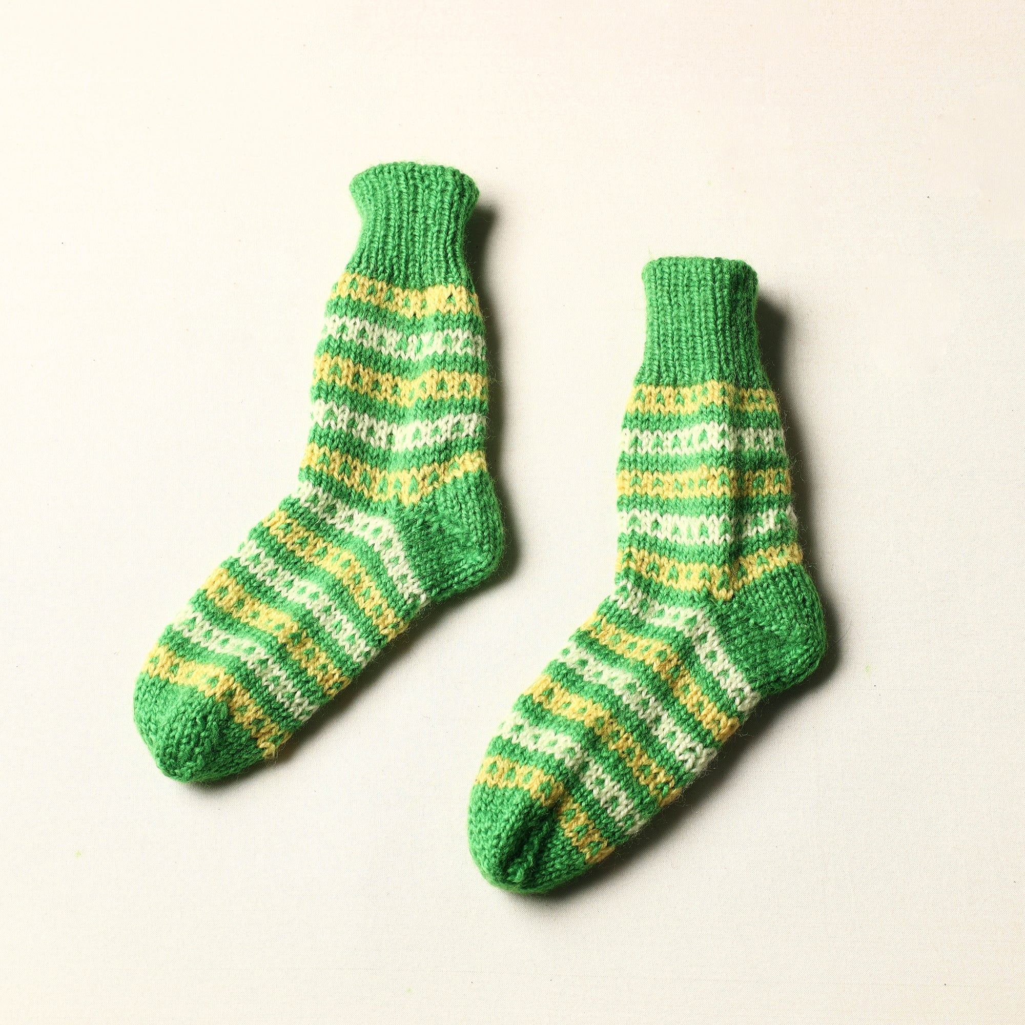 Fine quality hand-knitted green woolen socks by Kilmora. Made out of acrylic wool, these socks have been hand knitted by artisans in Buribana in Kumaon, Uttarakhand. Kilmora uses traditional techniques with contemporary design sensibilities to create a constantly evolving collection using acrylic wool or natural fibers and hand-spun wool.