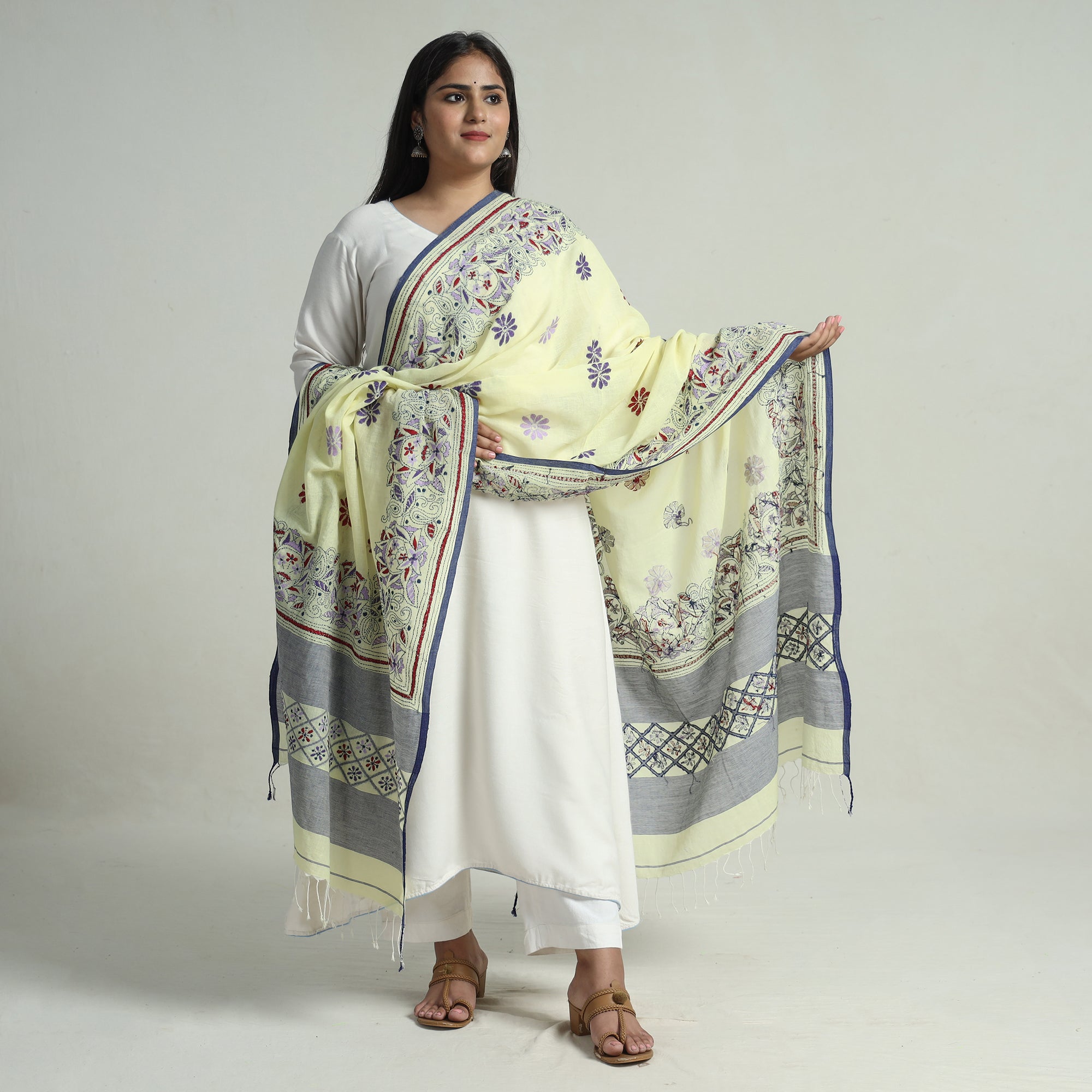 This exquisite kantha hand embroidery pure cotton handloom dupatta is made using Bengal's traditional craft technique of kantha done by master artisan Takdira Begum from Bolpur, West Bengal. Each stitch narrates the region's rich cultural heritage. This dupatta is perfect for both casual and formal wear, it's a versatile addition to your wardrobe.