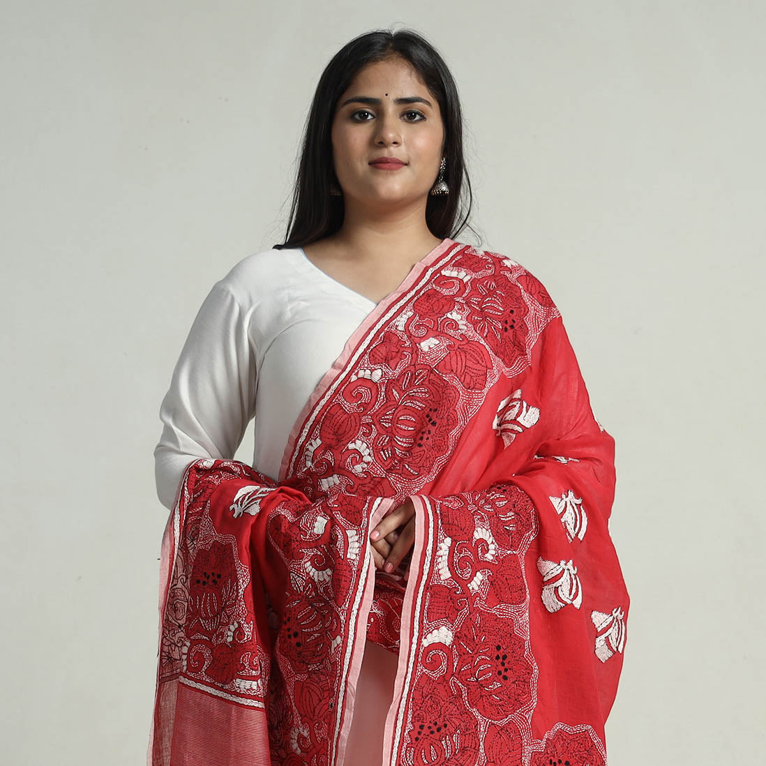 This exquisite kantha hand embroidery pure cotton handloom dupatta is made using Bengal's traditional craft technique of kantha done by master artisan Takdira Begum from Bolpur, West Bengal. Each stitch narrates the region's rich cultural heritage. This dupatta is perfect for both casual and formal wear, it's a versatile addition to your wardrobe.