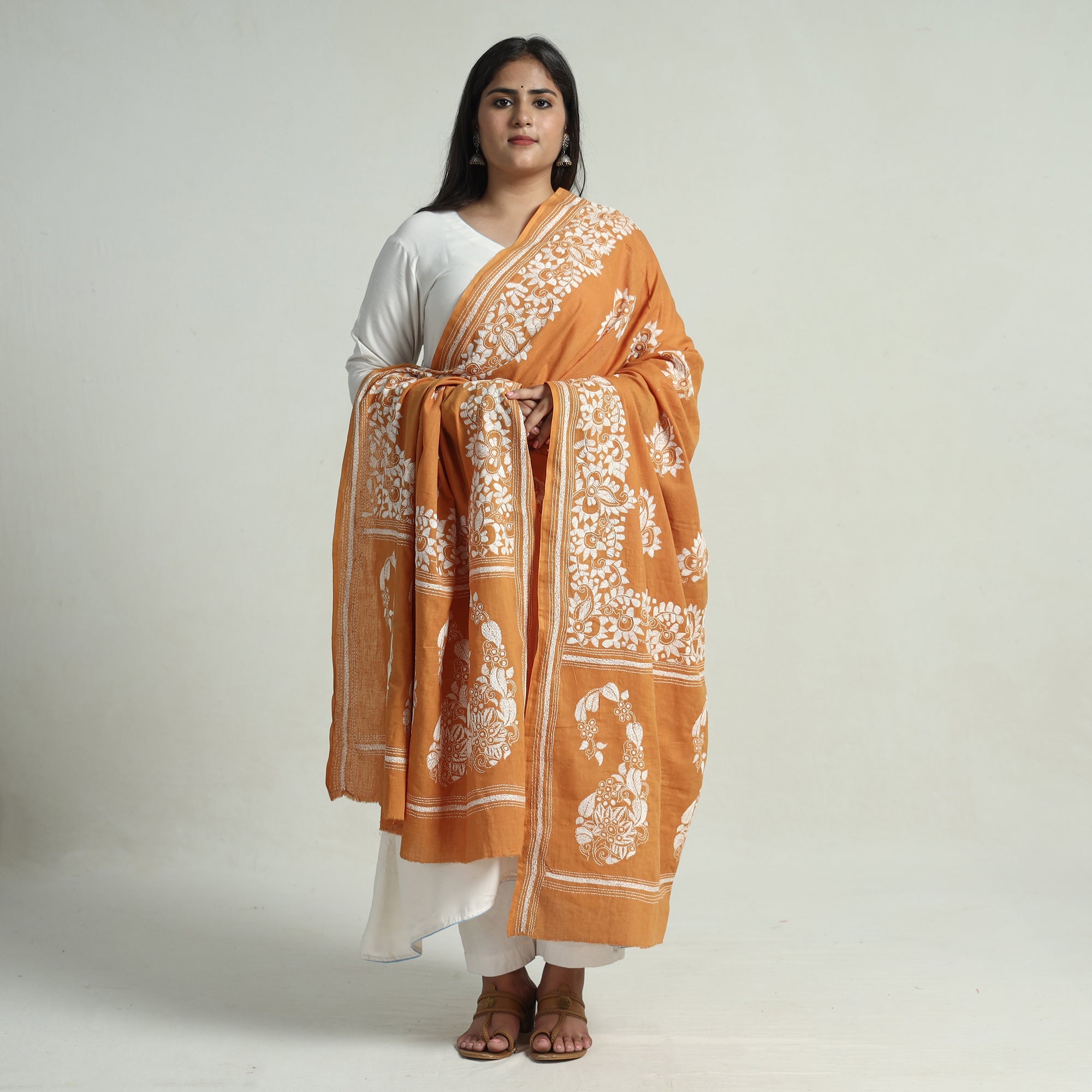 This exquisite kantha hand embroidery pure cotton handloom dupatta is made using Bengal's traditional craft technique of kantha done by master artisan Takdira Begum from Bolpur, West Bengal. Each stitch narrates the region's rich cultural heritage. This dupatta is perfect for both casual and formal wear, it's a versatile addition to your wardrobe.