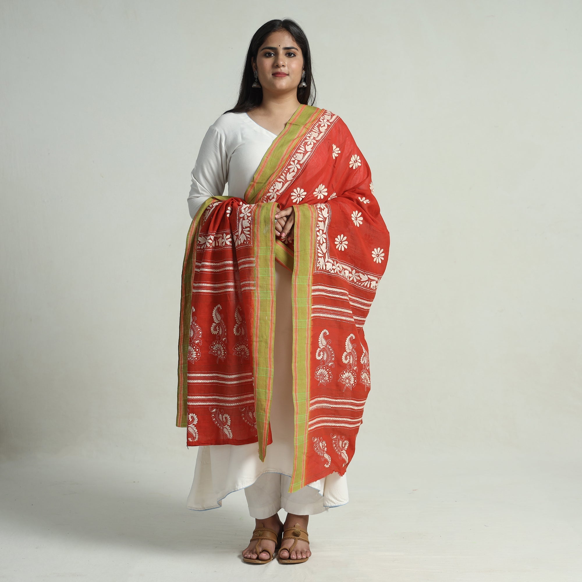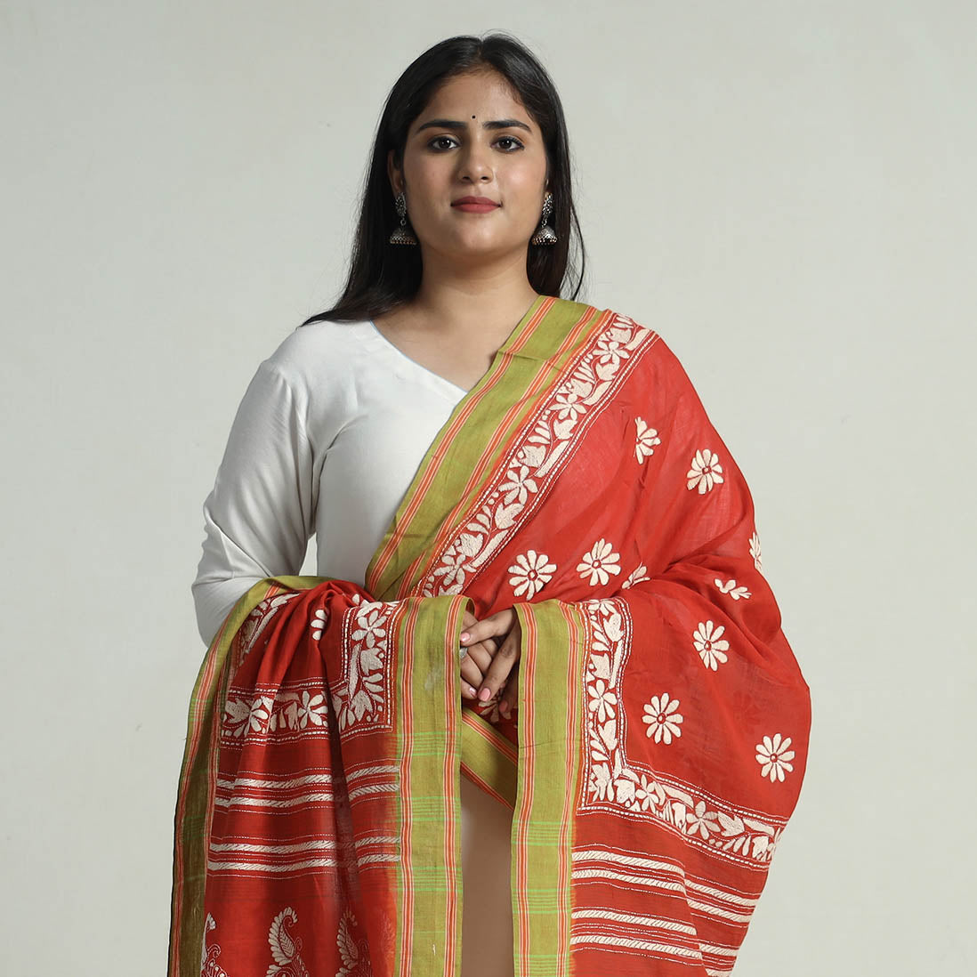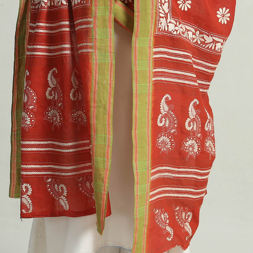 This exquisite kantha hand embroidery pure cotton handloom dupatta is made using Bengal's traditional craft technique of kantha done by master artisan Takdira Begum from Bolpur, West Bengal. Each stitch narrates the region's rich cultural heritage. This dupatta is perfect for both casual and formal wear, it's a versatile addition to your wardrobe.