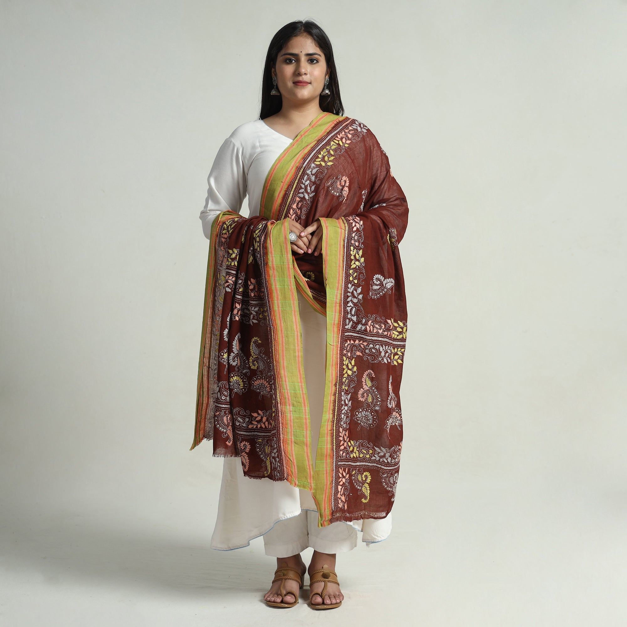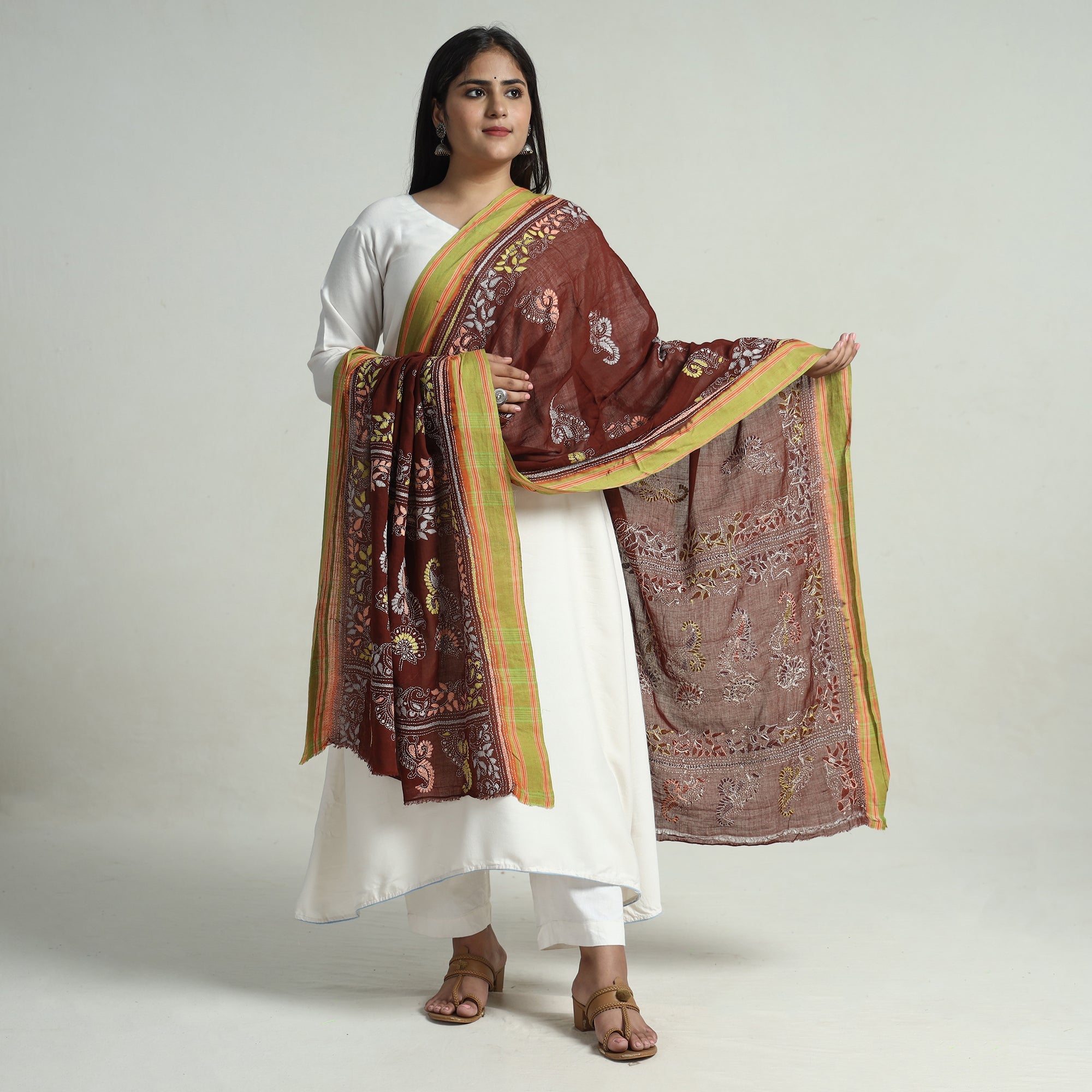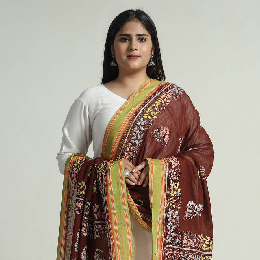 This exquisite kantha hand embroidery pure cotton handloom dupatta is made using Bengal's traditional craft technique of kantha done by master artisan Takdira Begum from Bolpur, West Bengal. Each stitch narrates the region's rich cultural heritage. This dupatta is perfect for both casual and formal wear, it's a versatile addition to your wardrobe.