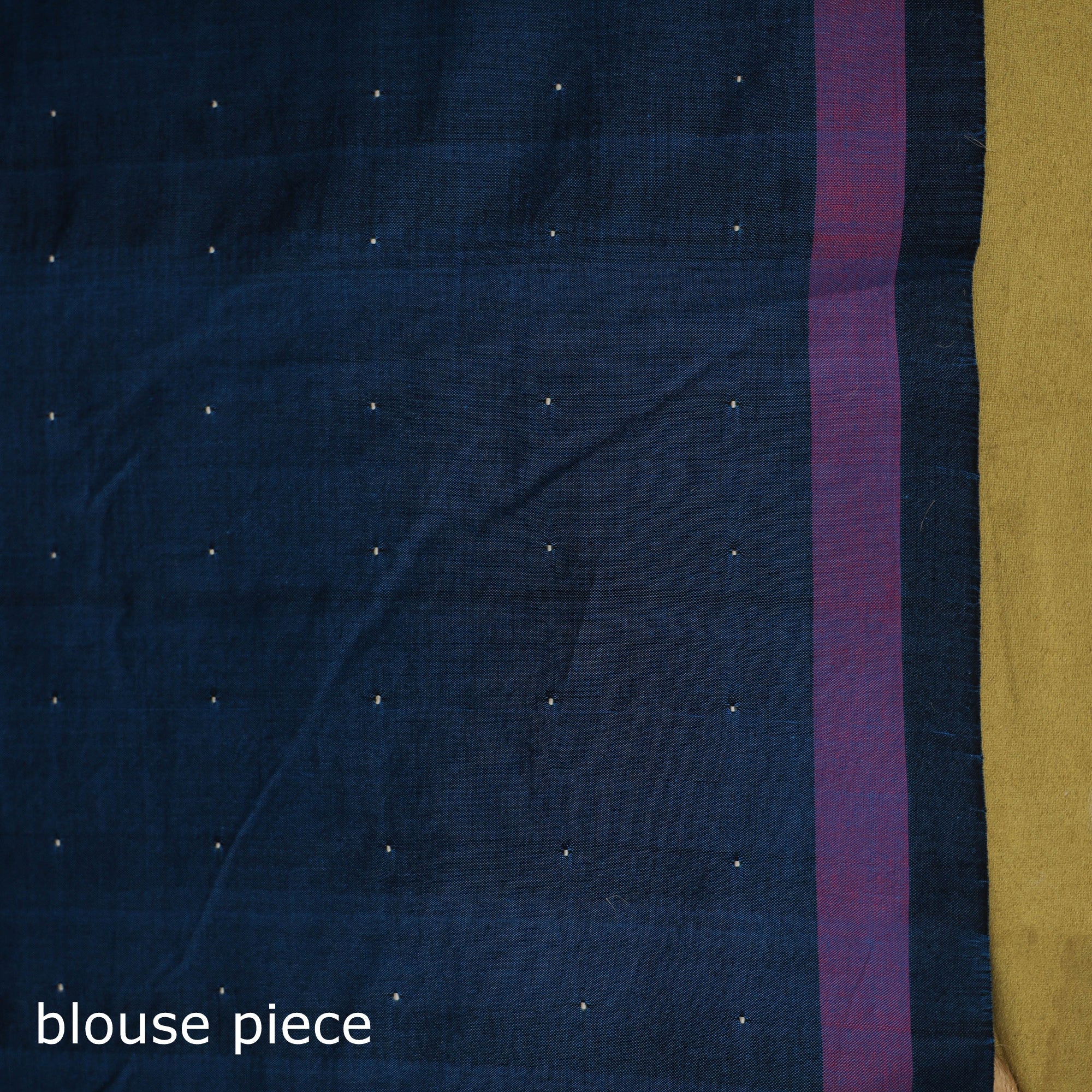 This exquisite blue handloom cotton saree made using a weaving technique called tangaliya. Tangaliya weaving, also known as Daana weaving is practiced in Surendranagar district of Gujarat. Mainly practiced by the Dangasia community, this form of weaving requires high skill level and an eye for accuracy. Tangaliya is a labor-intensive and painstaking process. Tiny dots of extra weft are twisted around a number of warp threads, giving an effect of bead embroidery to the fabric. Perfect for special occasions, drape this saree gracefully for a timeless and elegant look.