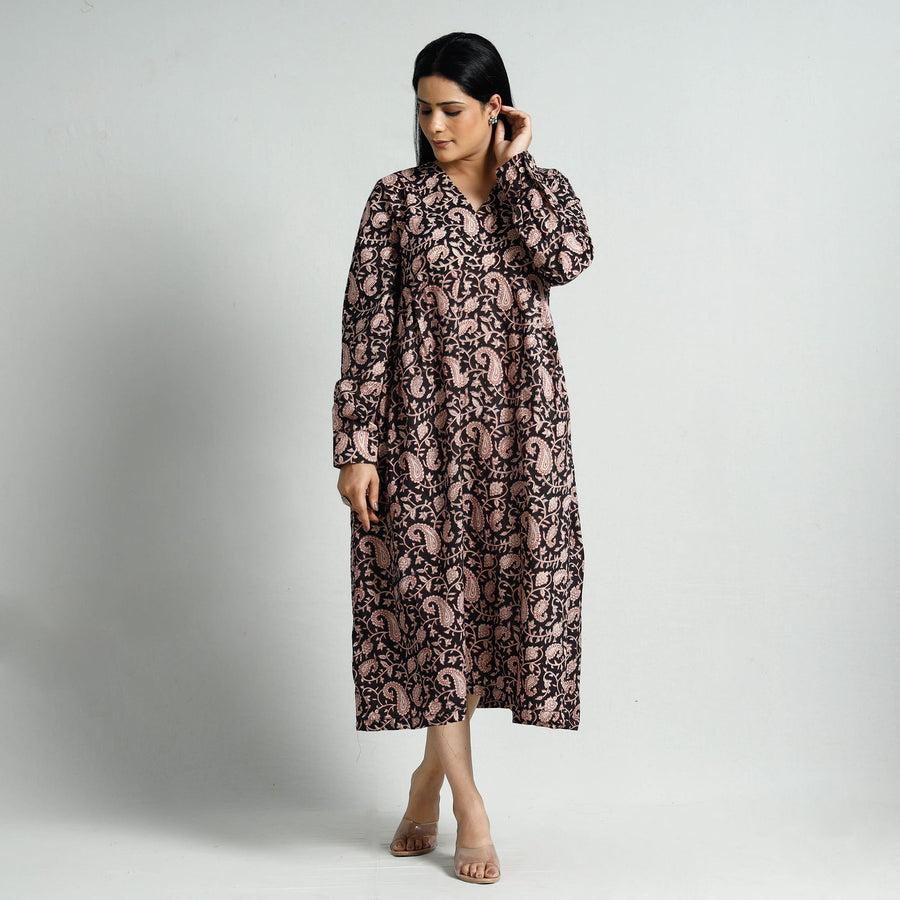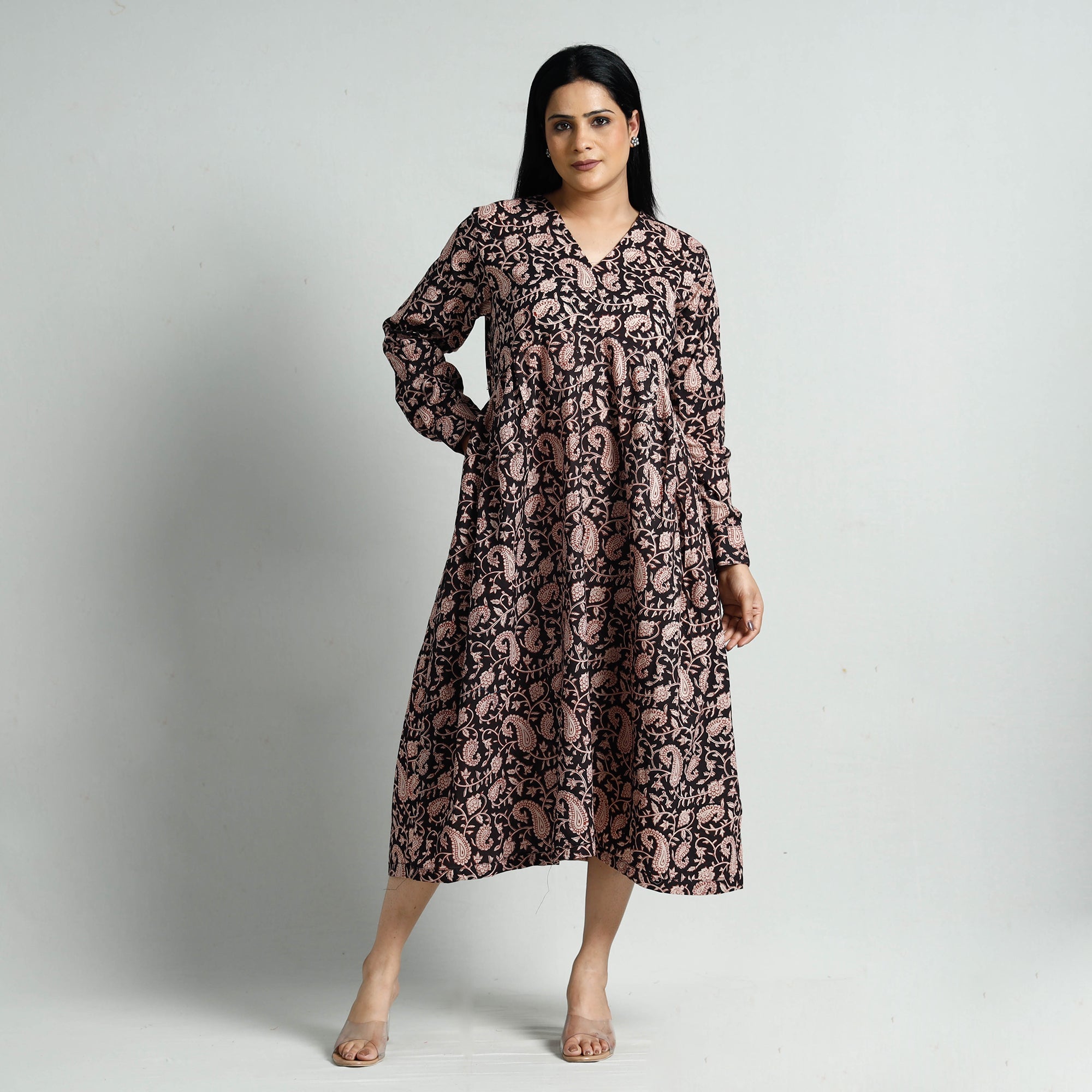 This bagru hand block printed cotton flared dress is a perfect blend of style and comfort. This dress is crafted from naturally dyed cotton fabric through the traditional mud resist process by using hand-carved wooden blocks practised in Bagru, Rajasthan, ensuring a comfortable feel against your skin. This dress features intricate patterns created by hand-carved wooden blocks. This cotton dress makes you comfortable all day long. This dress is perfect for your daily outing and for a special occasion.