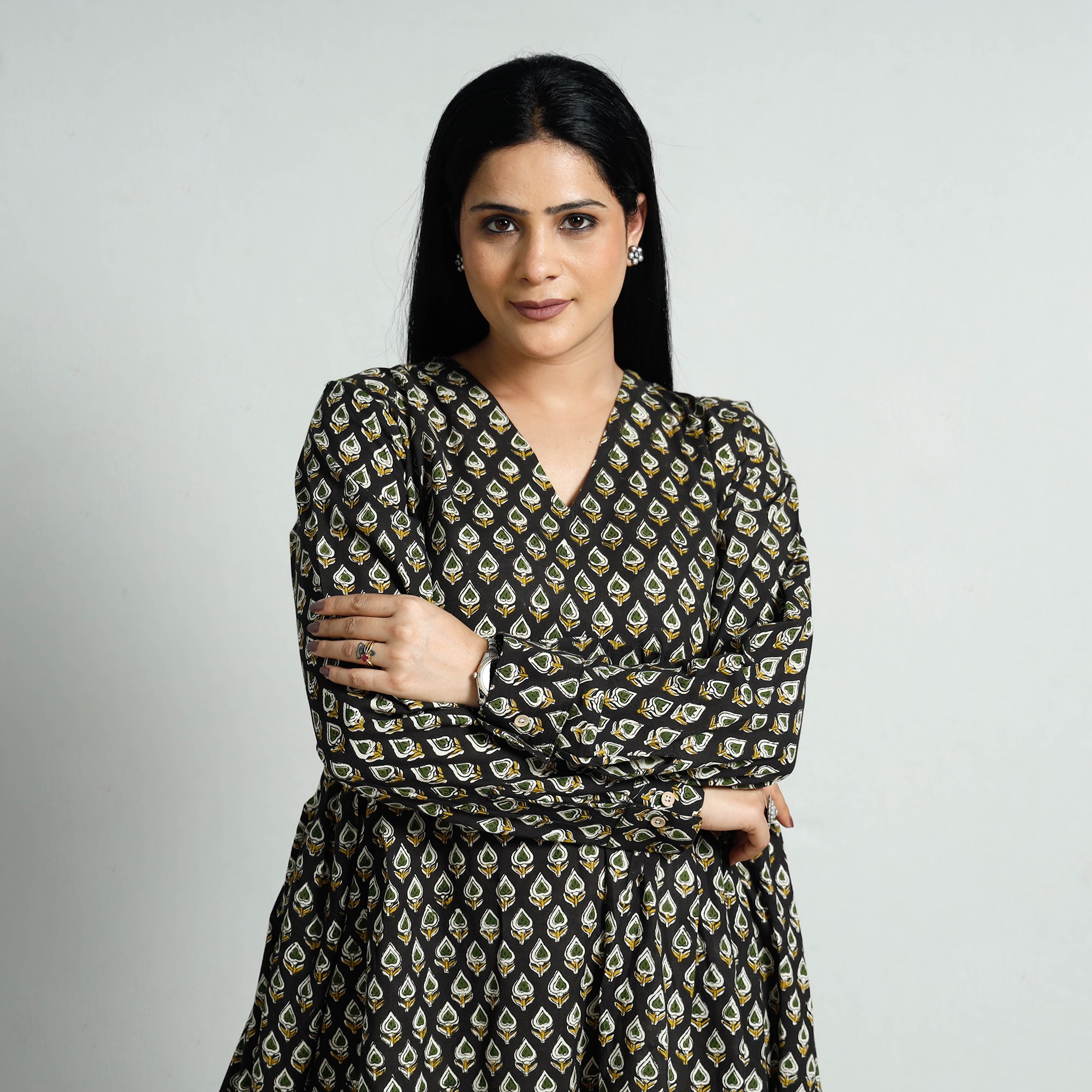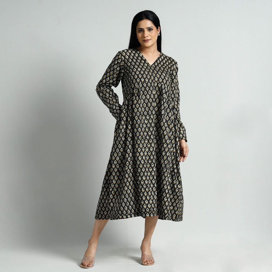 This bagru hand block printed cotton flared dress is a perfect blend of style and comfort. This dress is crafted from naturally dyed cotton fabric through the traditional mud resist process by using hand-carved wooden blocks practised in Bagru, Rajasthan, ensuring a comfortable feel against your skin. This dress features intricate patterns created by hand-carved wooden blocks. This cotton dress makes you comfortable all day long. This dress is perfect for your daily outing and for a special occasion.